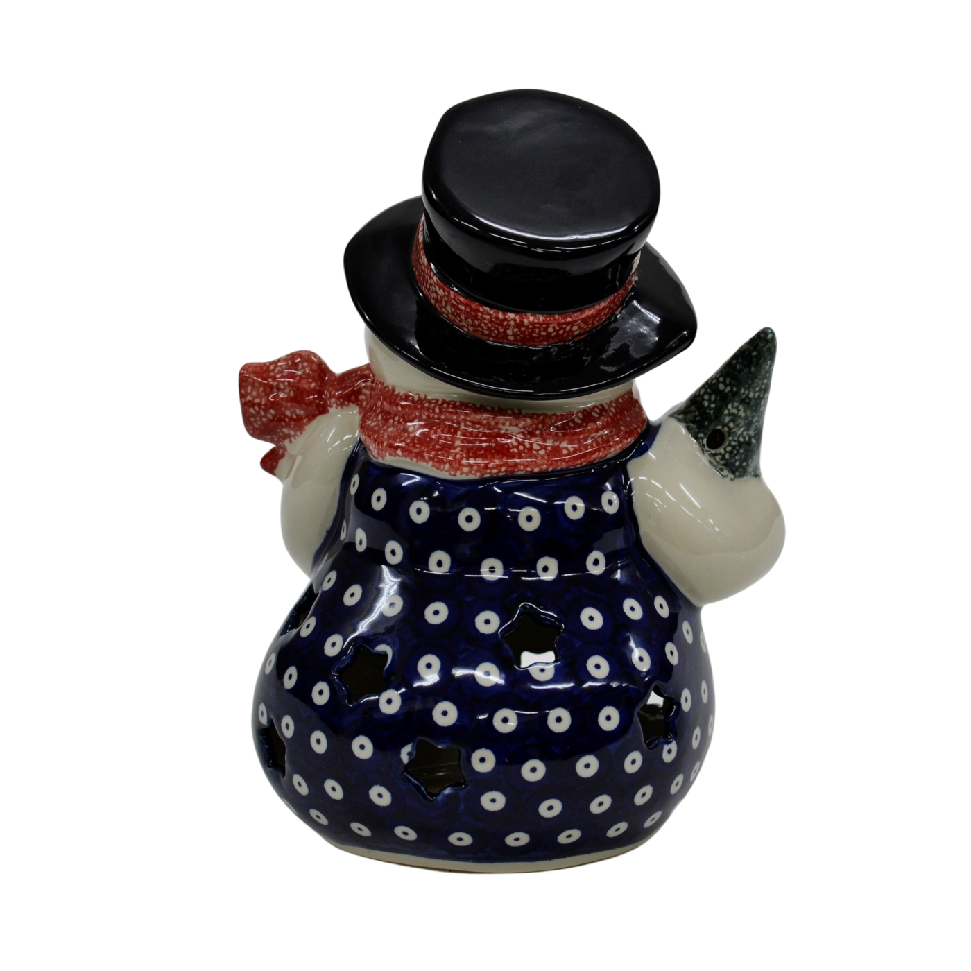 Big, huge with a Christmas tree, a beautiful hat and a bird on it, looking hopefully at more snowflakes. And this snowman has holes from which the beautiful glow of a candle will float inside your home. It was made in a traditional way for ceramics from Bolesławiec.