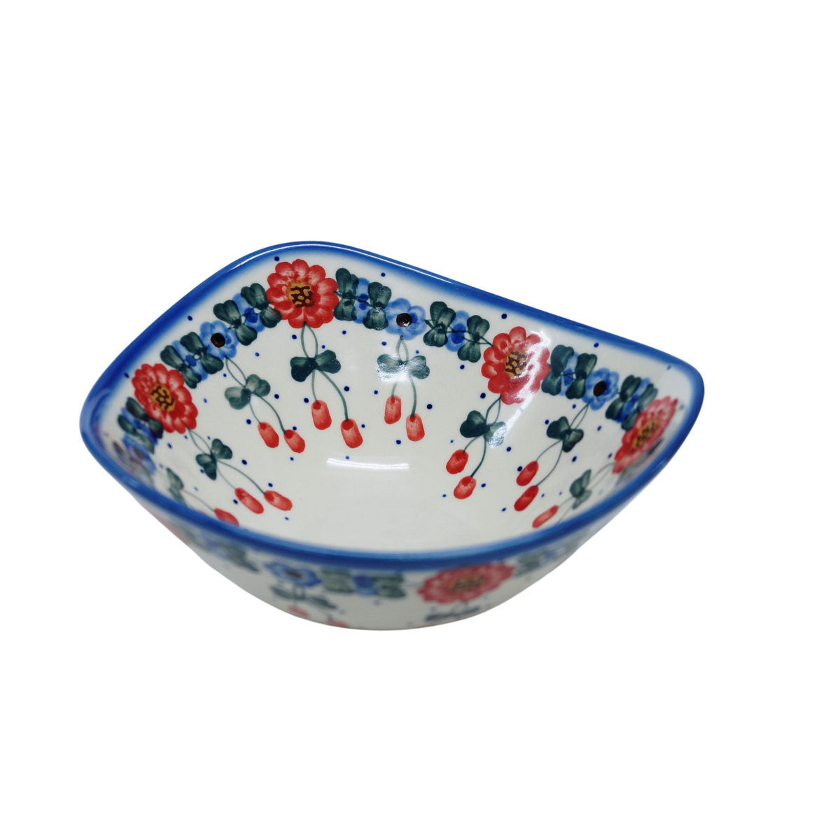 An original product of Bolesławiec ceramics - the Nina ceramic bowl small. Hand-decorated stoneware bowl of irregular shape, perfect for serving and storing food. Let your prepared dish be served beautifully and taste exquisitely thanks to the artistic Bolesławiec pottery dishes from the family manufactory, CERAMIKA ANDY, hand-decorated under glaze.