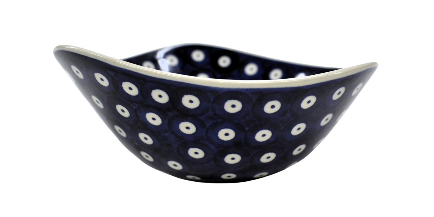 An original product of Bolesławiec ceramics - the Nina ceramic bowl small. Hand-decorated stoneware bowl of irregular shape, perfect for serving and storing food. Let your prepared dish be served beautifully and taste exquisitely thanks to the artistic Bolesławiec pottery dishes from the family manufactory, CERAMIKA ANDY, hand-decorated under glaze.