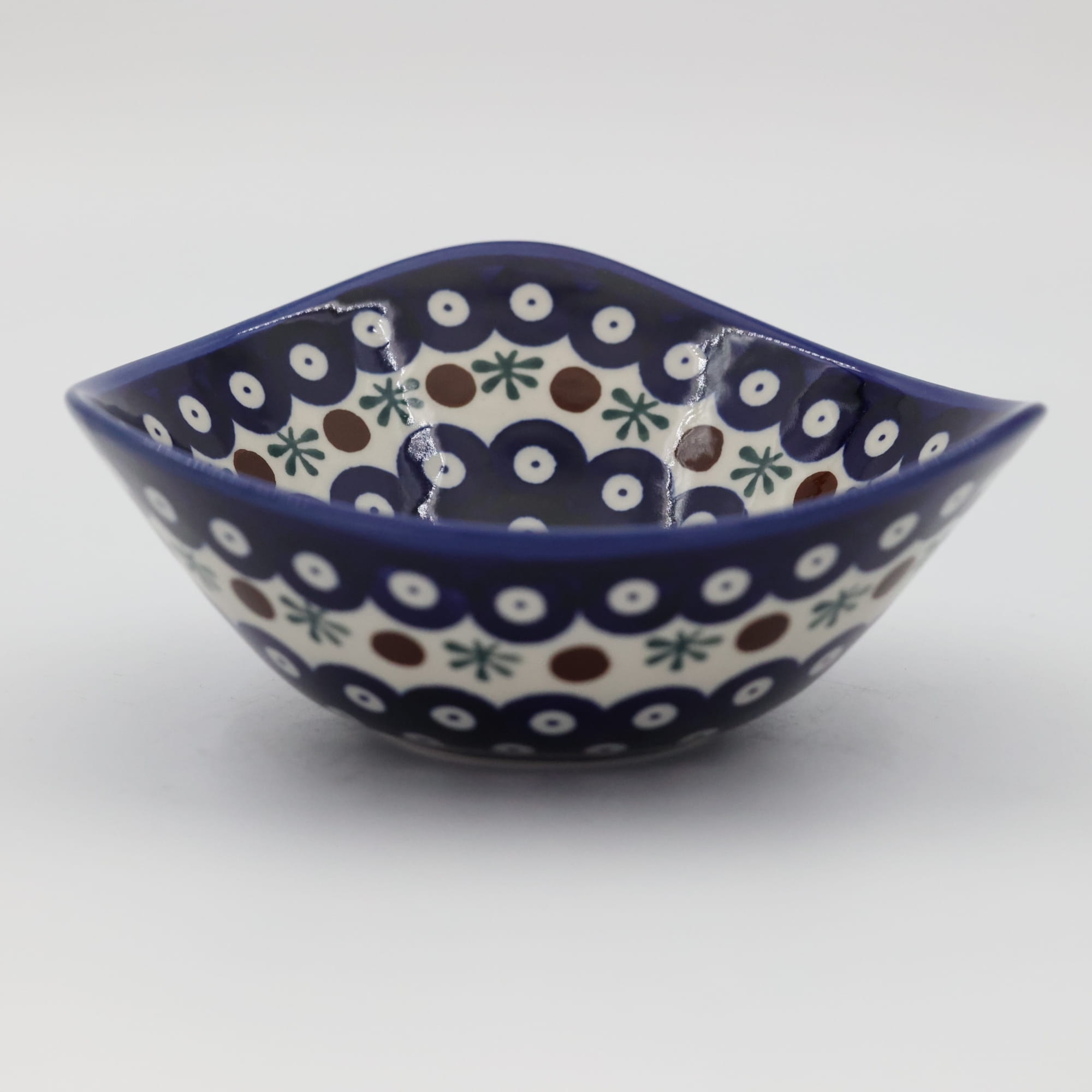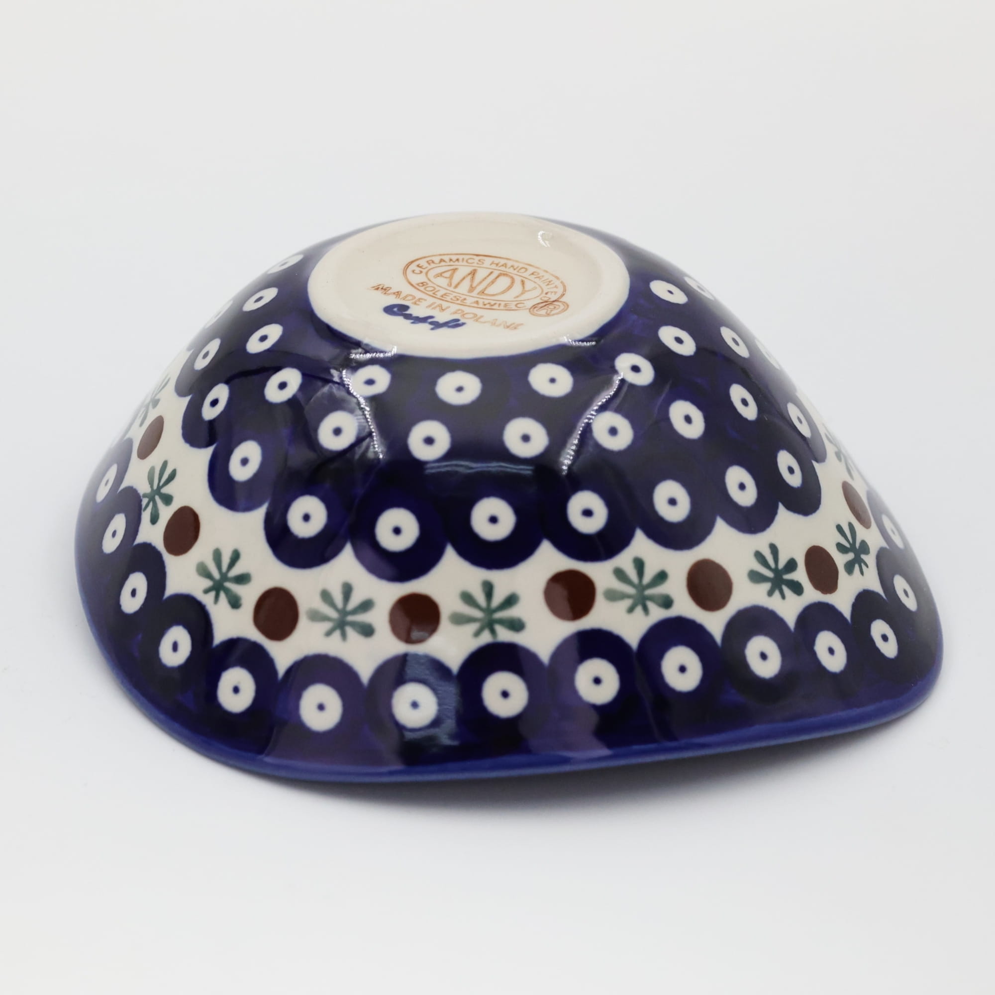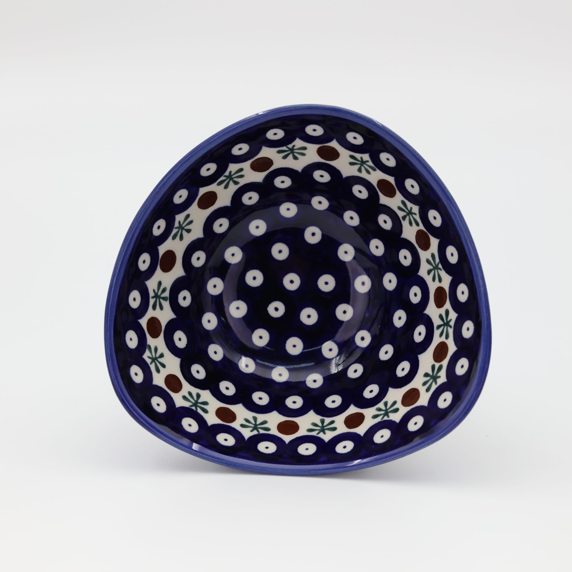 An original product of Bolesławiec ceramics - the Nina ceramic bowl small. Hand-decorated stoneware bowl of irregular shape, perfect for serving and storing food. Let your prepared dish be served beautifully and taste exquisitely thanks to the artistic Bolesławiec pottery dishes from the family manufactory, CERAMIKA ANDY, hand-decorated under glaze.
