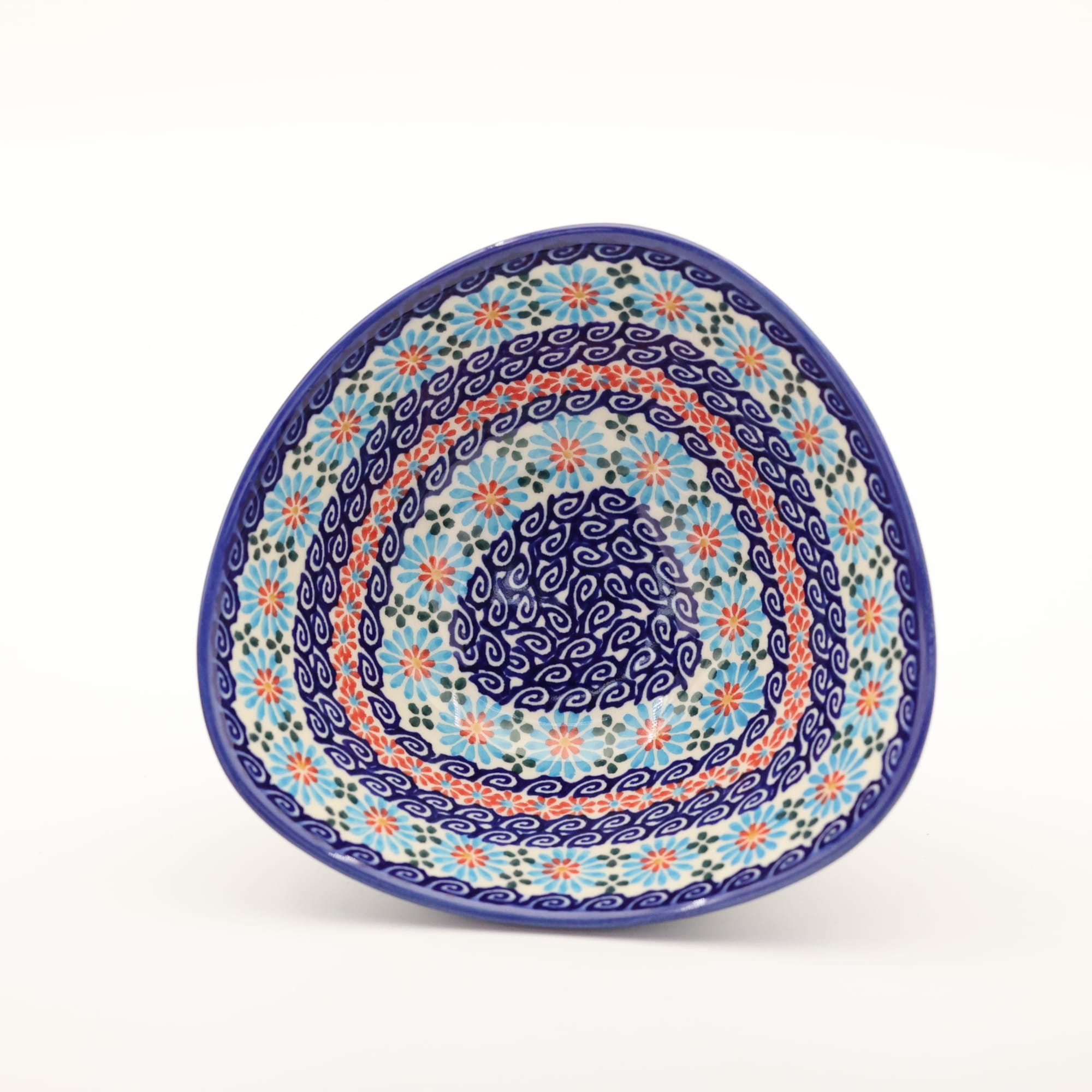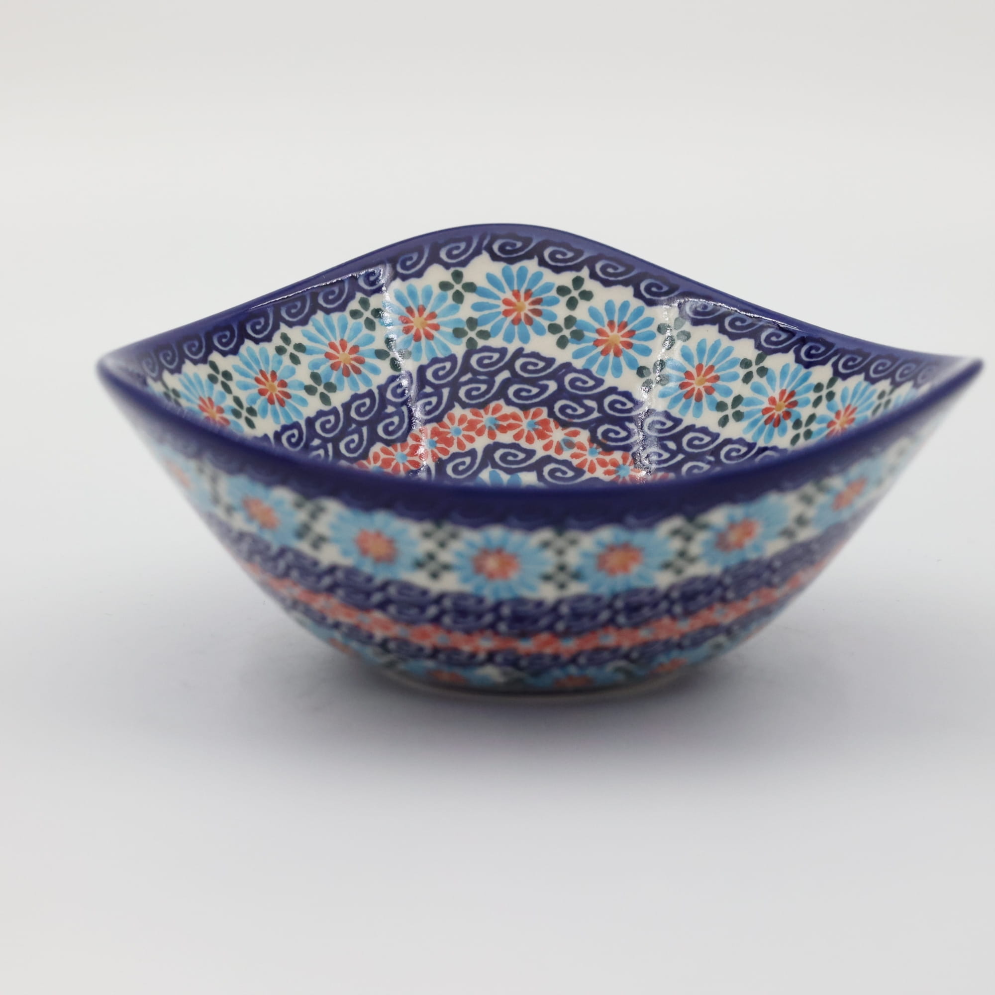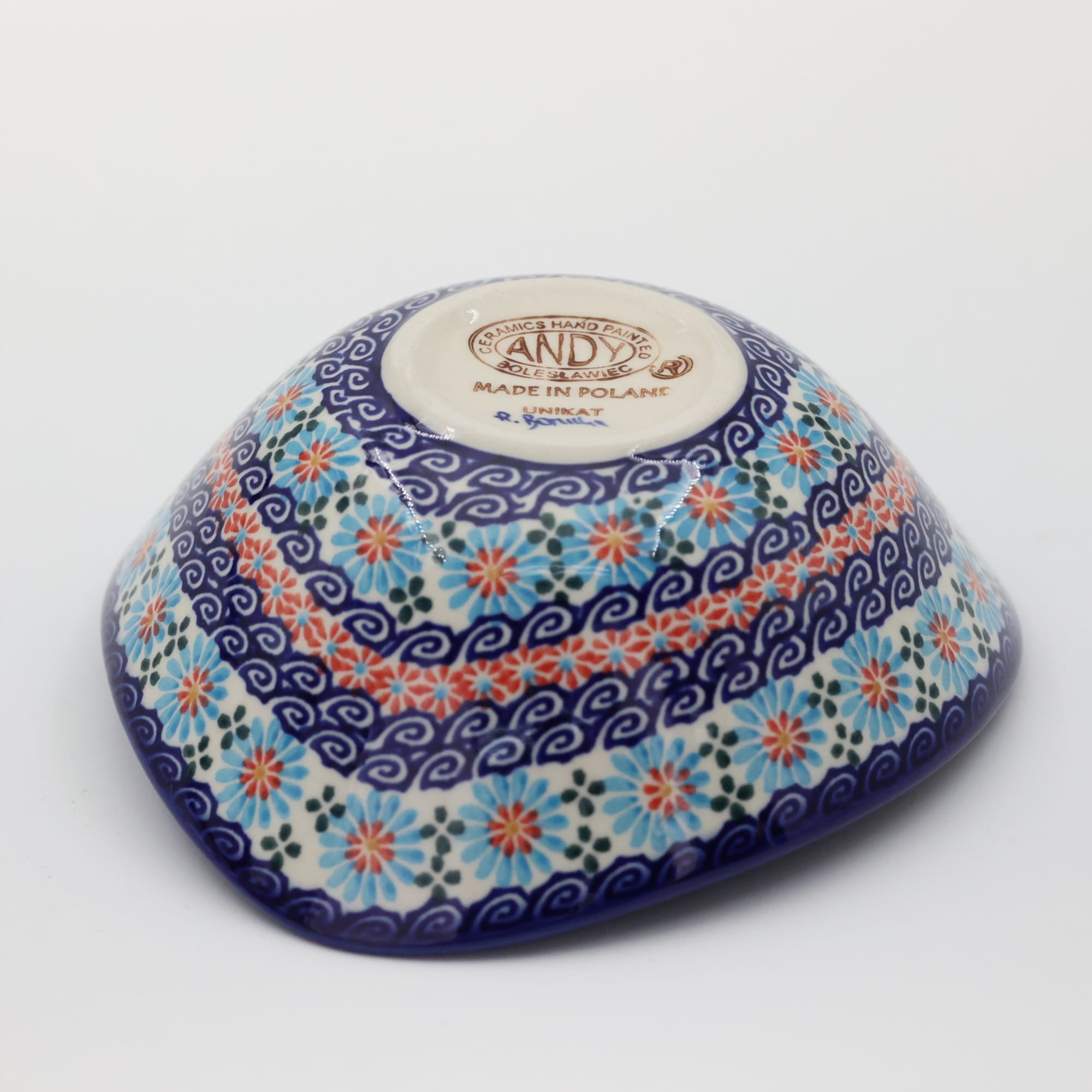 An original product of Bolesławiec ceramics - the Nina ceramic bowl small. Hand-decorated stoneware bowl of irregular shape, perfect for serving and storing food. Let your prepared dish be served beautifully and taste exquisitely thanks to the artistic Bolesławiec pottery dishes from the family manufactory, CERAMIKA ANDY, hand-decorated under glaze.