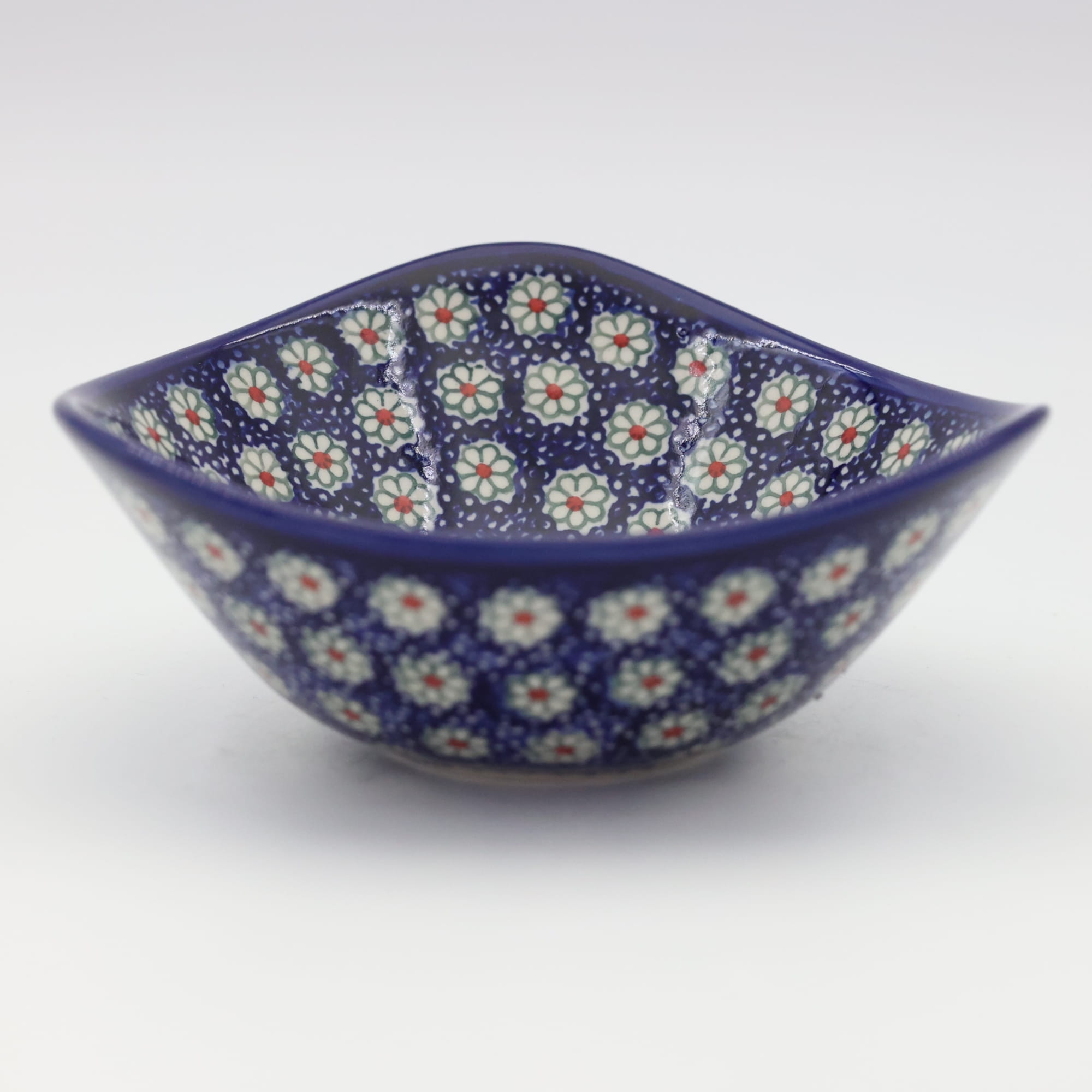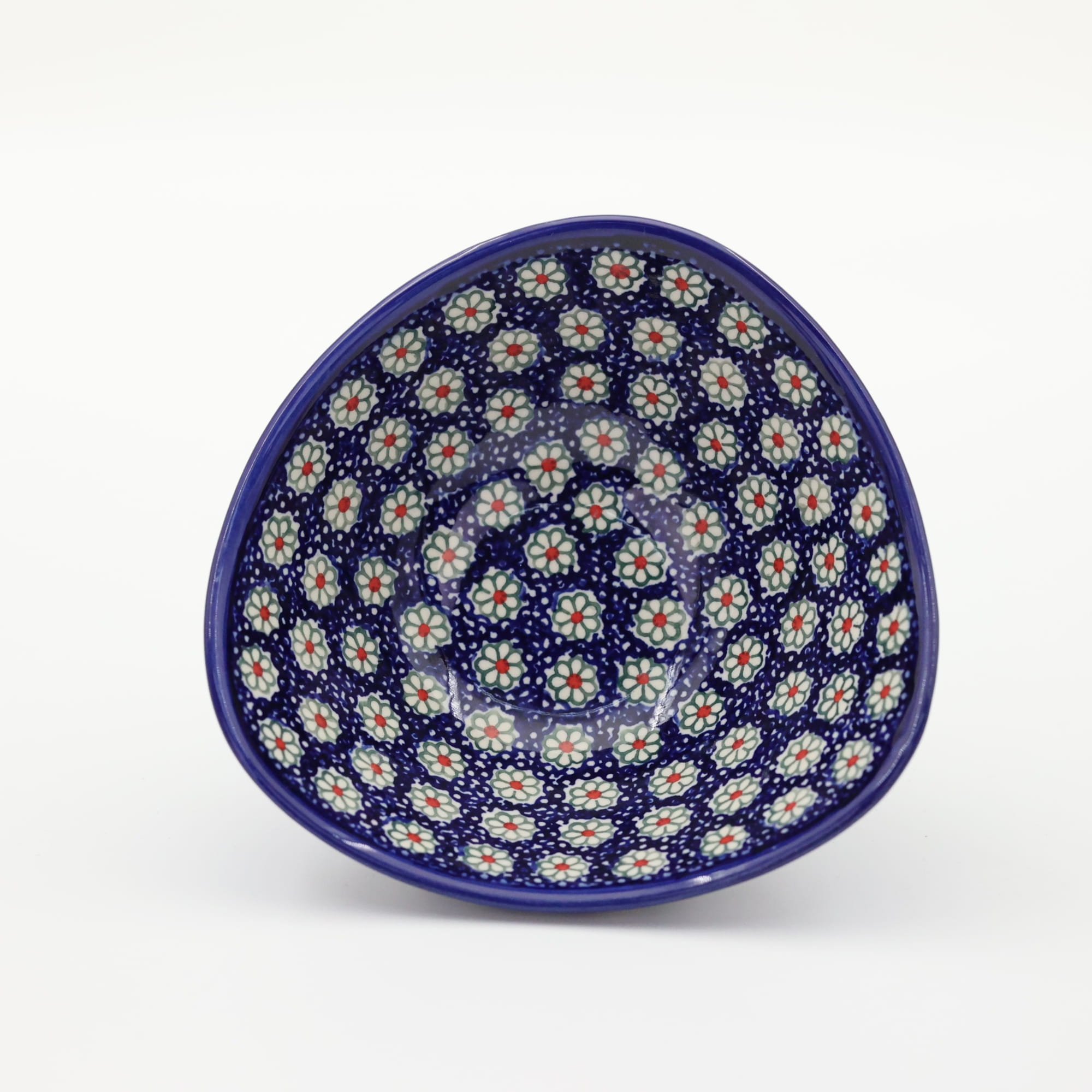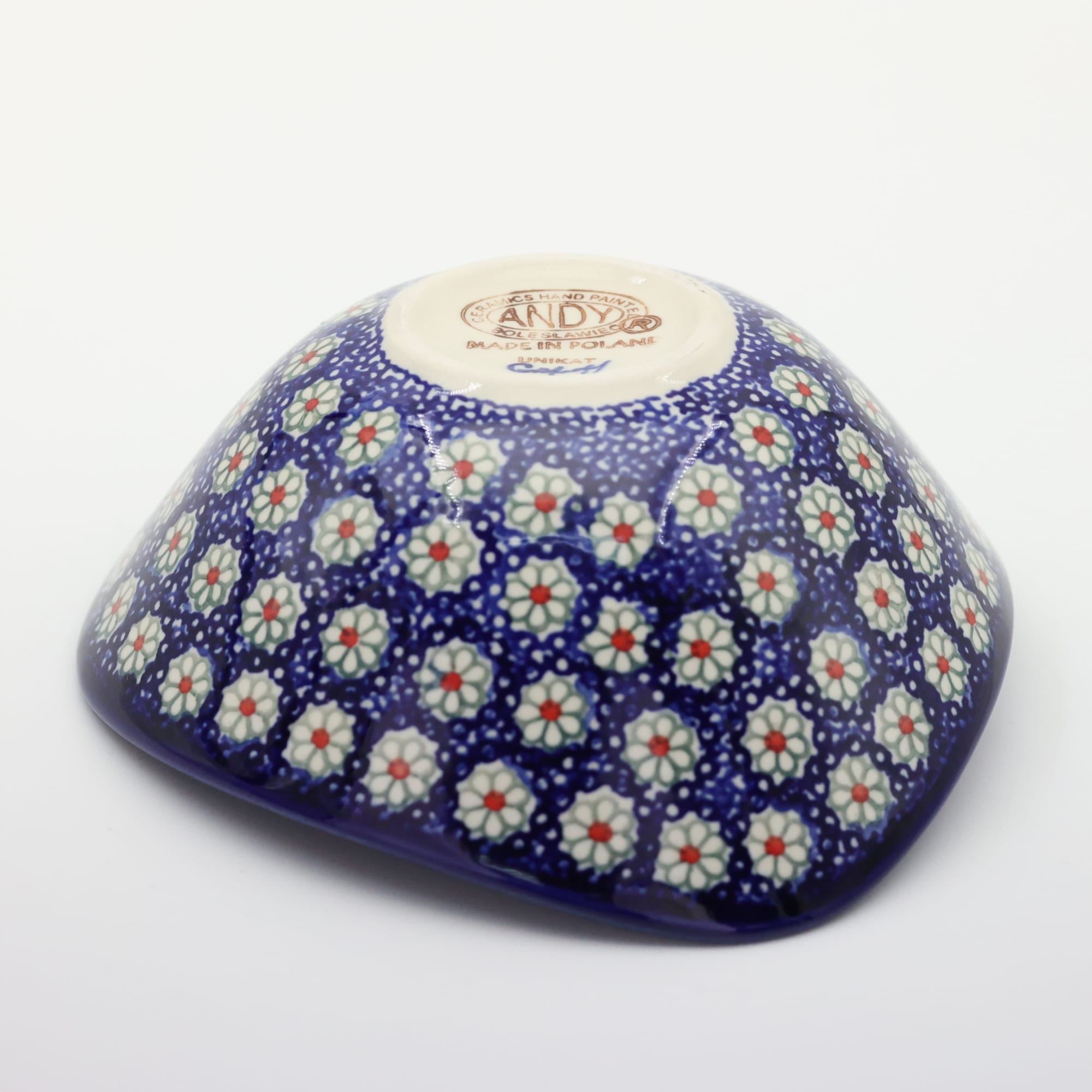 An original product of Bolesławiec ceramics - the Nina ceramic bowl small. Hand-decorated stoneware bowl of irregular shape, perfect for serving and storing food. Let your prepared dish be served beautifully and taste exquisitely thanks to the artistic Bolesławiec pottery dishes from the family manufactory, CERAMIKA ANDY, hand-decorated under glaze.