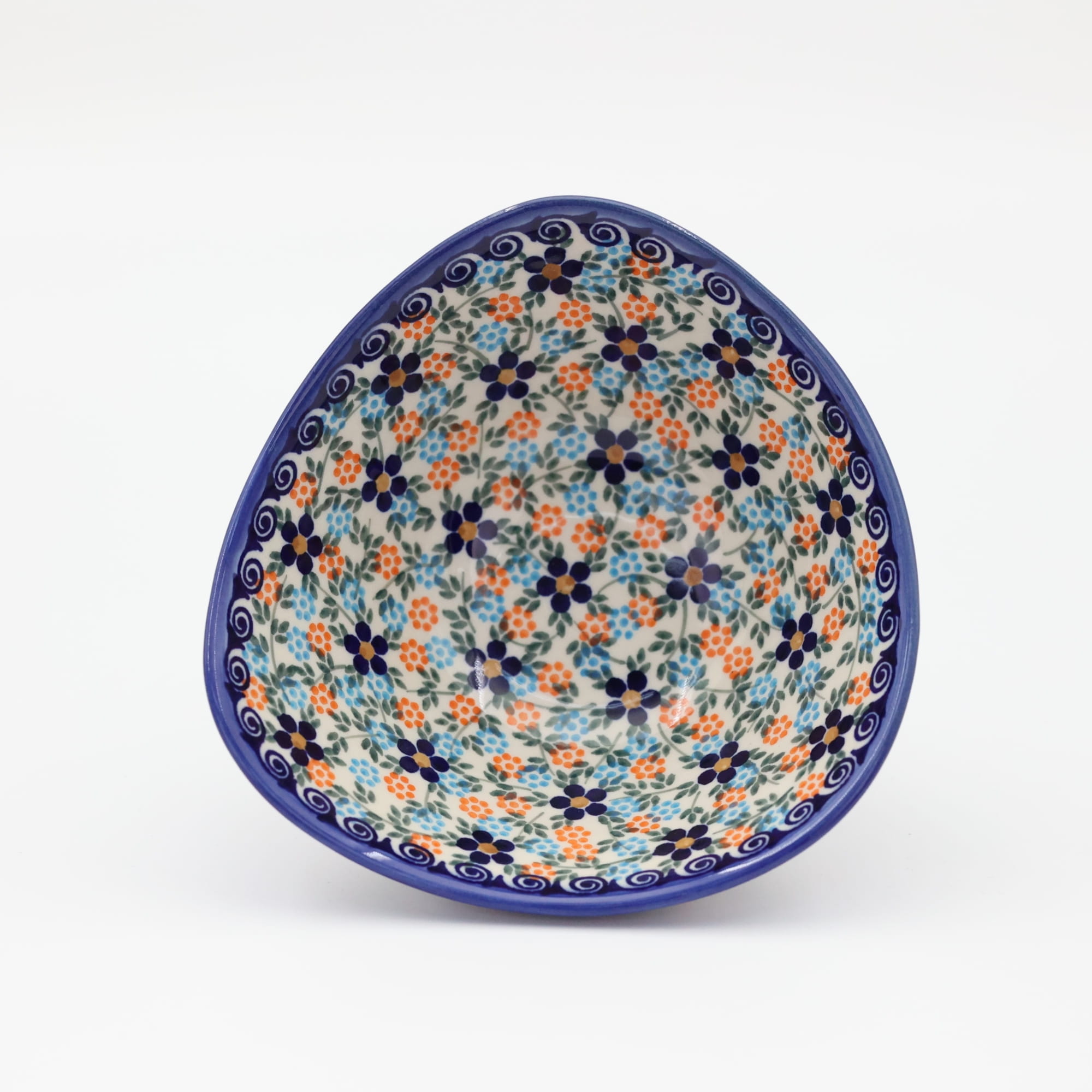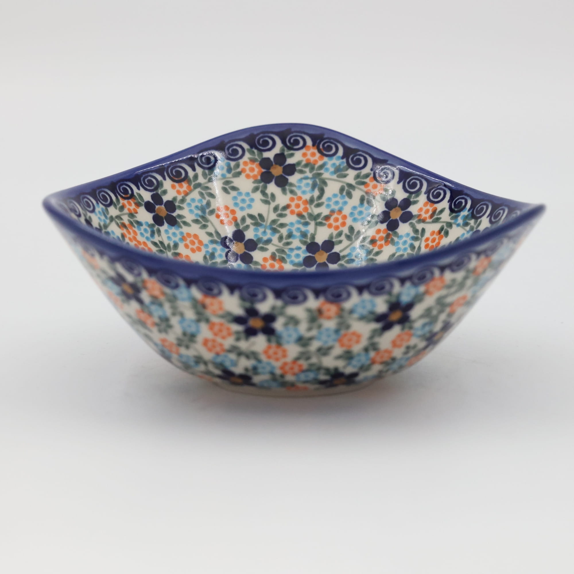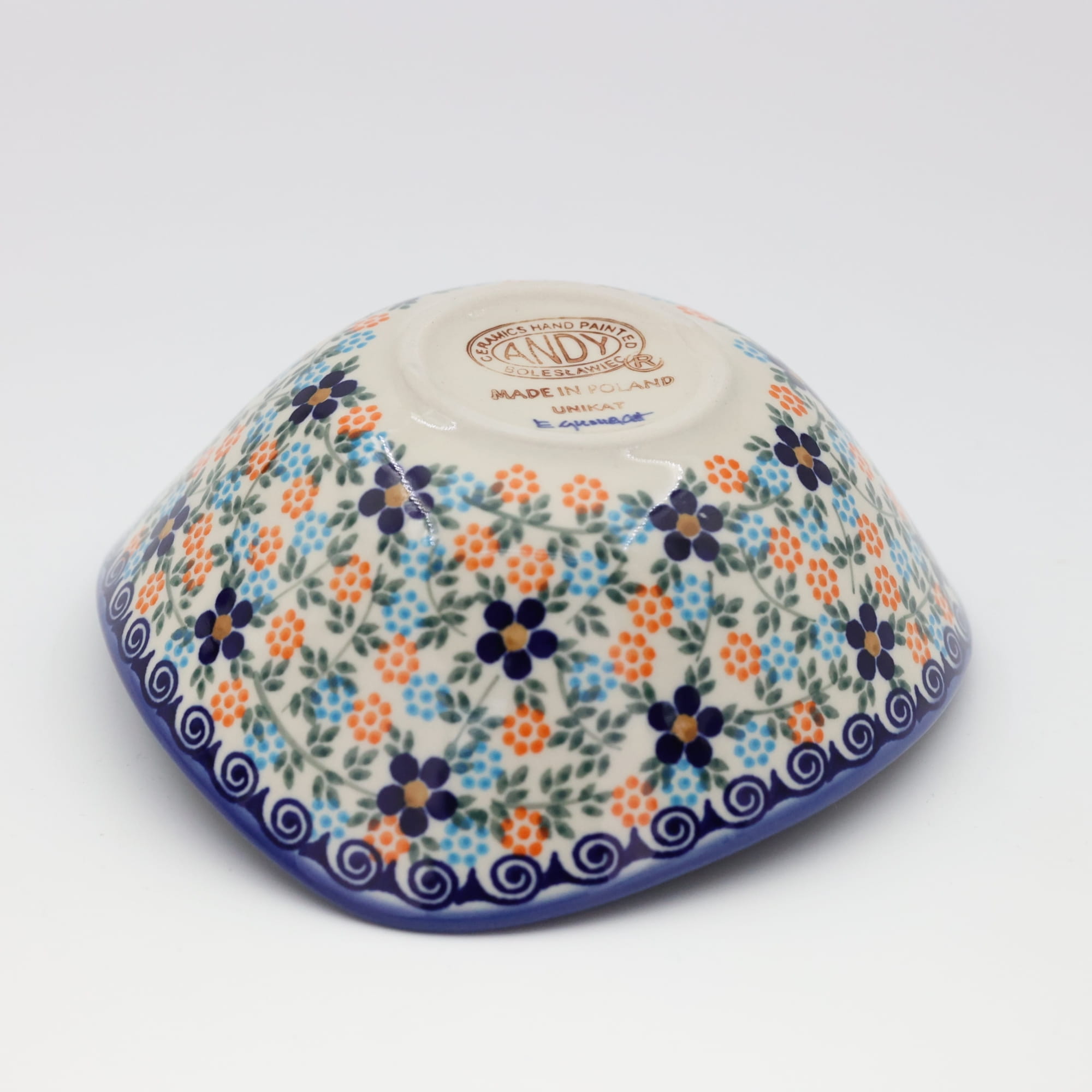 An original product of Bolesławiec ceramics - the Nina ceramic bowl small. Hand-decorated stoneware bowl of irregular shape, perfect for serving and storing food. Let your prepared dish be served beautifully and taste exquisitely thanks to the artistic Bolesławiec pottery dishes from the family manufactory, CERAMIKA ANDY, hand-decorated under glaze.