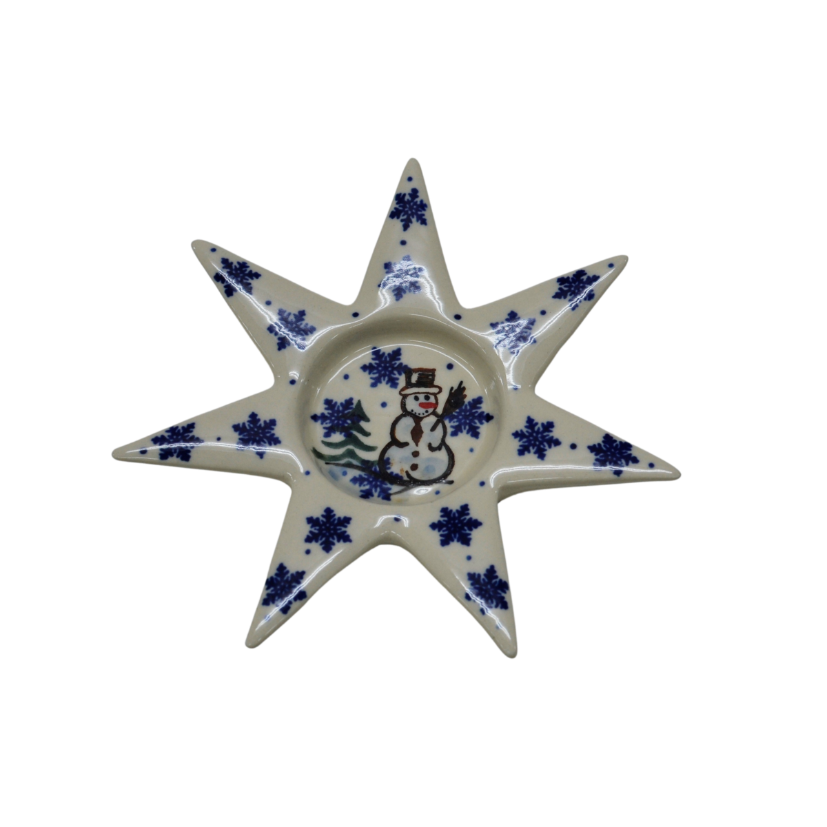 A ceramic candlestick in the shape of a star, an original product of utility ceramics from Bolesławiec. The candlestick can be used with a tealight or a traditional table-top candle.