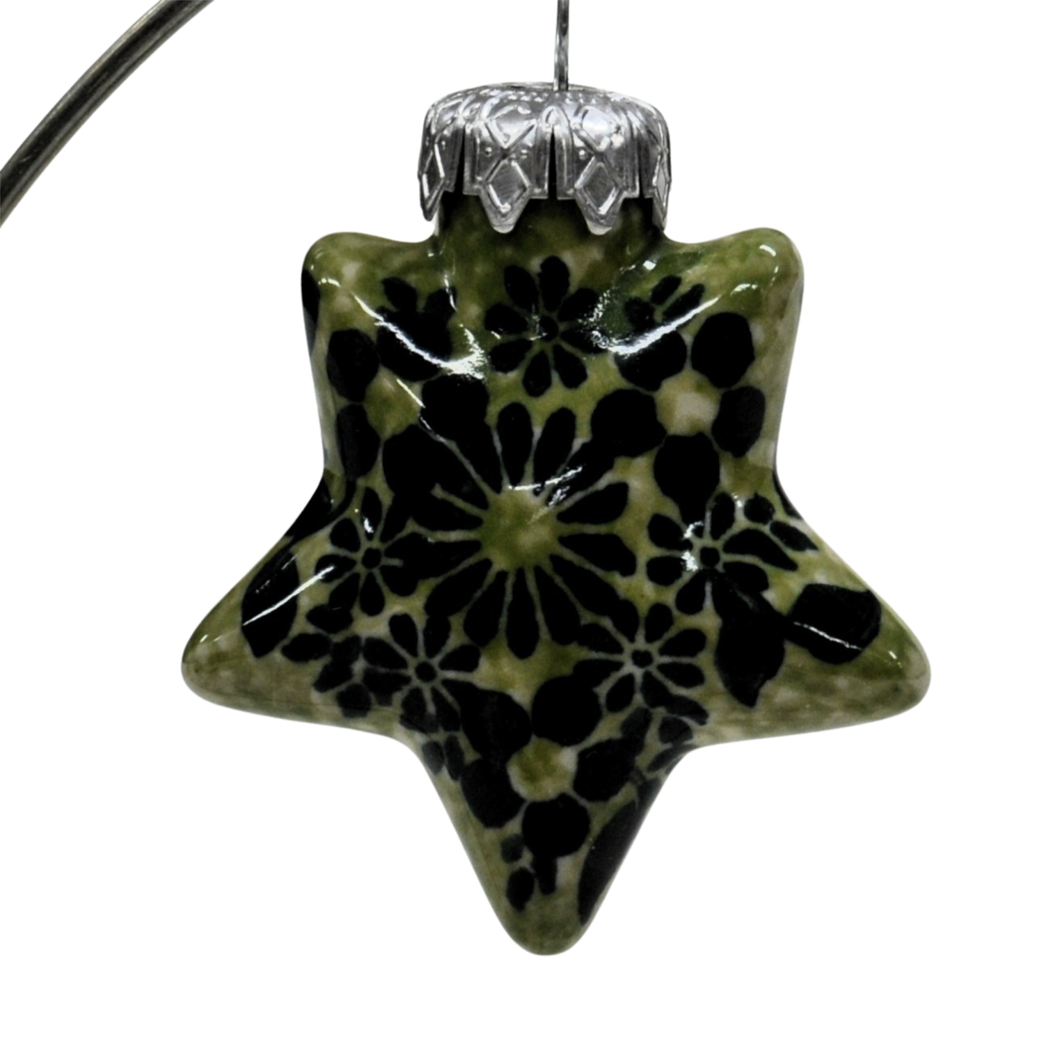 A ceramic ornament on a star shape, a traditional decoration of a Christmas tree.