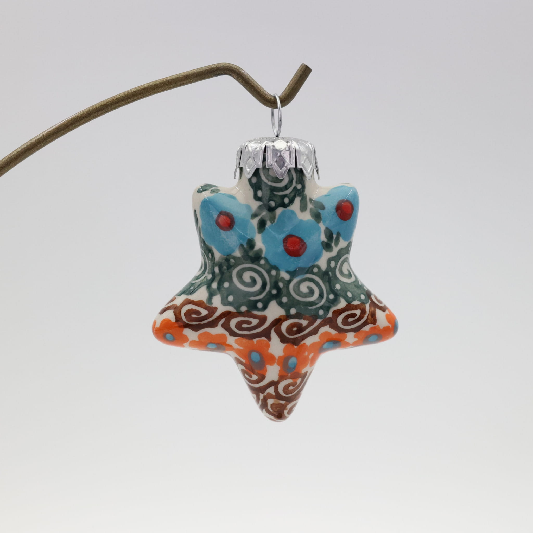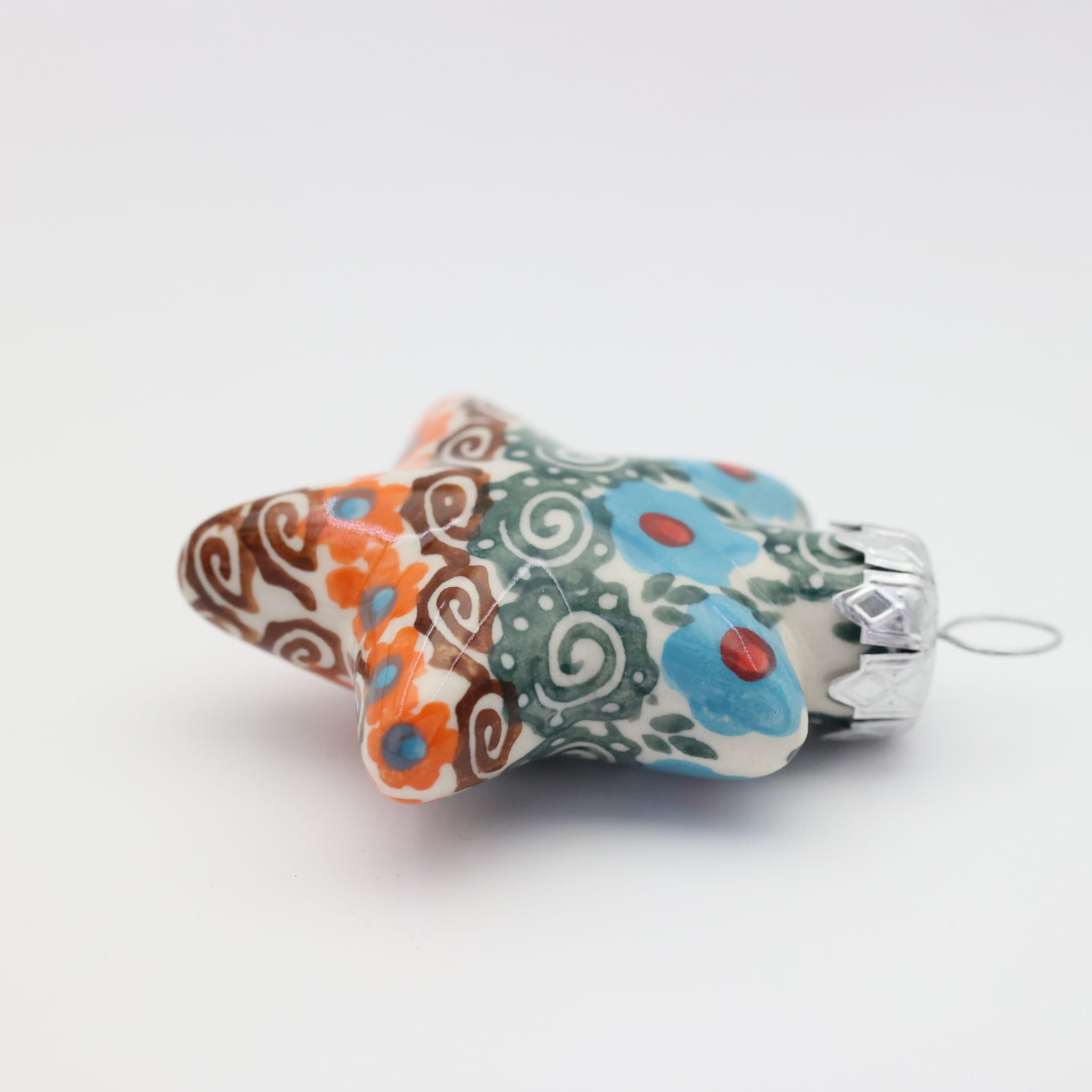 Original ceramic christmas ornament, hand-painted in a family factory of Bolesławiec ceramics, with traditional stamp and flower patterns.