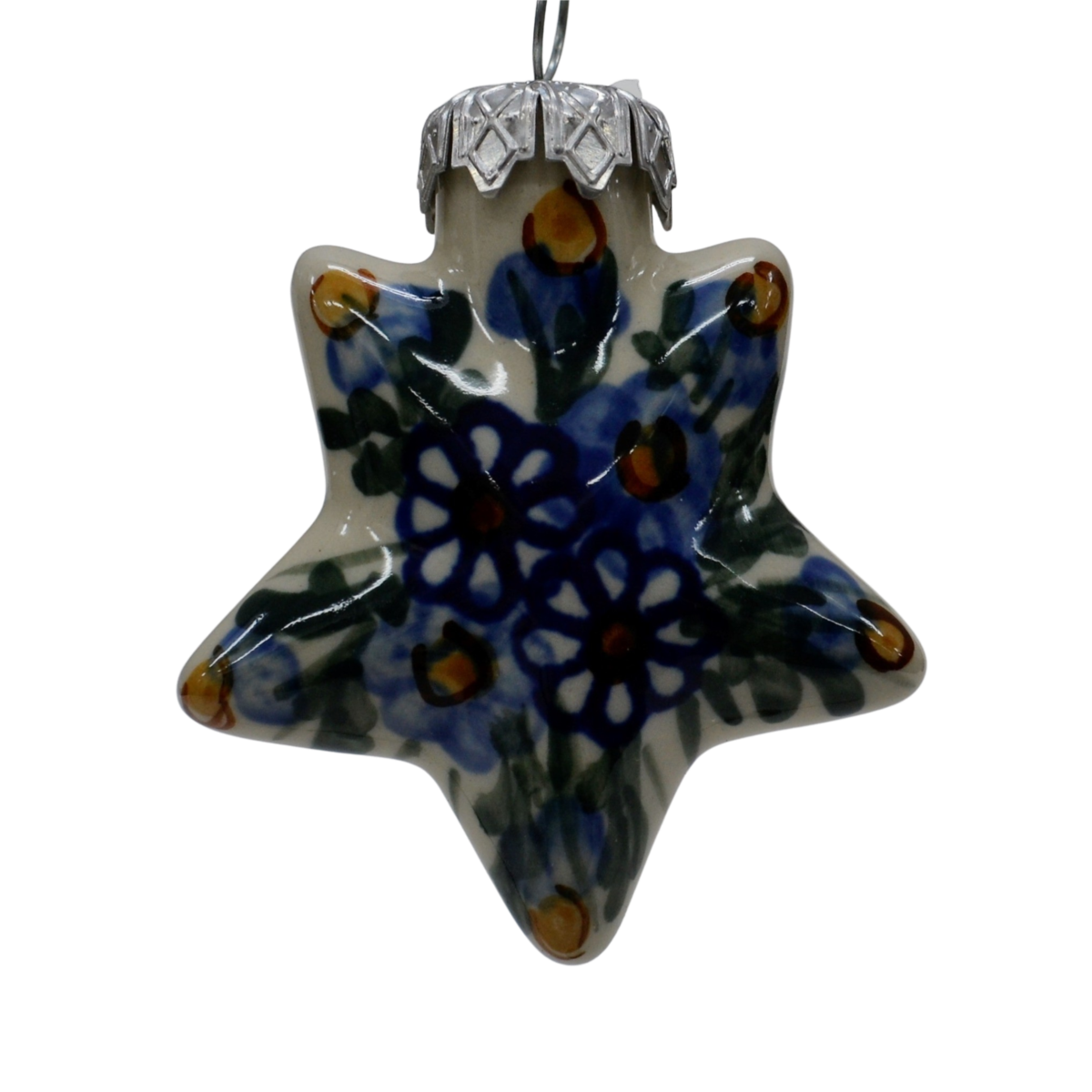 A ceramic ornament on a star shape, a traditional decoration of a Christmas tree.