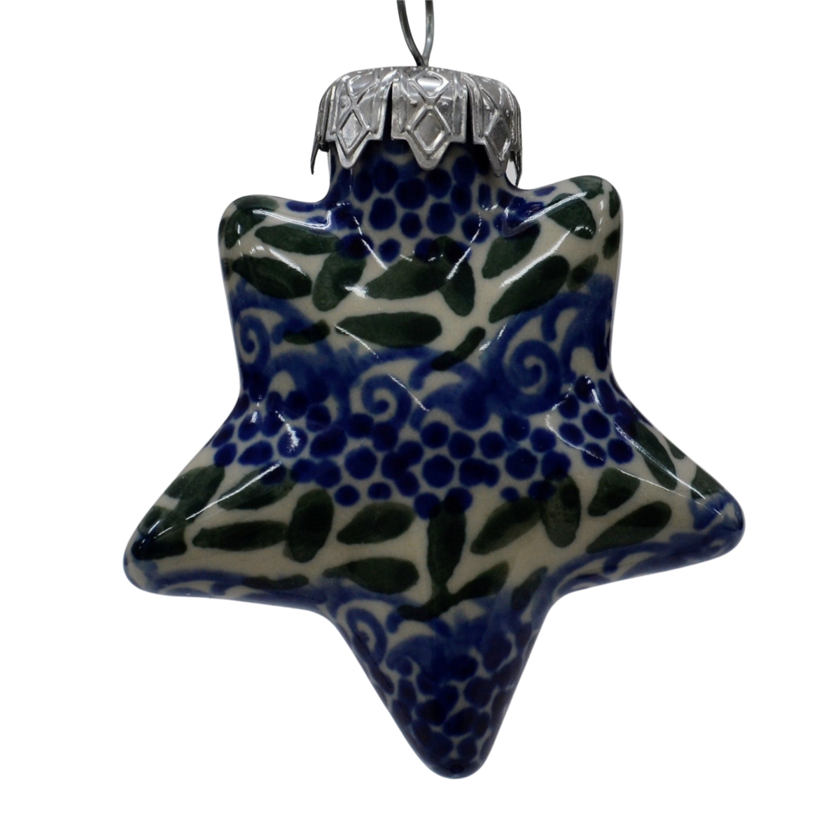 A ceramic ornament on a star shape, a traditional decoration of a Christmas tree.