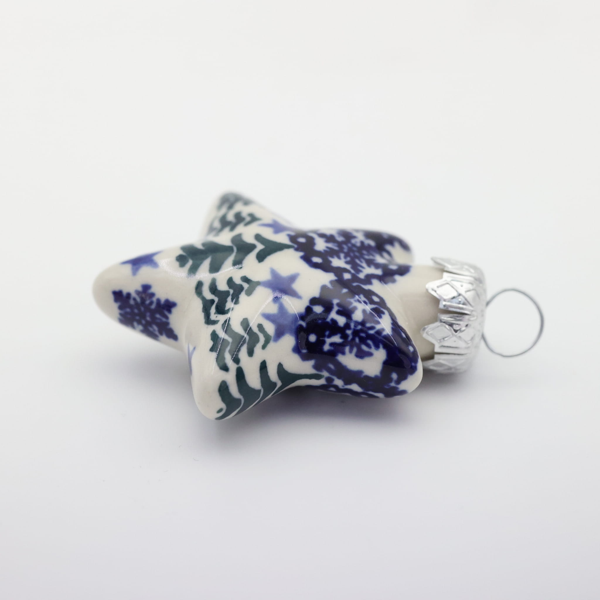 A ceramic ornament on a star shape, a traditional decoration of a Christmas tree.