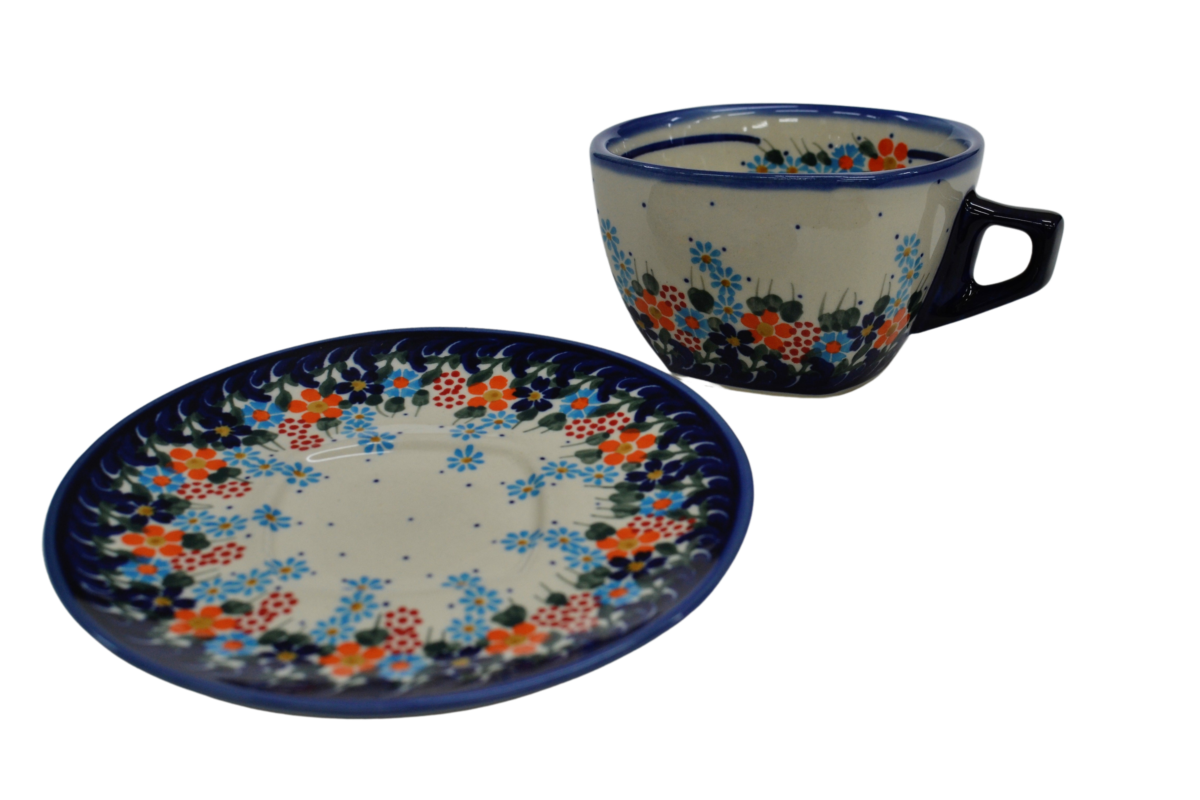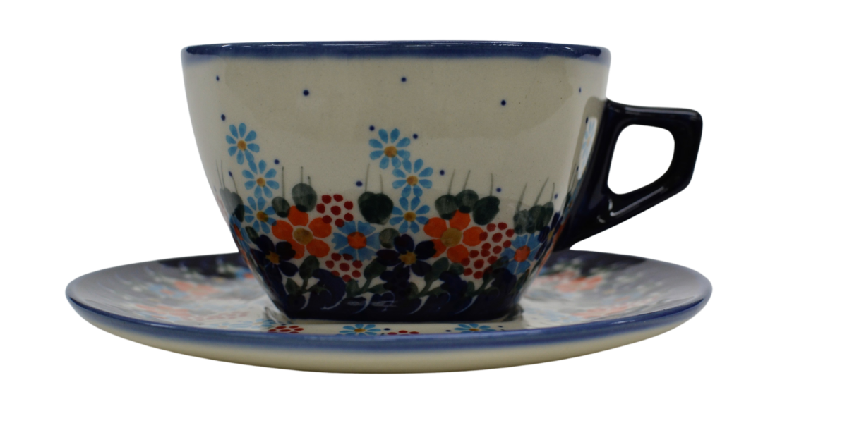 An original coffe cup from Bolesławiec with a saucer (plate). Extremely beautiful, ceramic, underglaze decorated, square cup with a ceramic saucer with a capacity of up to 300 ml.