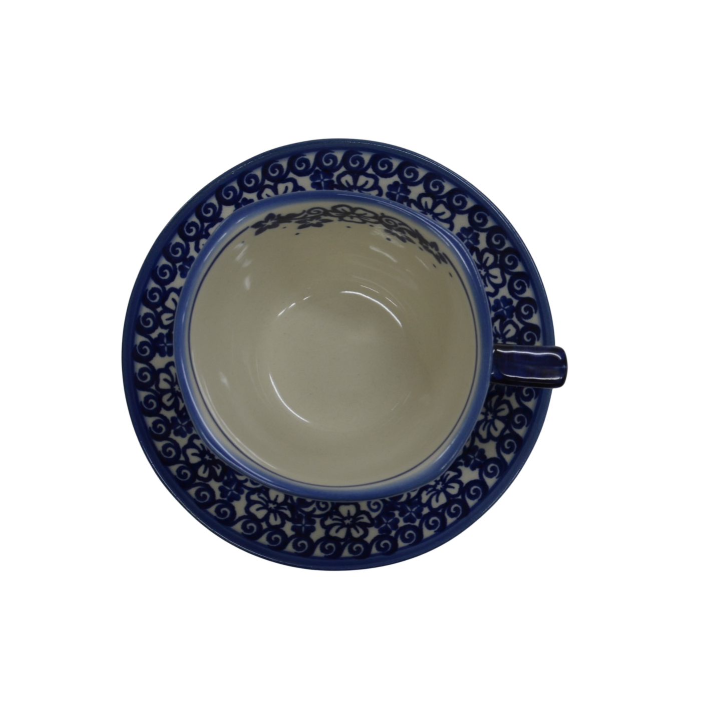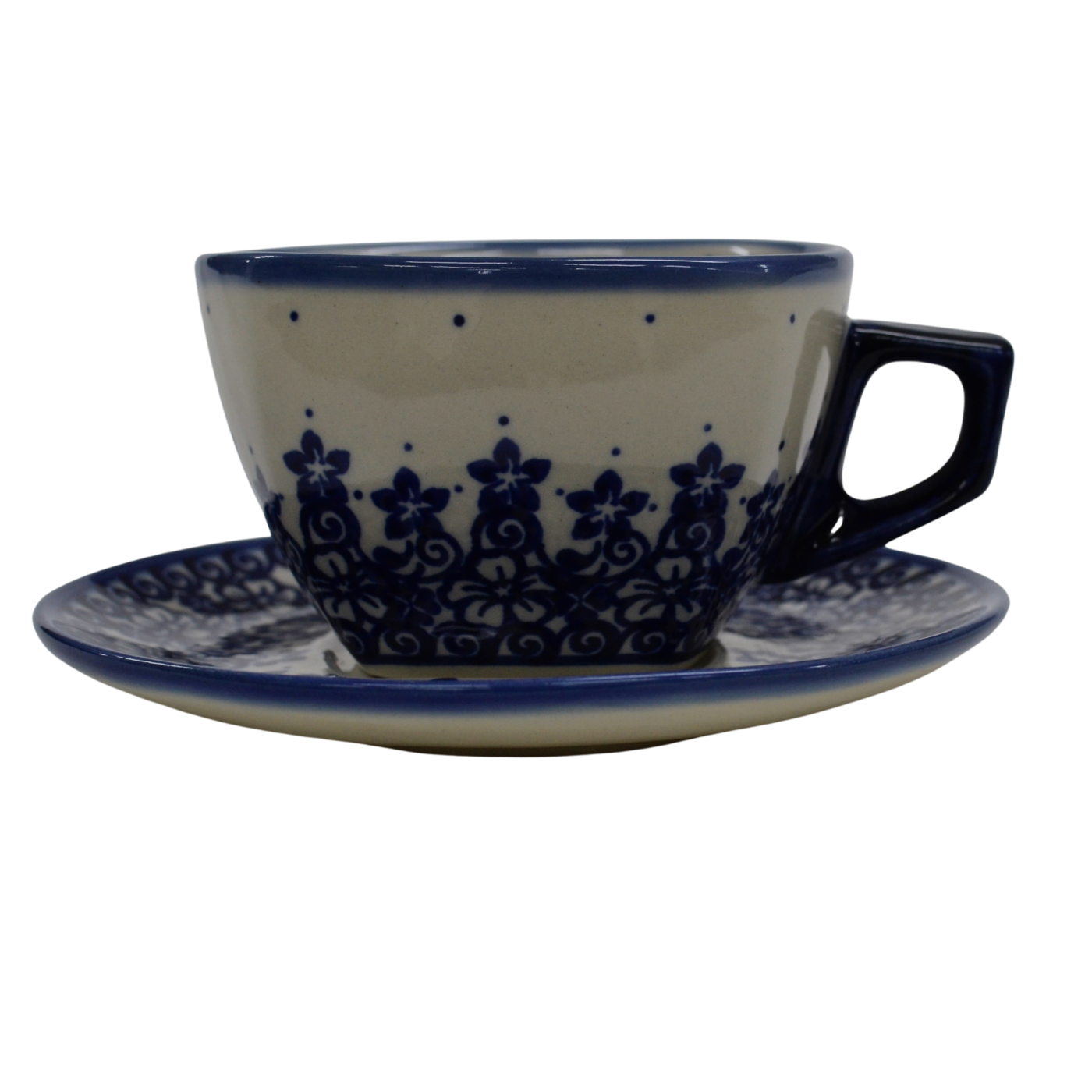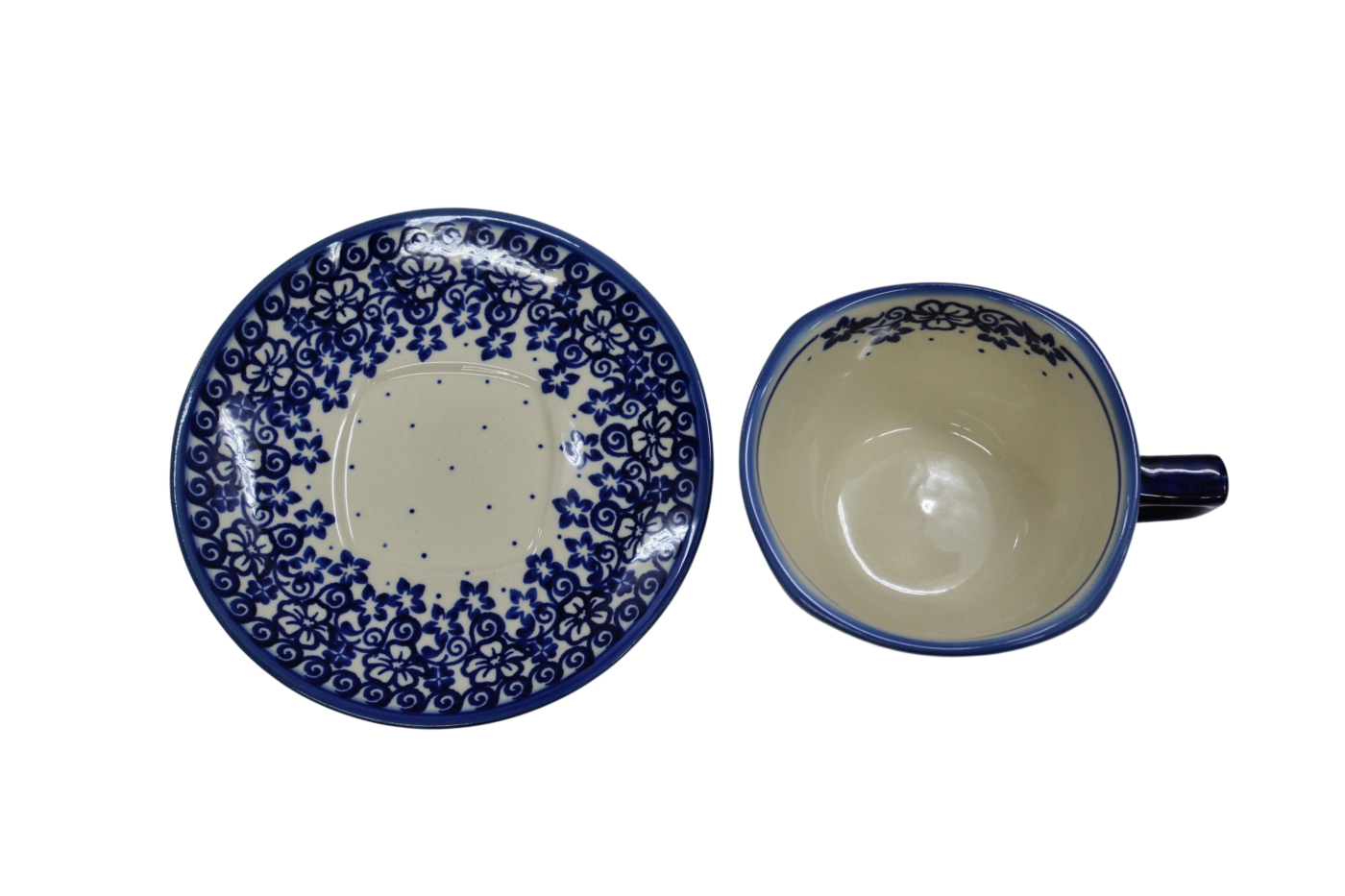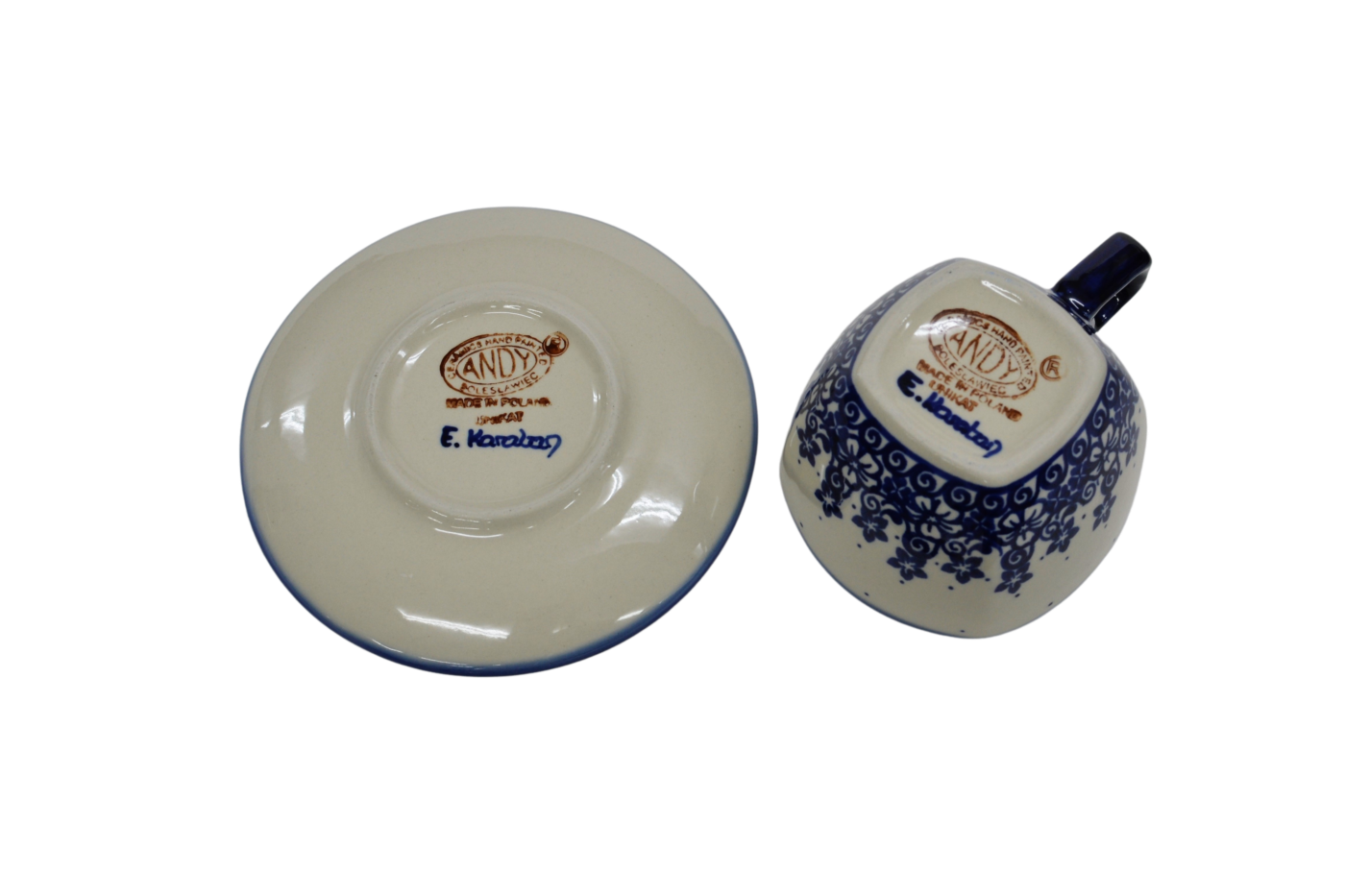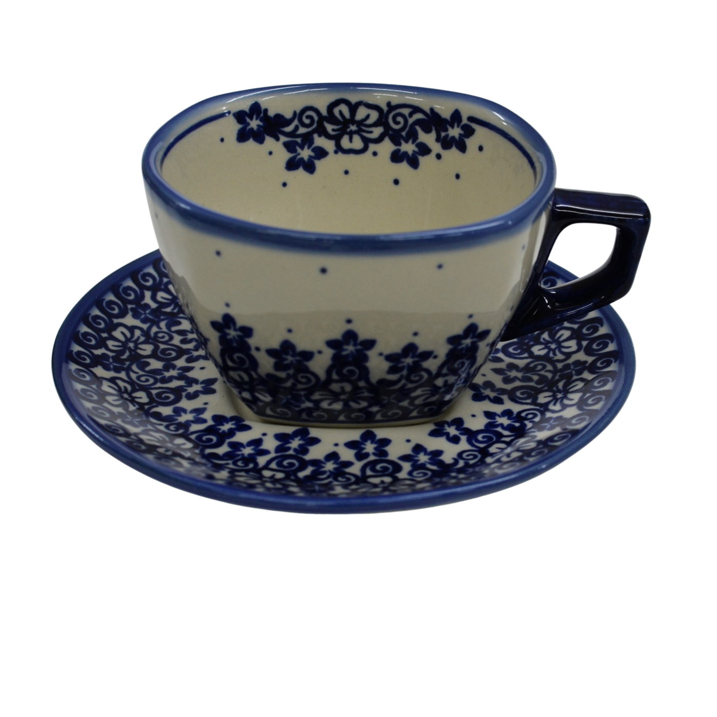 An original coffe cup from Bolesławiec with a saucer (plate). Extremely beautiful, ceramic, underglaze decorated, square cup with a ceramic saucer with a capacity of up to 300 ml.