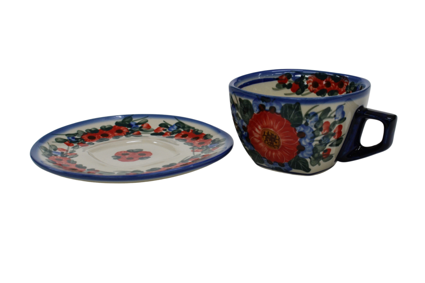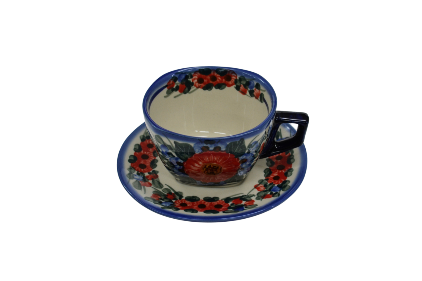 An original coffe cup from Bolesławiec with a saucer (plate). Extremely beautiful, ceramic, underglaze decorated, square cup with a ceramic saucer with a capacity of up to 300 ml.