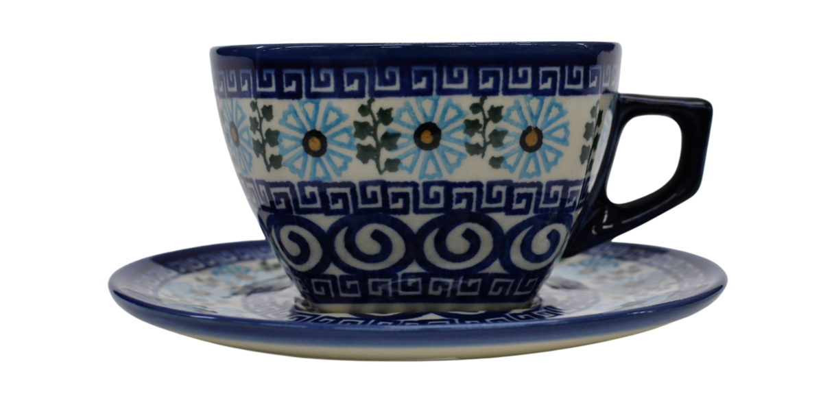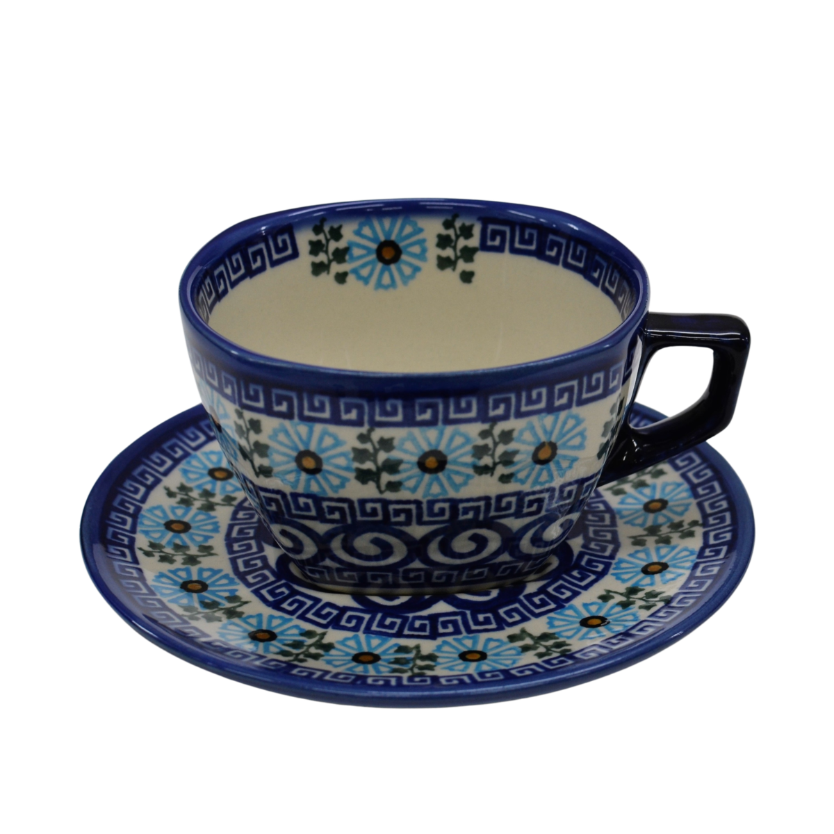 An original coffe cup from Bolesławiec with a saucer (plate). Extremely beautiful, ceramic, underglaze decorated, square cup with a ceramic saucer with a capacity of up to 300 ml.