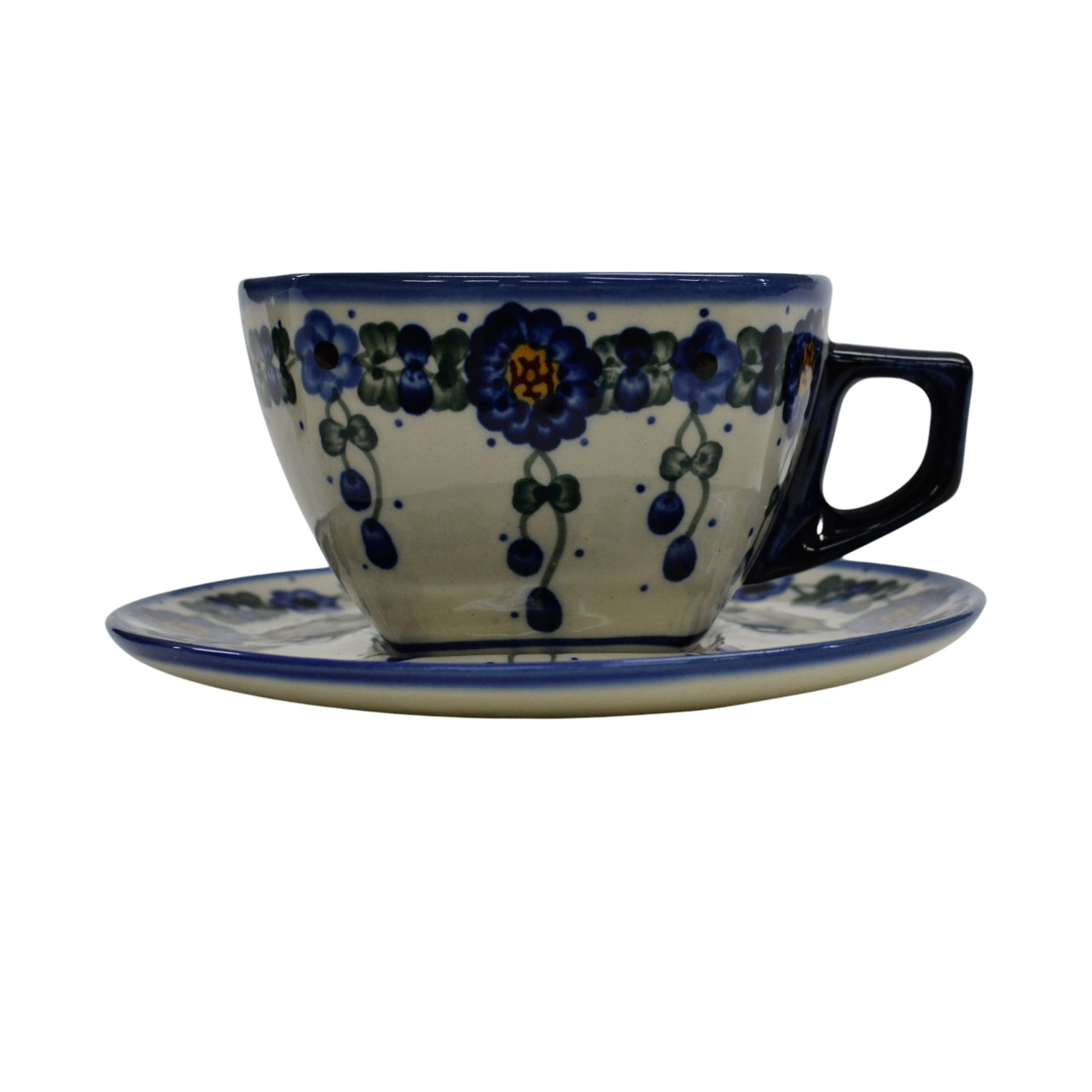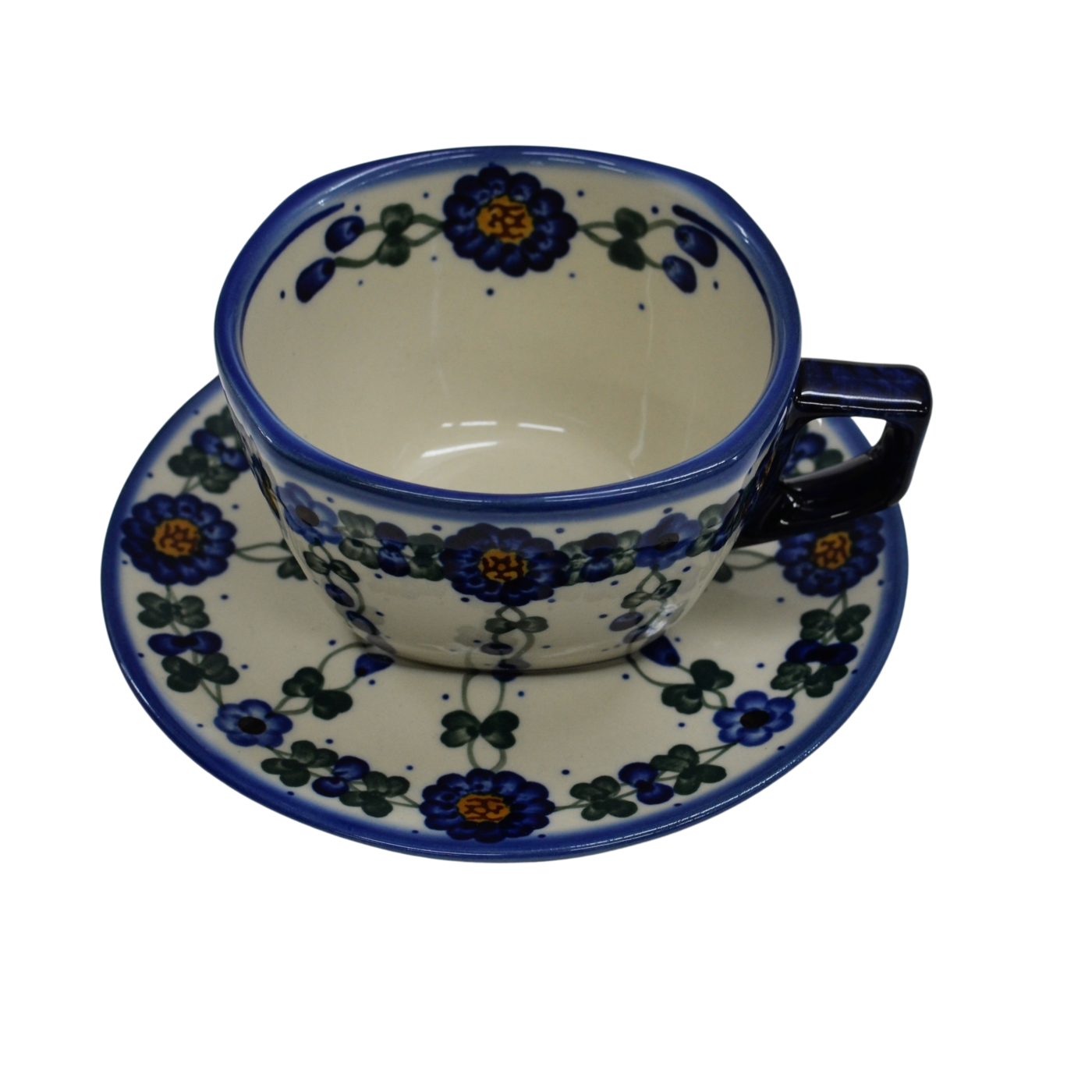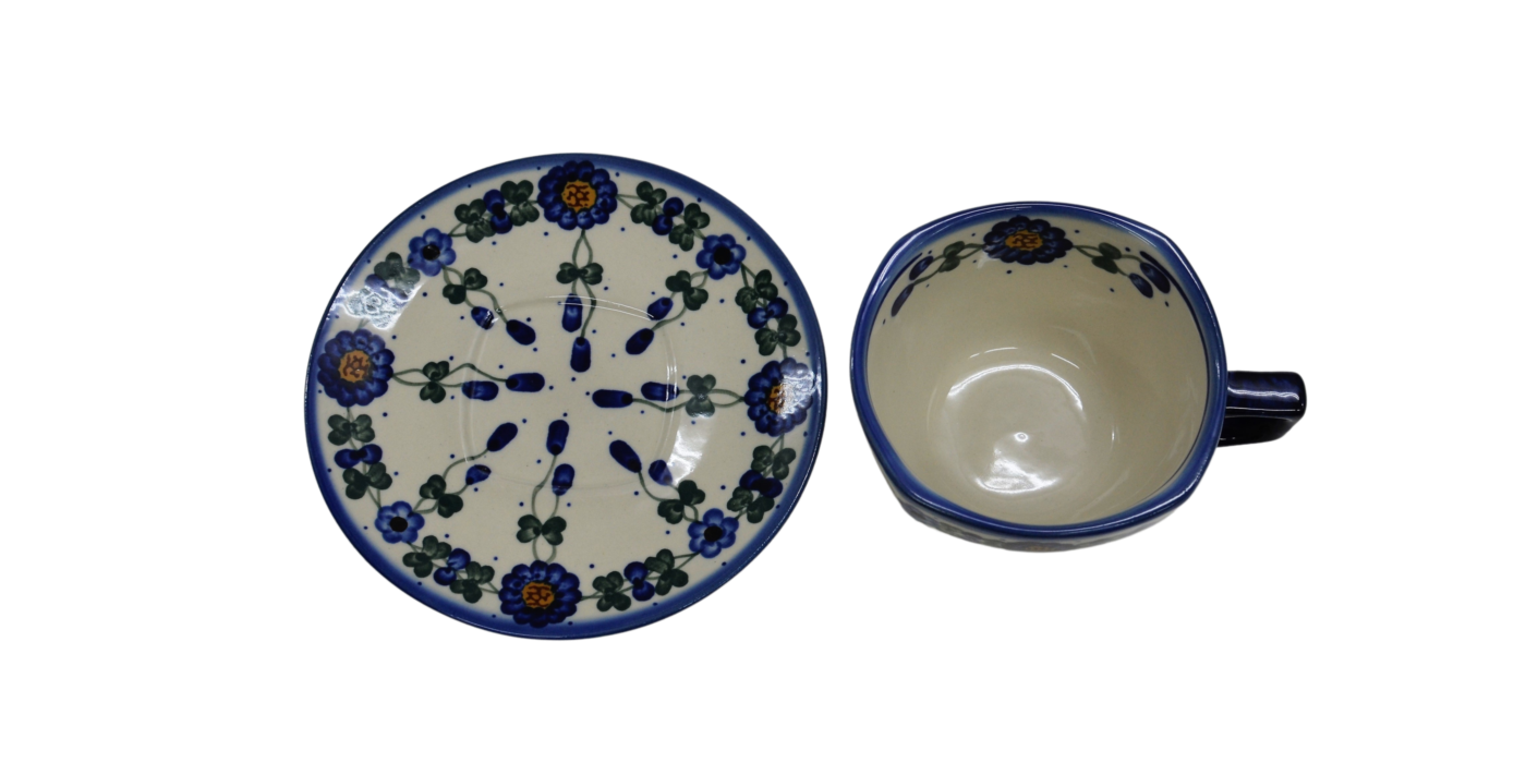An original coffe cup from Bolesławiec with a saucer (plate). Extremely beautiful, ceramic, underglaze decorated, square cup with a ceramic saucer with a capacity of up to 300 ml.