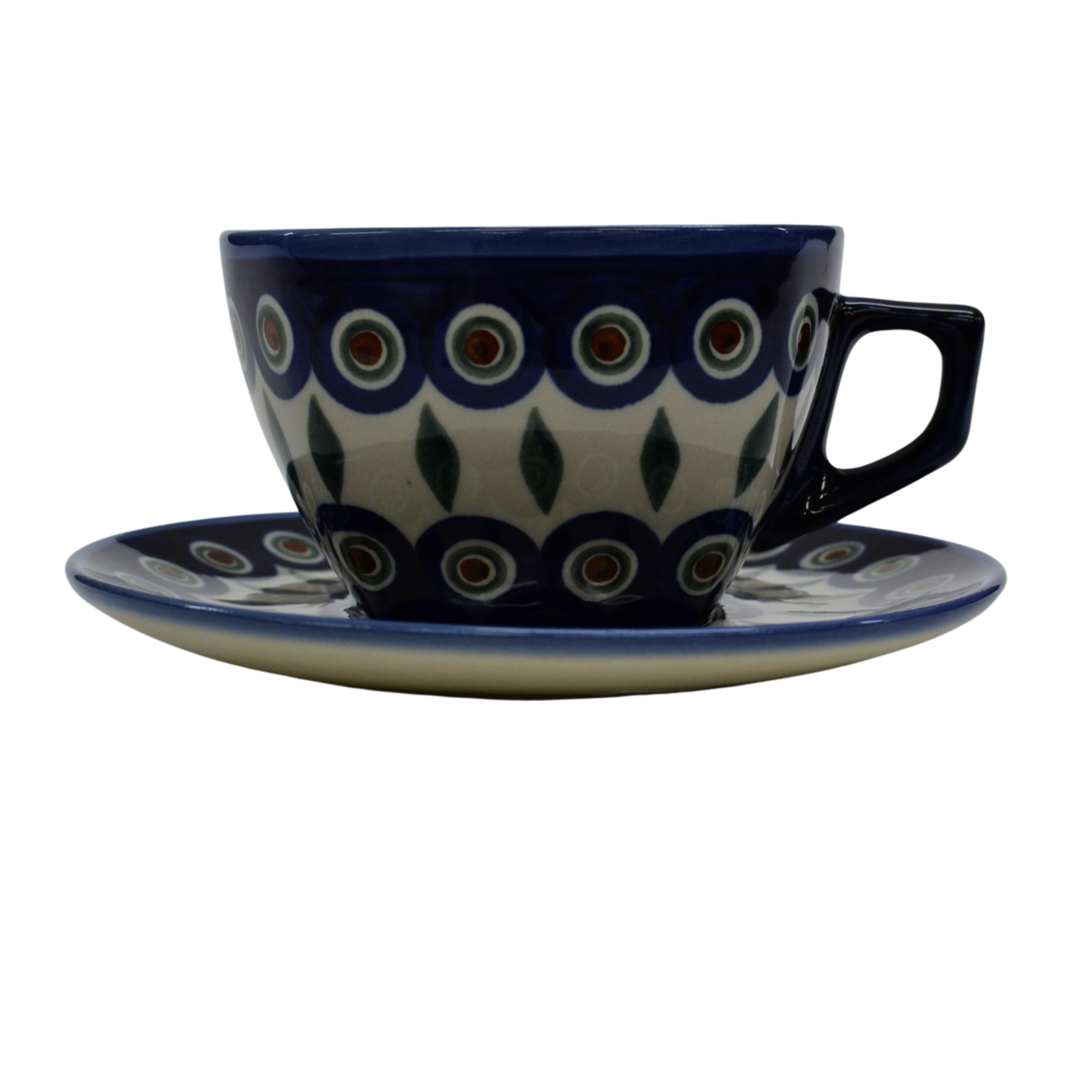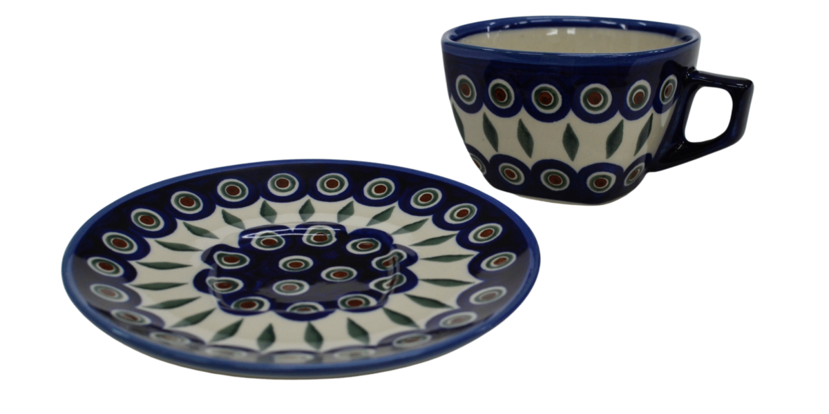 An original coffe cup from Bolesławiec with a saucer (plate). Extremely beautiful, ceramic, underglaze decorated, square cup with a ceramic saucer with a capacity of up to 300 ml.