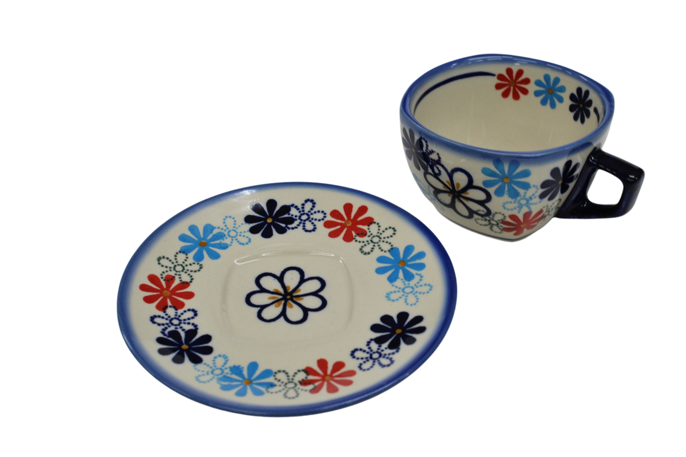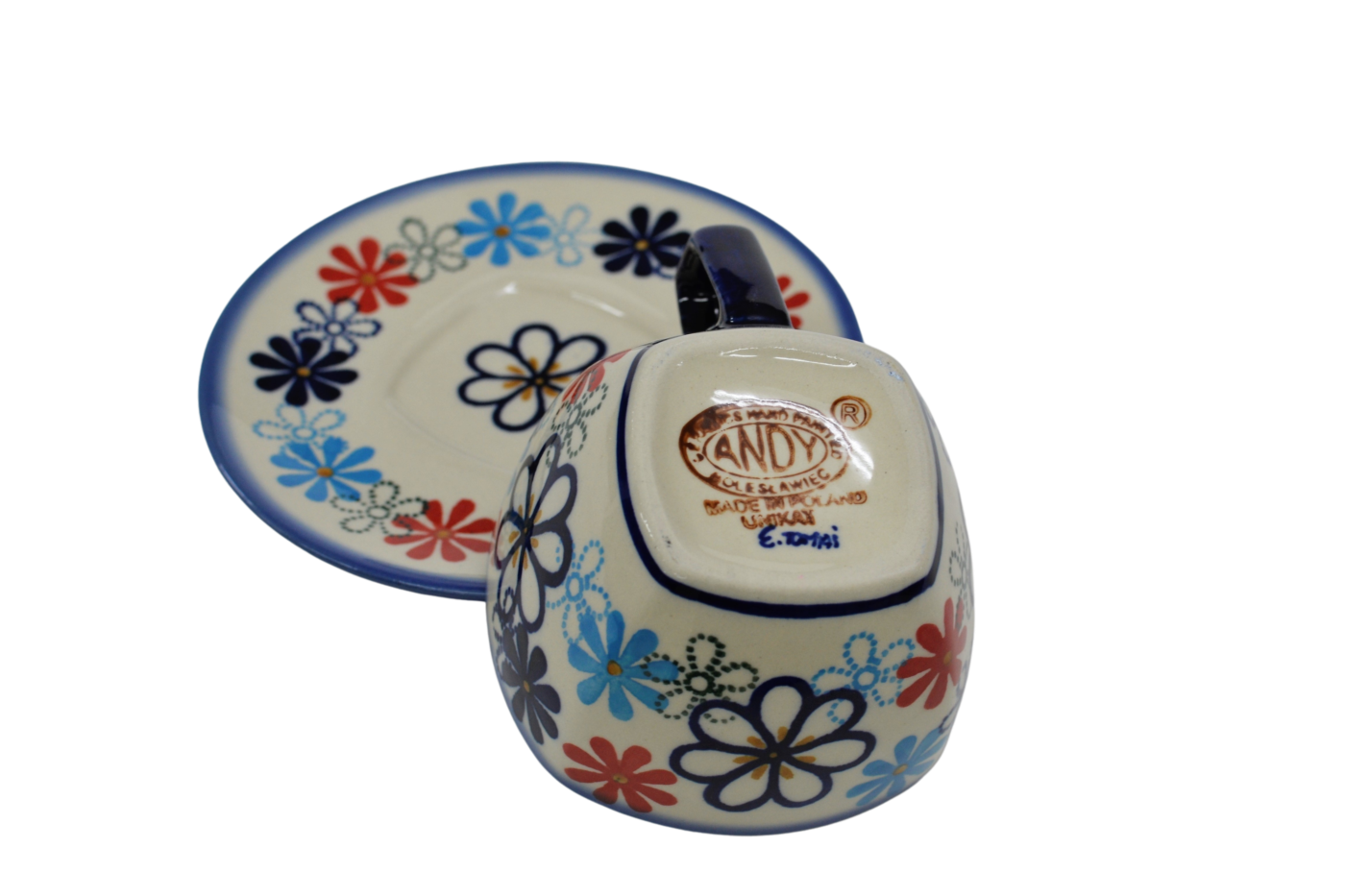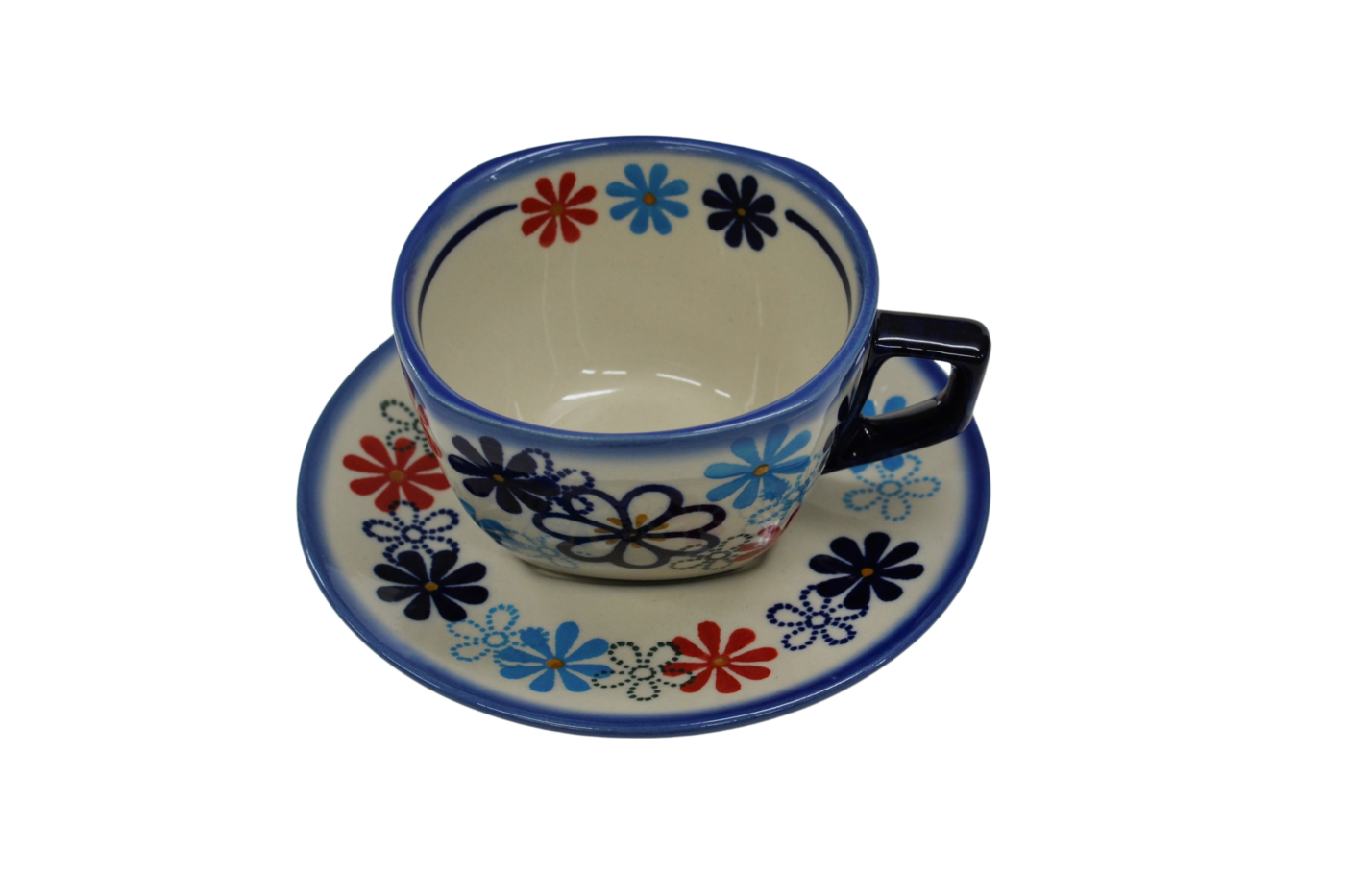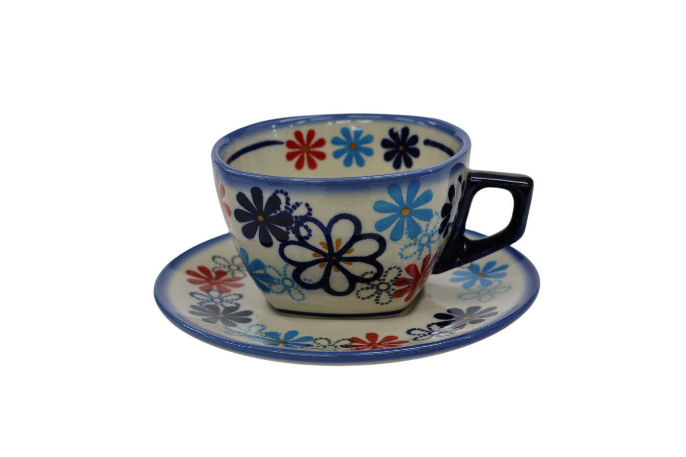 An original coffe cup from Bolesławiec with a saucer (plate). Extremely beautiful, ceramic, underglaze decorated, square cup with a ceramic saucer with a capacity of up to 300 ml.