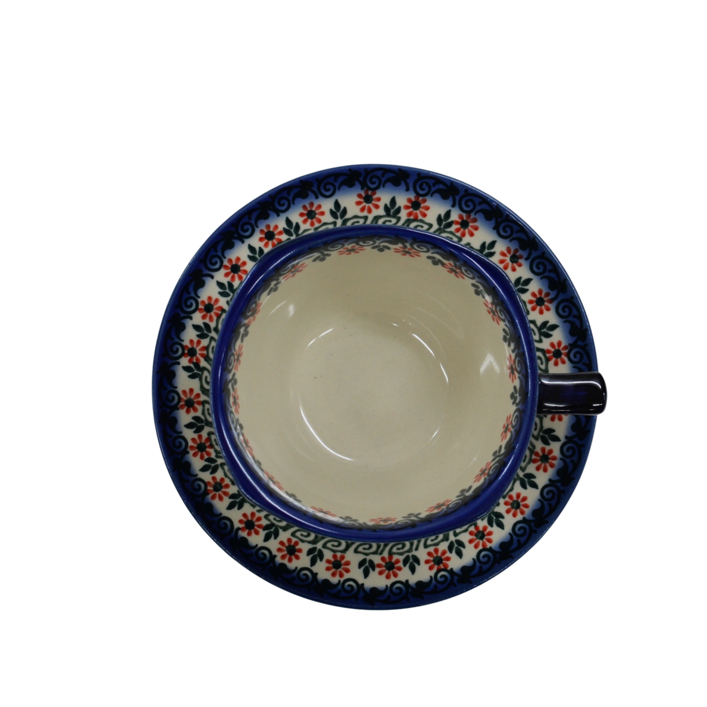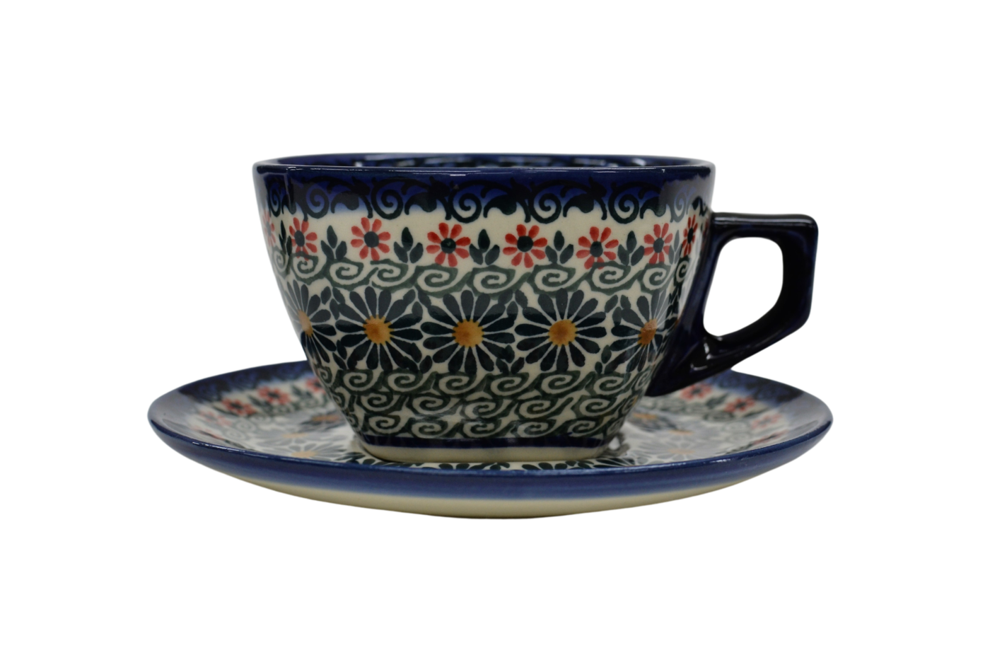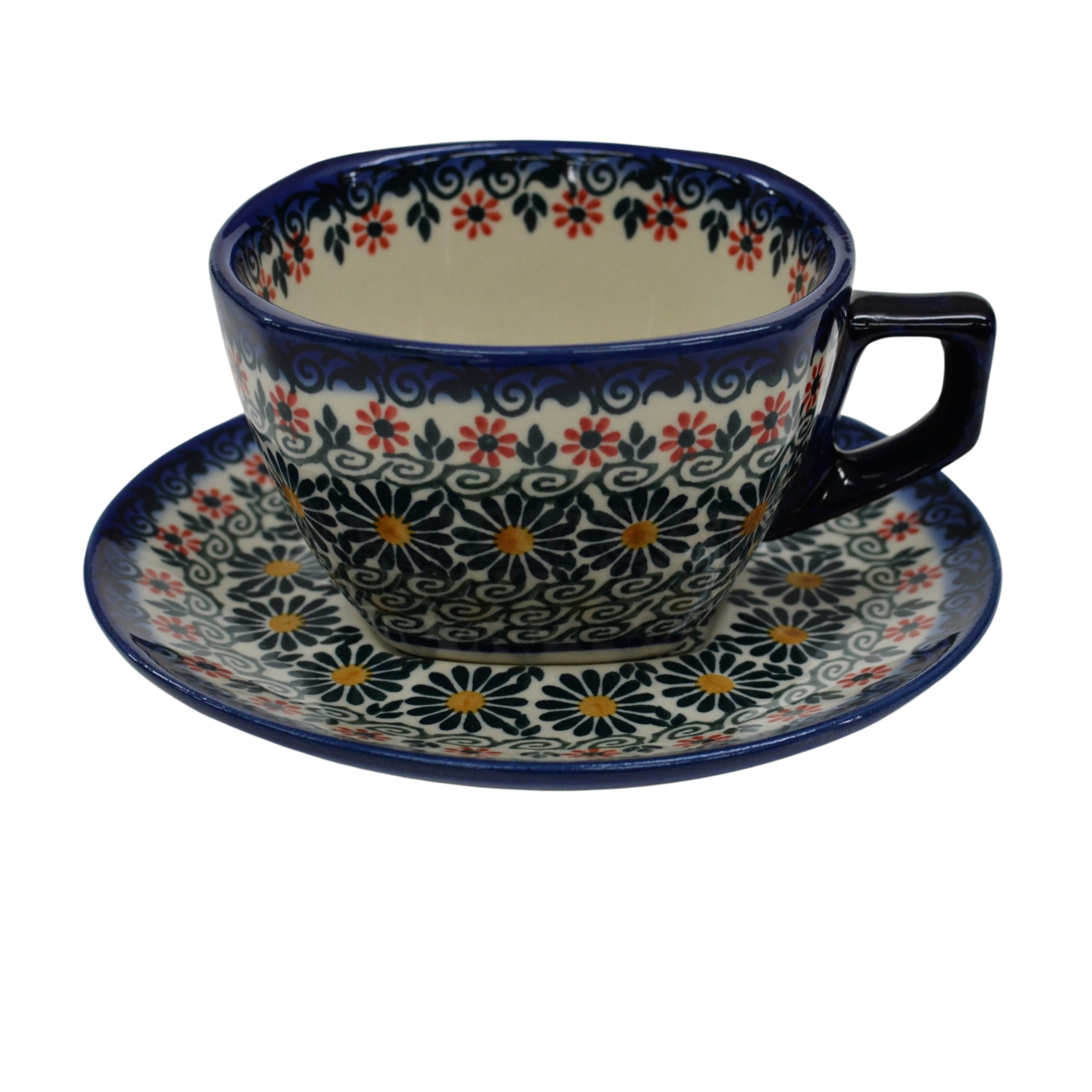 An original coffe cup from Bolesławiec with a saucer (plate). Extremely beautiful, ceramic, underglaze decorated, square cup with a ceramic saucer with a capacity of up to 300 ml.