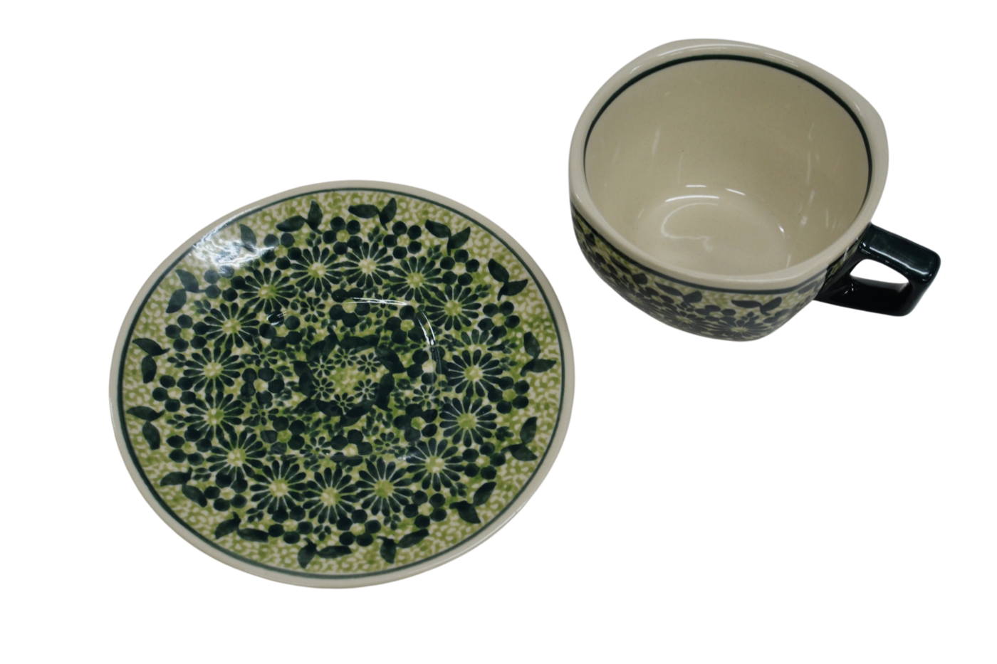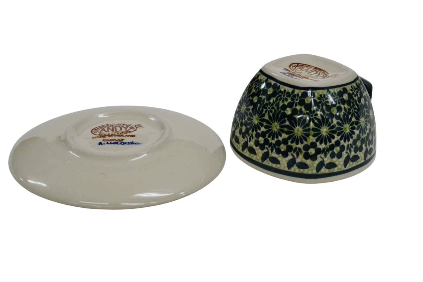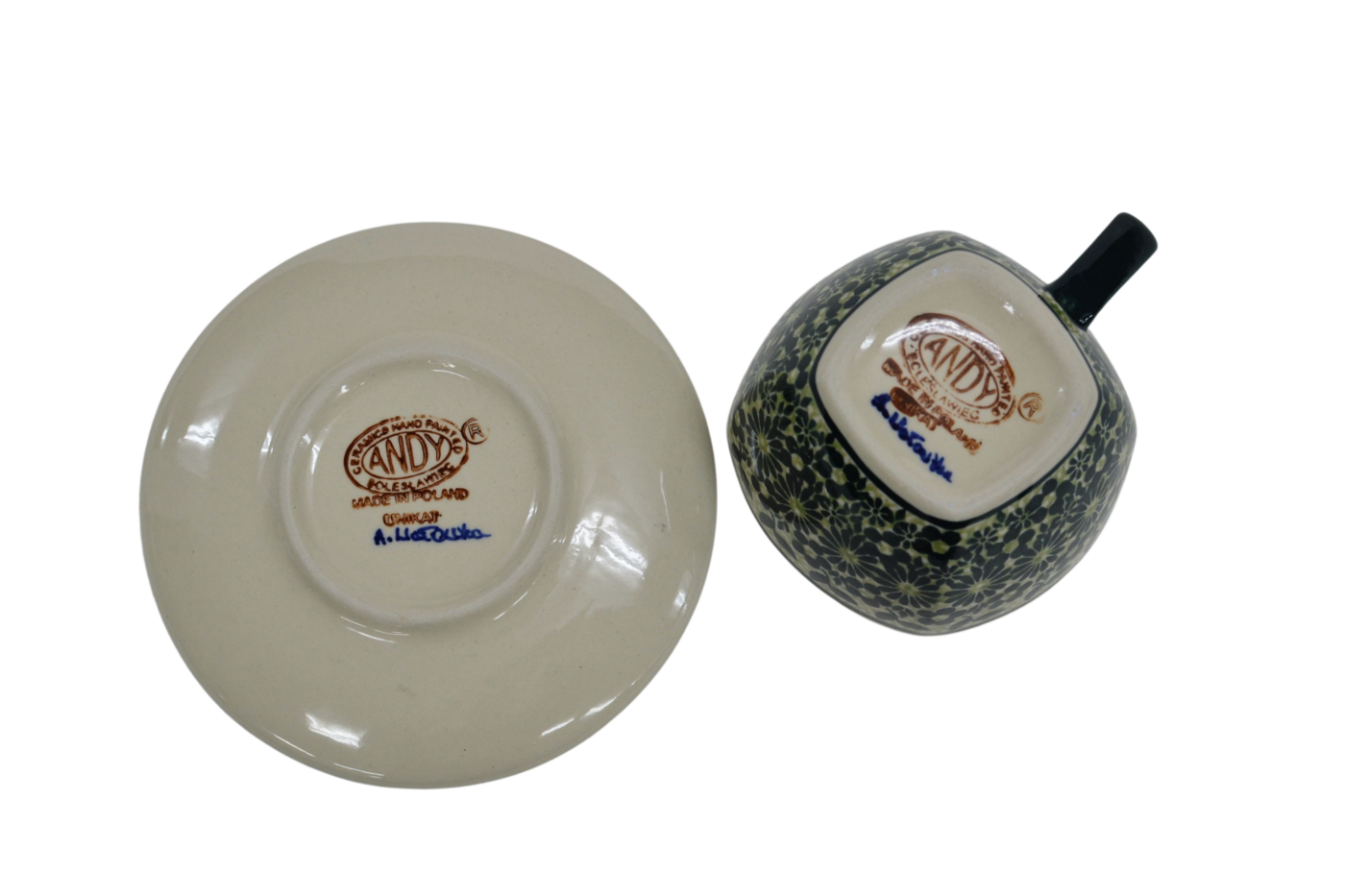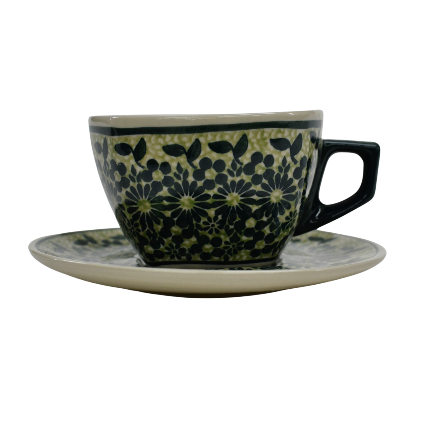 An original coffe cup from Bolesławiec with a saucer (plate). Extremely beautiful, ceramic, underglaze decorated, square cup with a ceramic saucer with a capacity of up to 300 ml.