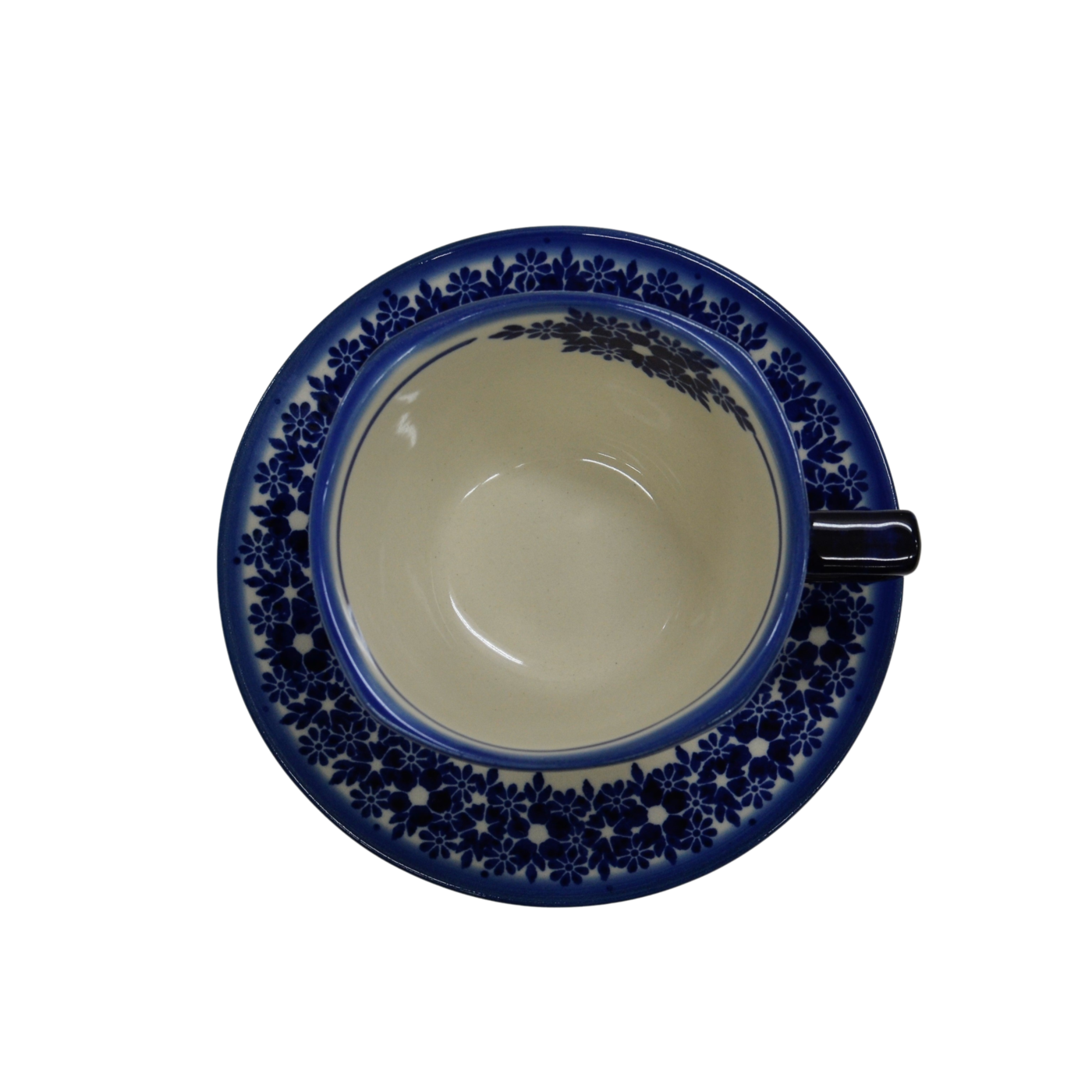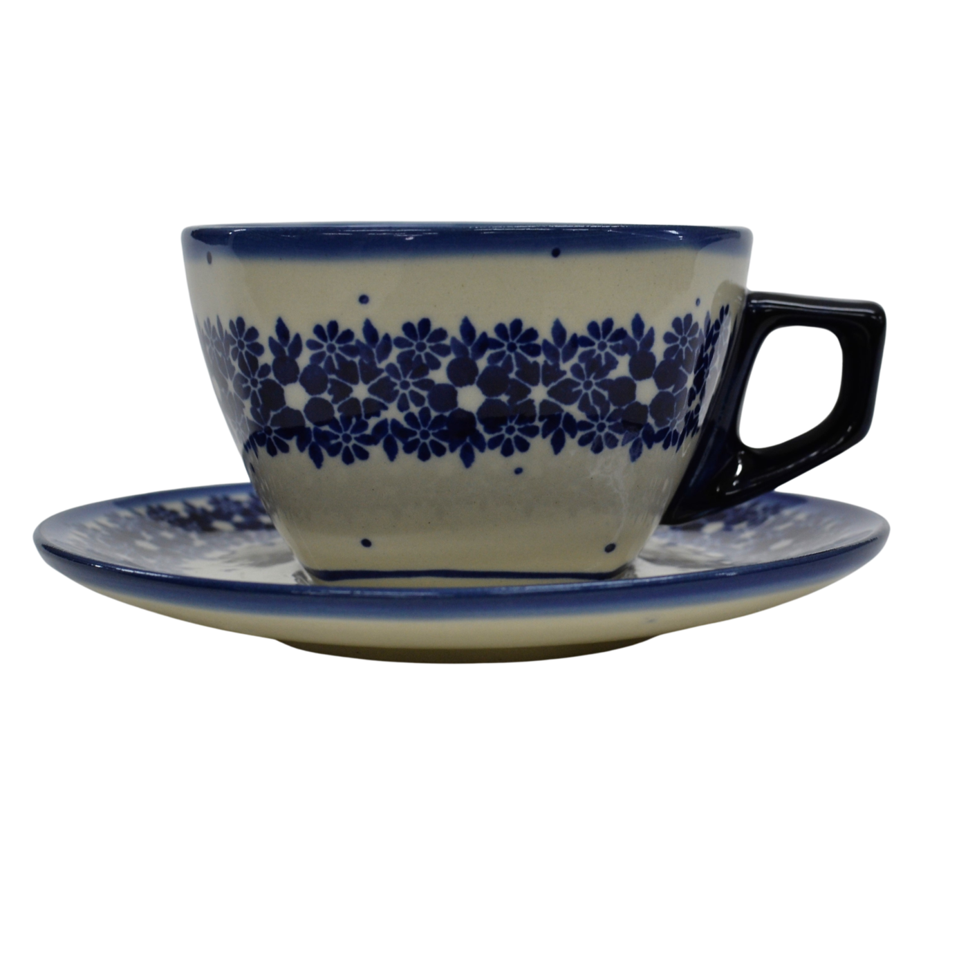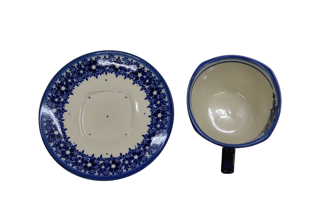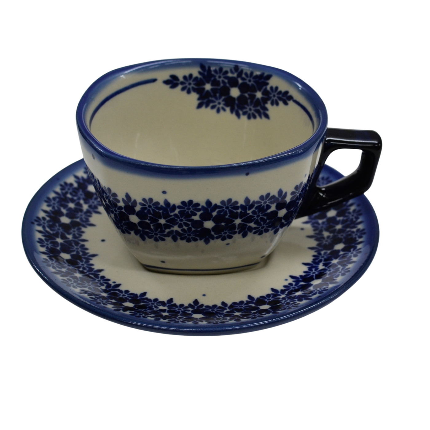 An original coffe cup from Bolesławiec with a saucer (plate). Extremely beautiful, ceramic, underglaze decorated, square cup with a ceramic saucer with a capacity of up to 300 ml.