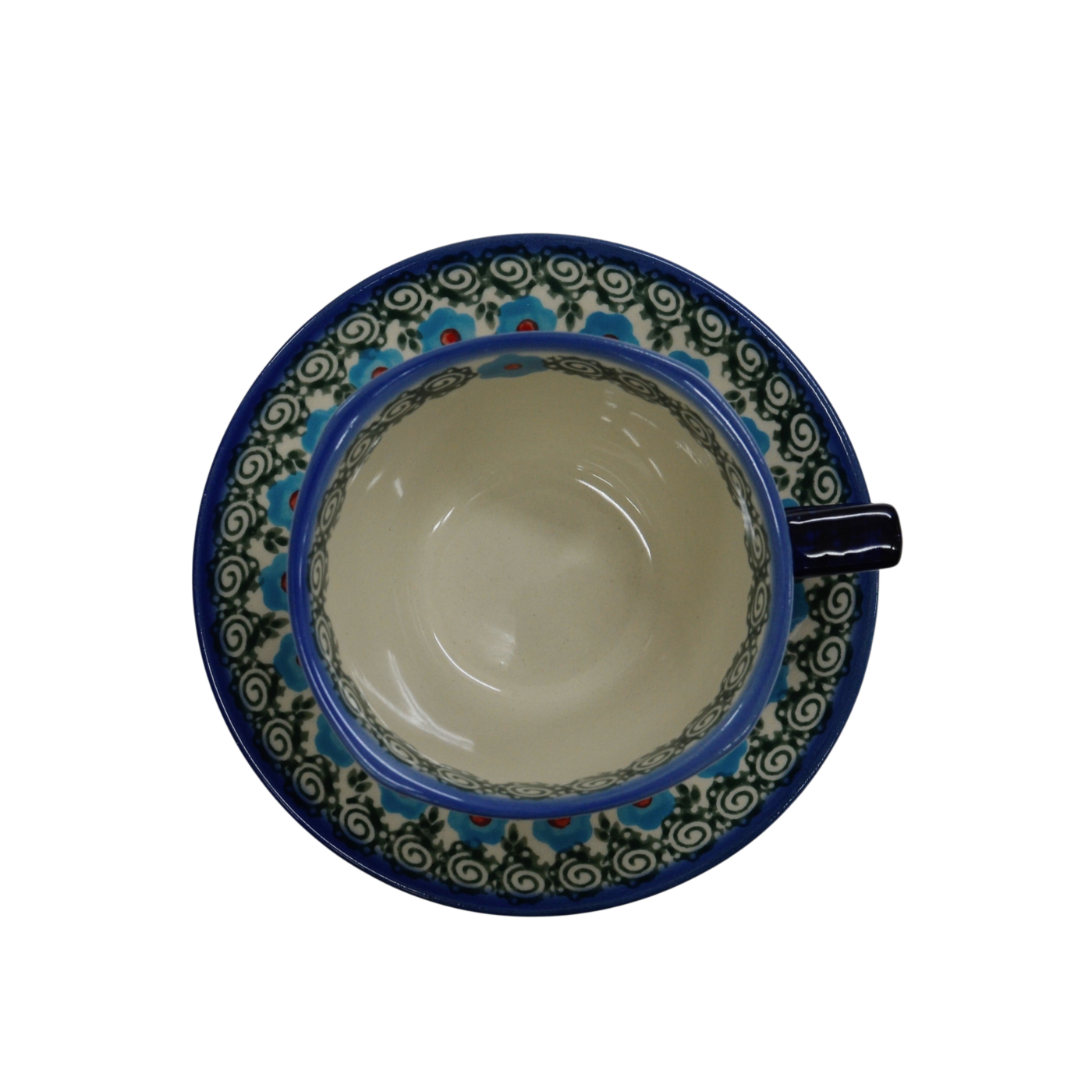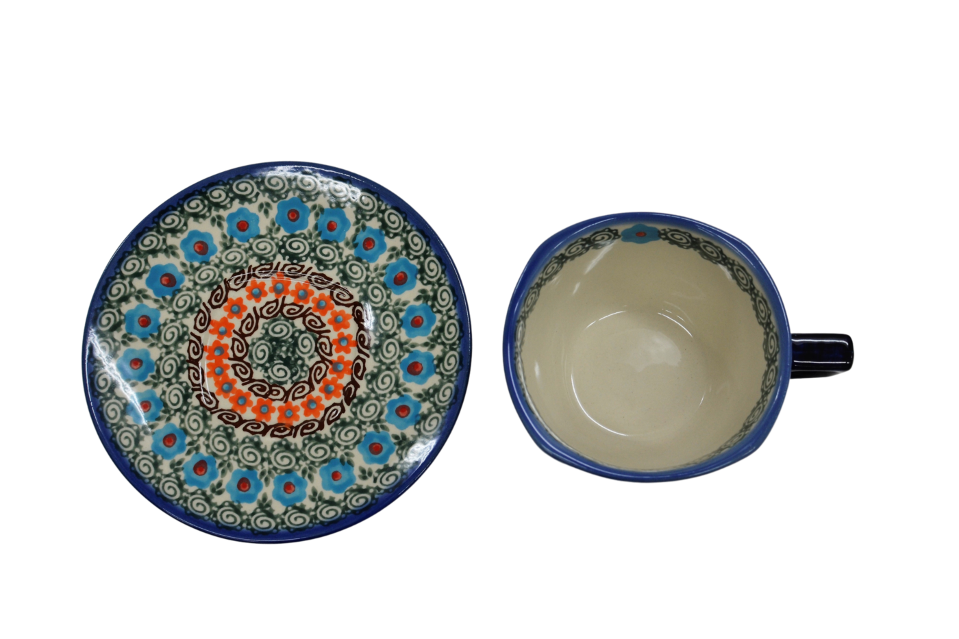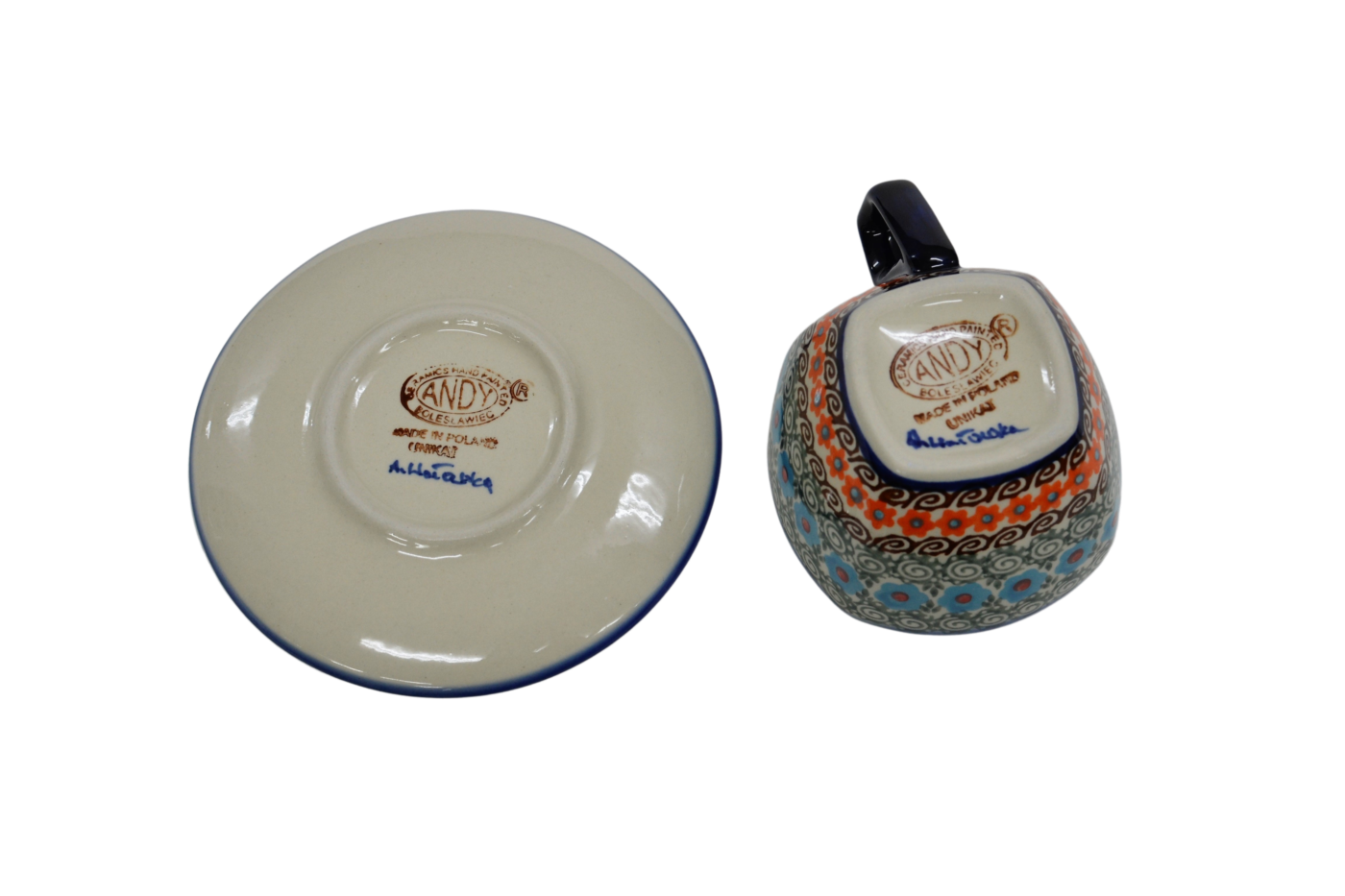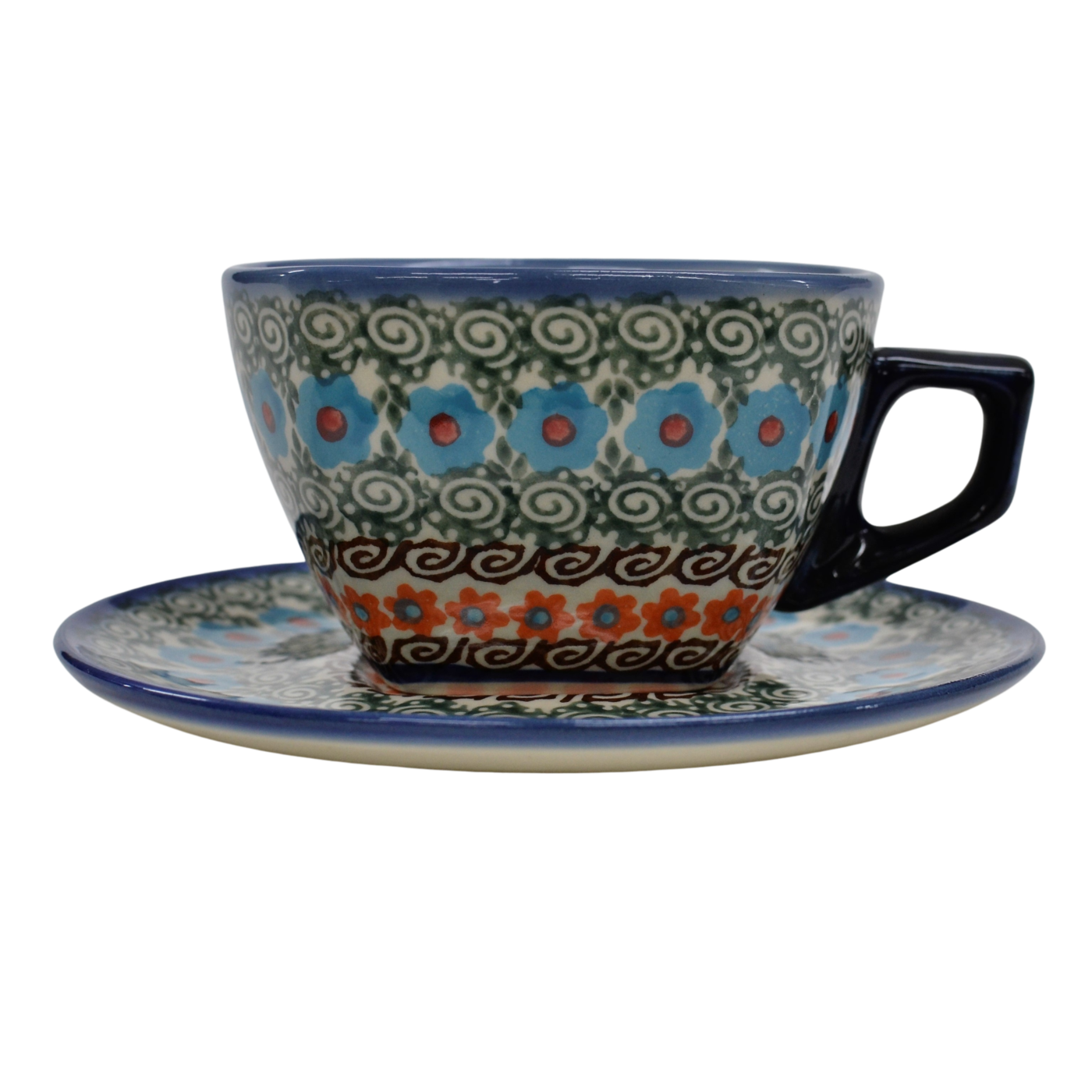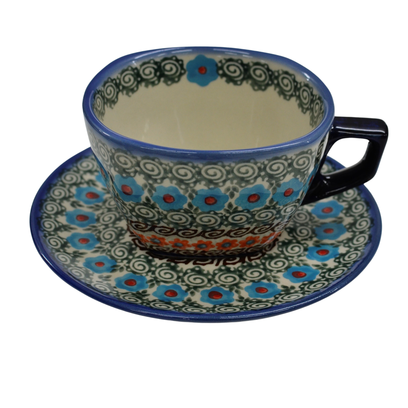 An original coffe cup from Bolesławiec with a saucer (plate). Extremely beautiful, ceramic, underglaze decorated, square cup with a ceramic saucer with a capacity of up to 300 ml.