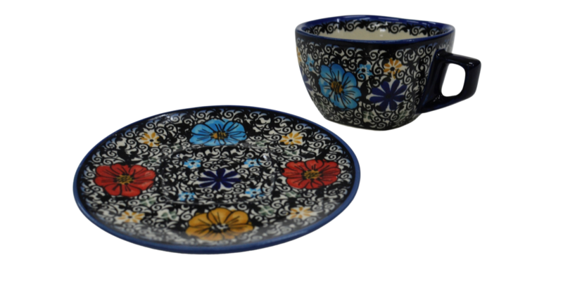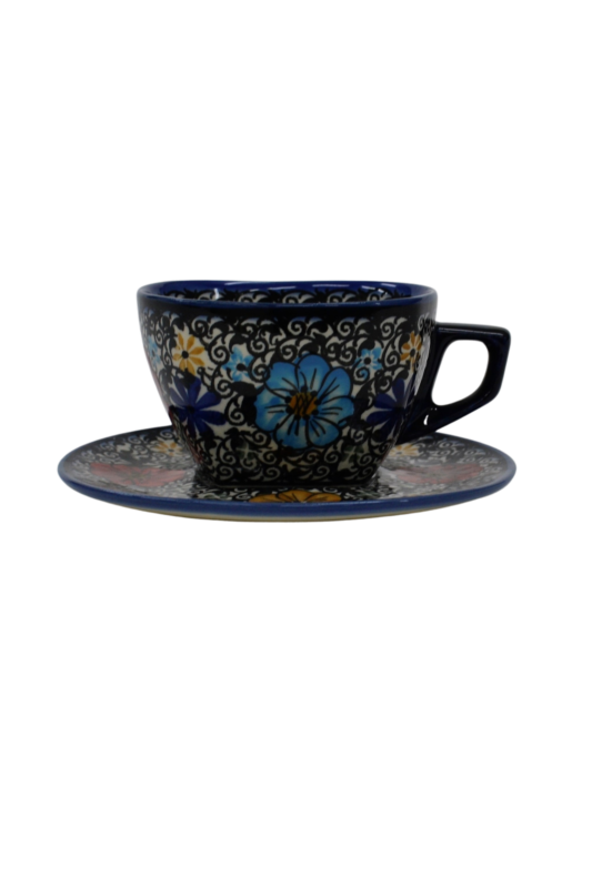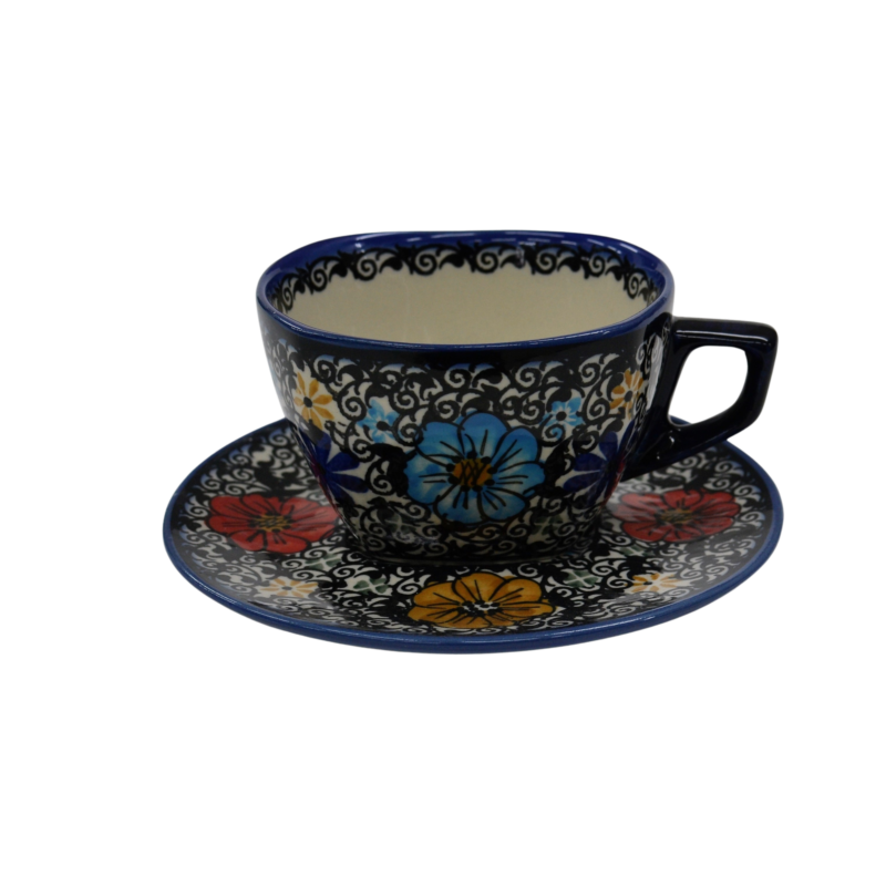 An original coffe cup from Bolesławiec with a saucer (plate). Extremely beautiful, ceramic, underglaze decorated, square cup with a ceramic saucer with a capacity of up to 300 ml.