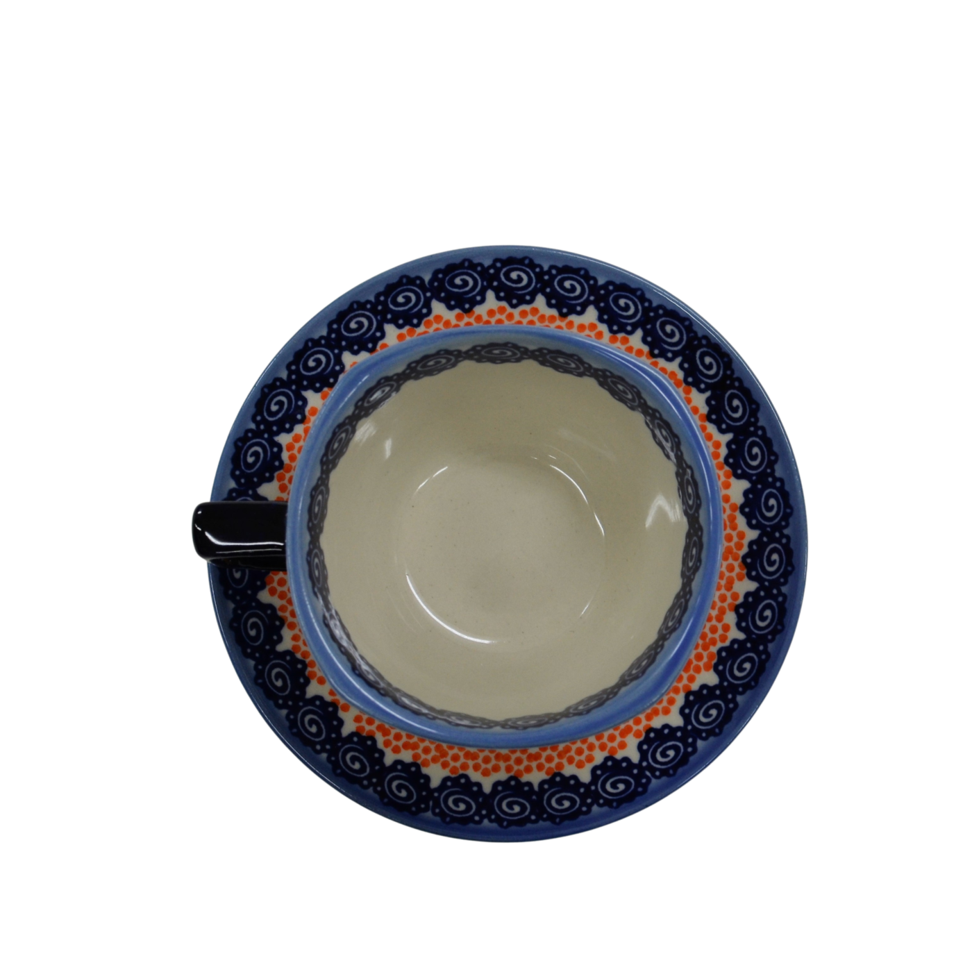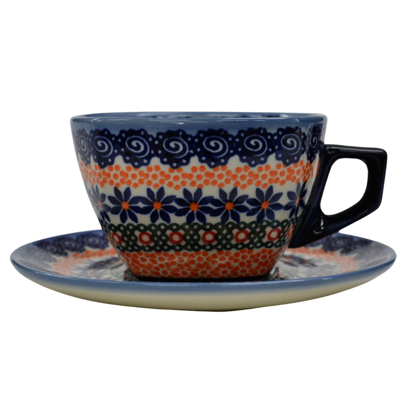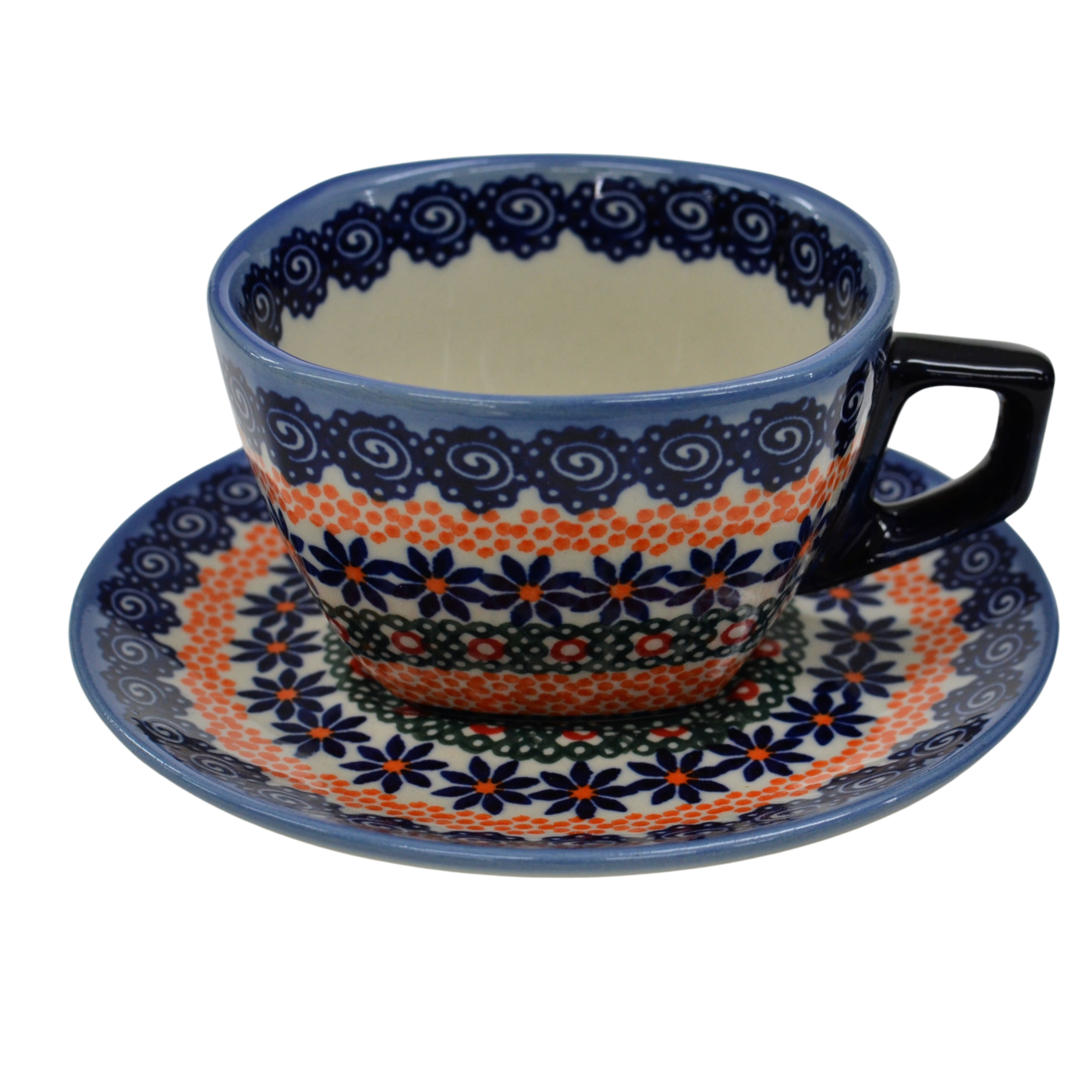 An original coffe cup from Bolesławiec with a saucer (plate). Extremely beautiful, ceramic, underglaze decorated, square cup with a ceramic saucer with a capacity of up to 300 ml.