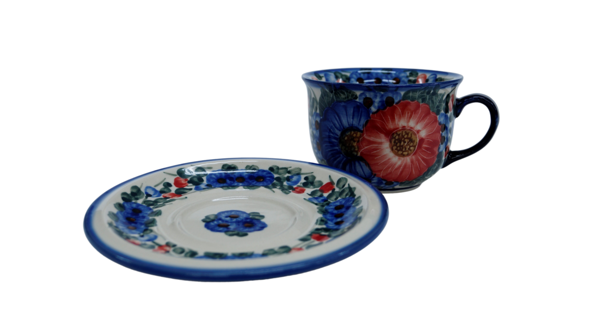A beautiful ceramic cup with a capacity of 0.3 l sold in a set with a saucer, decorated ceramic cup with beautiful patterns of Bolesławiec stoneware.