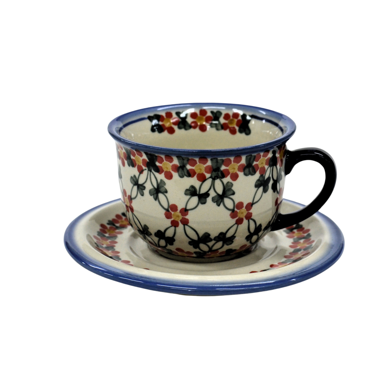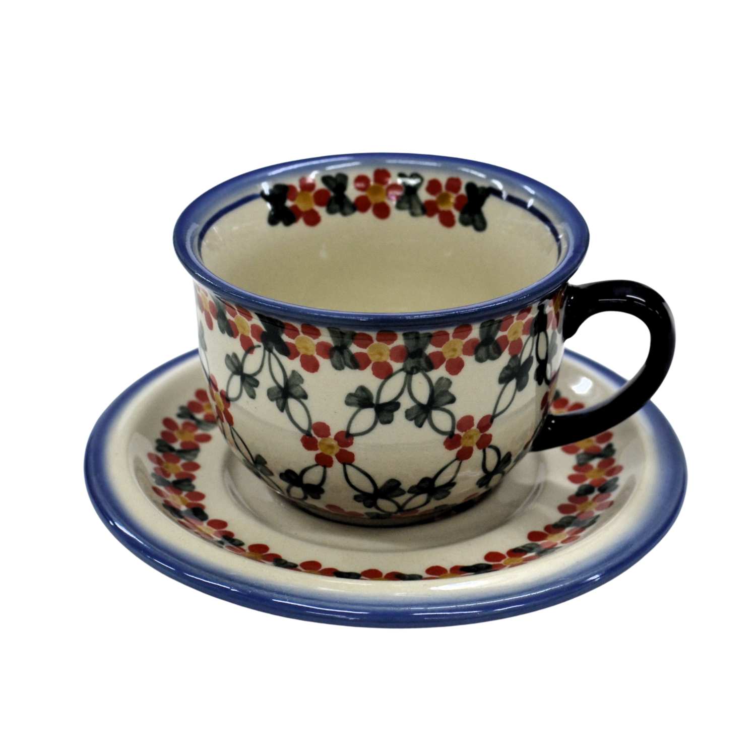 A beautiful ceramic cup with a capacity of 0.3 l sold in a set with a saucer, decorated ceramic cup with beautiful patterns of Bolesławiec stoneware.