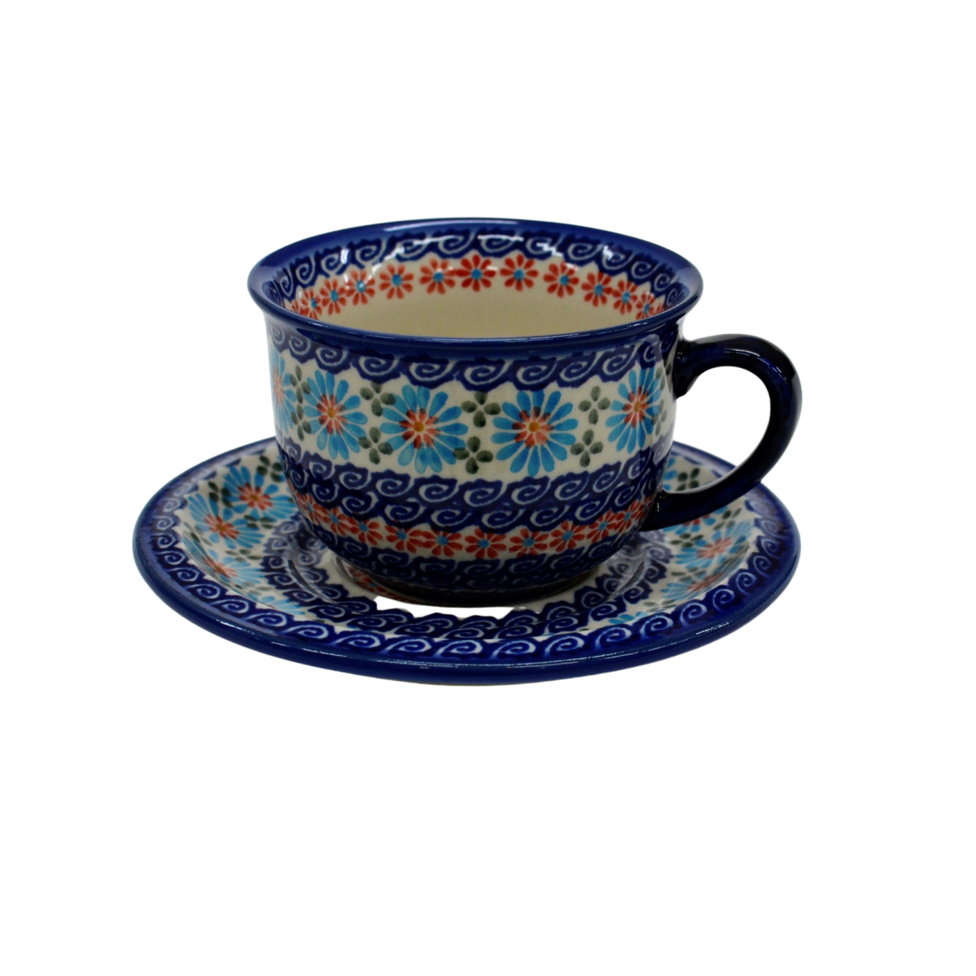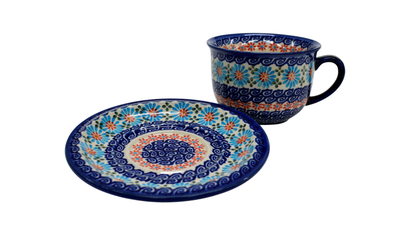 A beautiful ceramic cup with a capacity of 0.3 l sold in a set with a saucer, decorated ceramic cup with beautiful patterns of Bolesławiec stoneware.