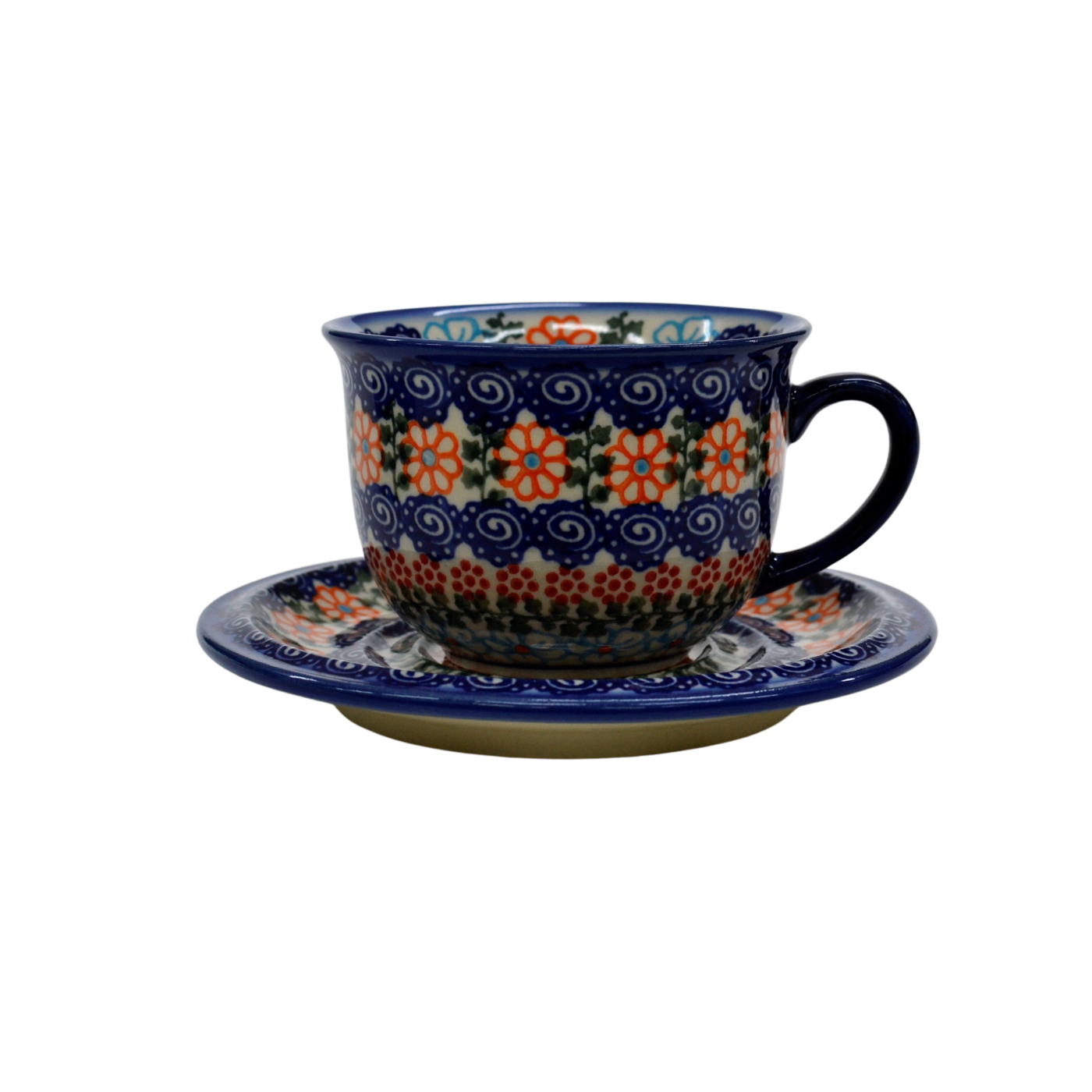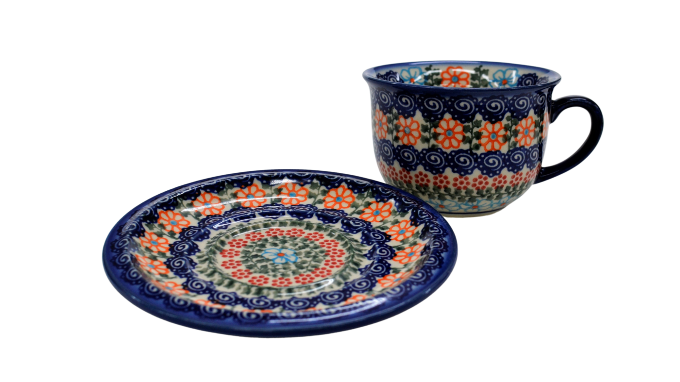 A beautiful ceramic cup with a capacity of 0.3 l sold in a set with a saucer, decorated ceramic cup with beautiful patterns of Bolesławiec stoneware.