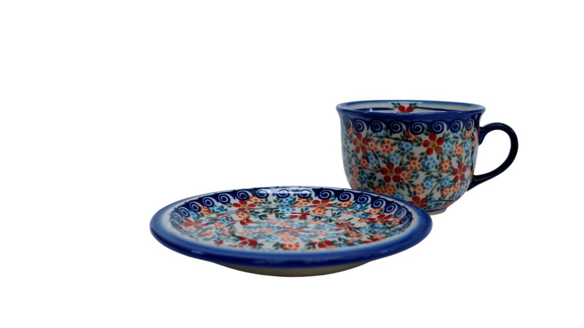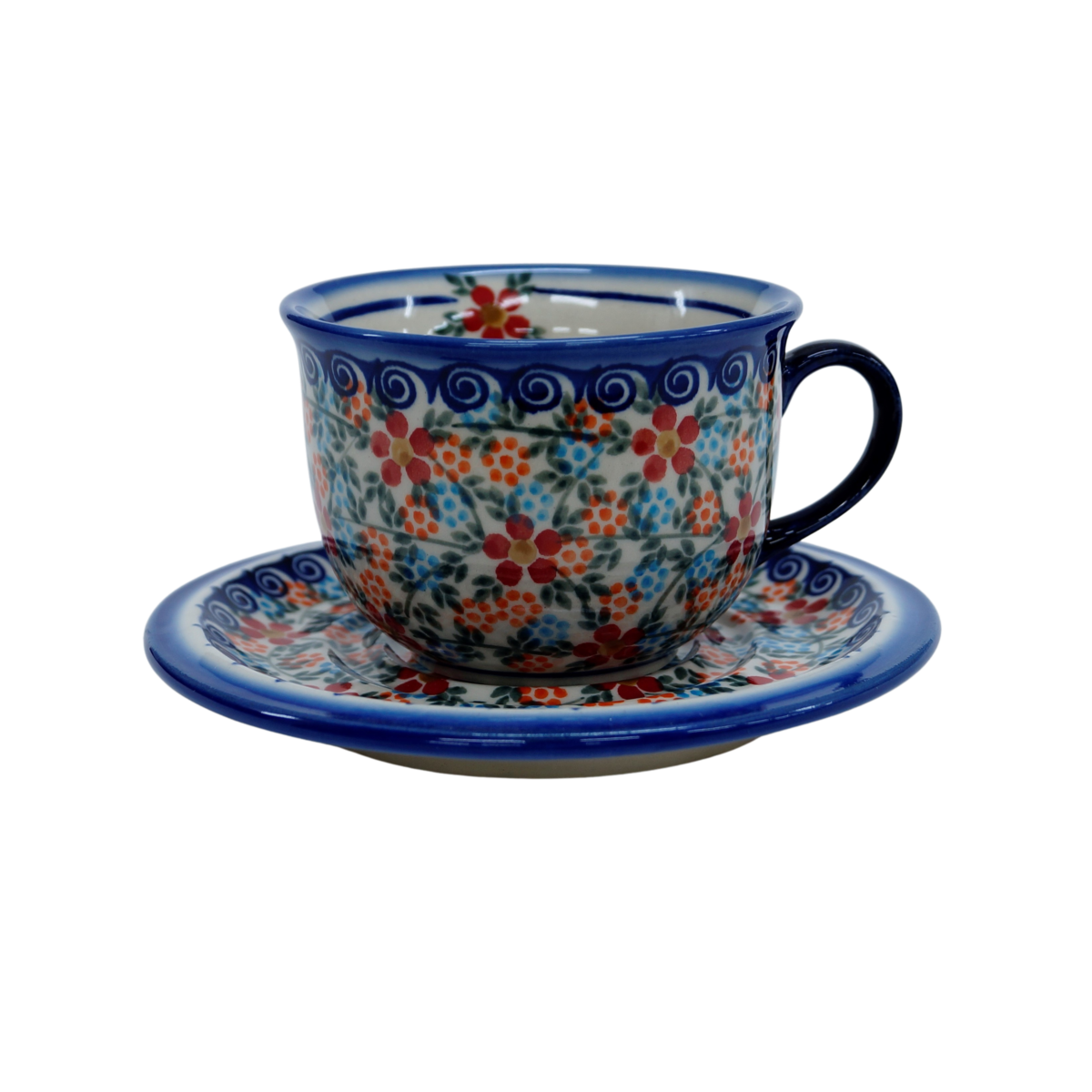 A beautiful ceramic cup with a capacity of 0.3 l sold in a set with a saucer, decorated ceramic cup with beautiful patterns of Bolesławiec stoneware.