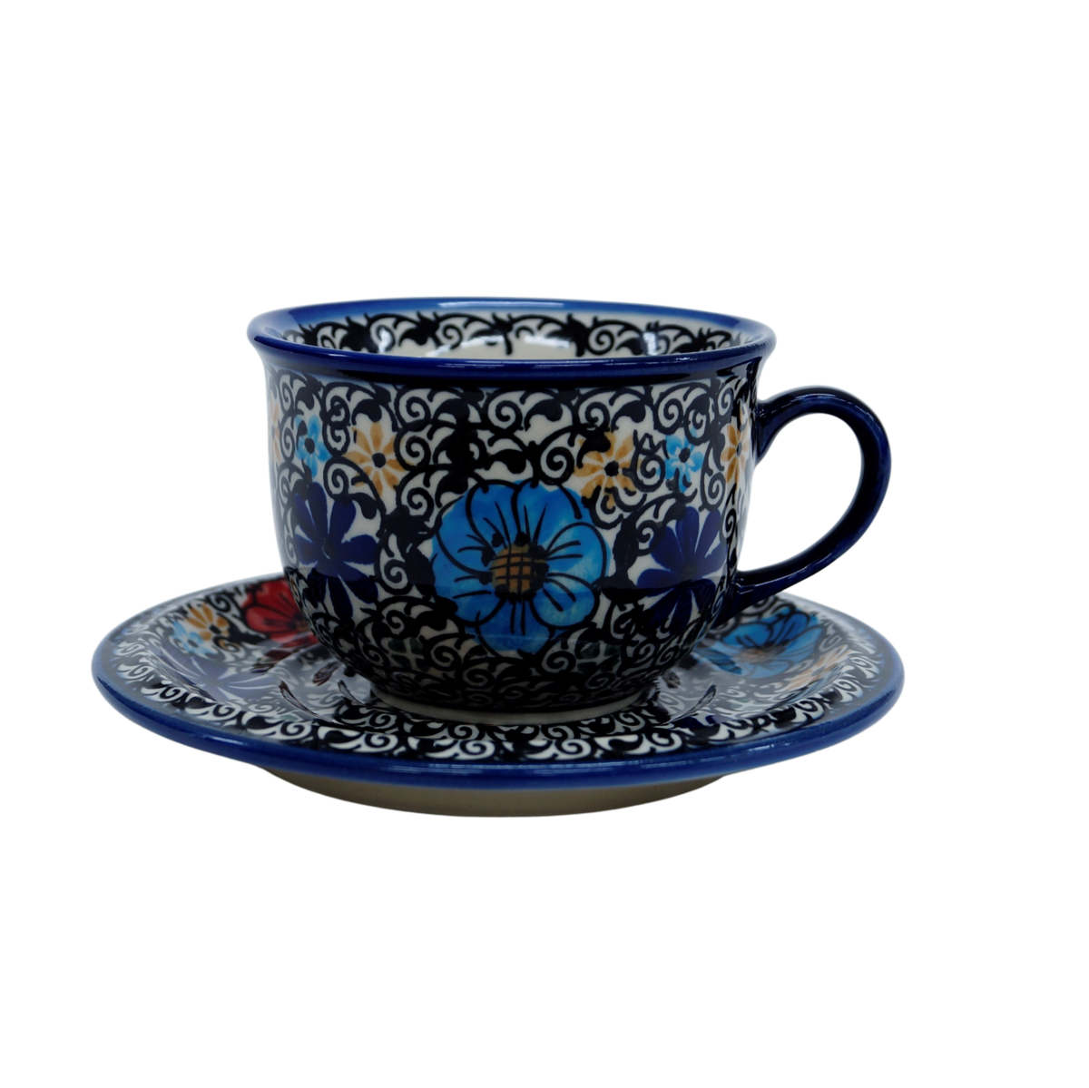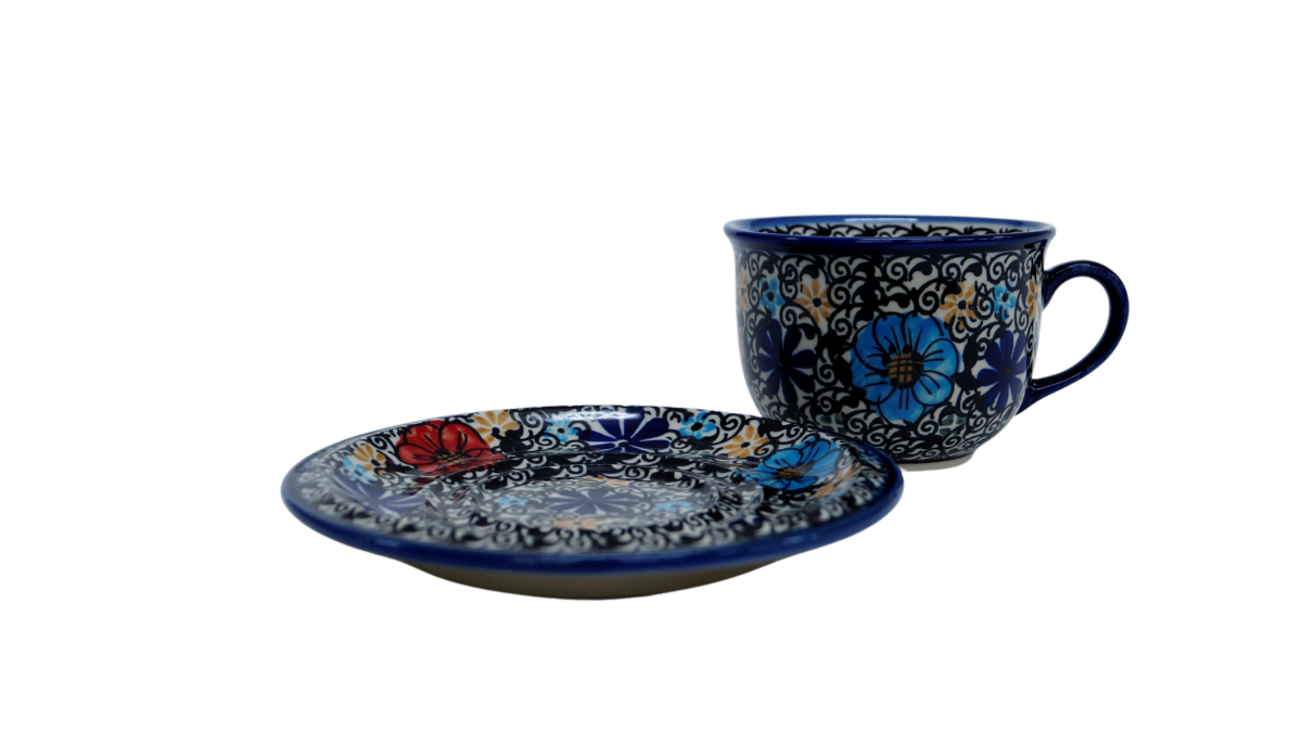 A beautiful ceramic cup with a capacity of 0.3 l sold in a set with a saucer, decorated ceramic cup with beautiful patterns of Bolesławiec stoneware.