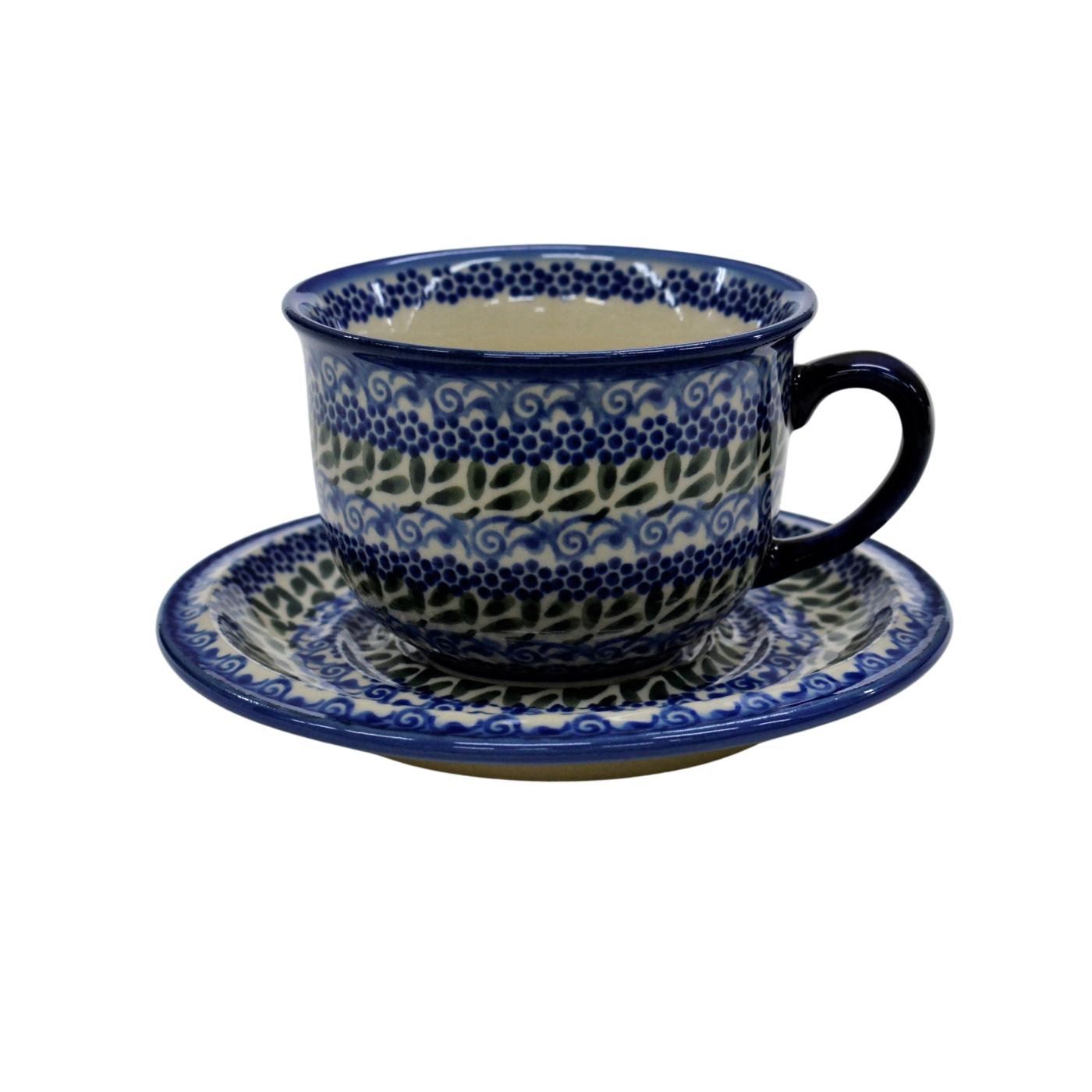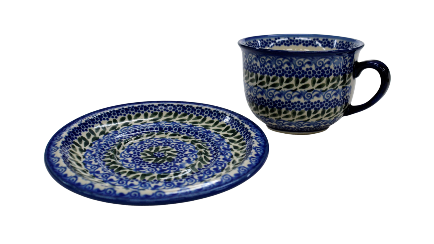 A beautiful ceramic cup with a capacity of 0.3 l sold in a set with a saucer, decorated ceramic cup with beautiful patterns of Bolesławiec stoneware.