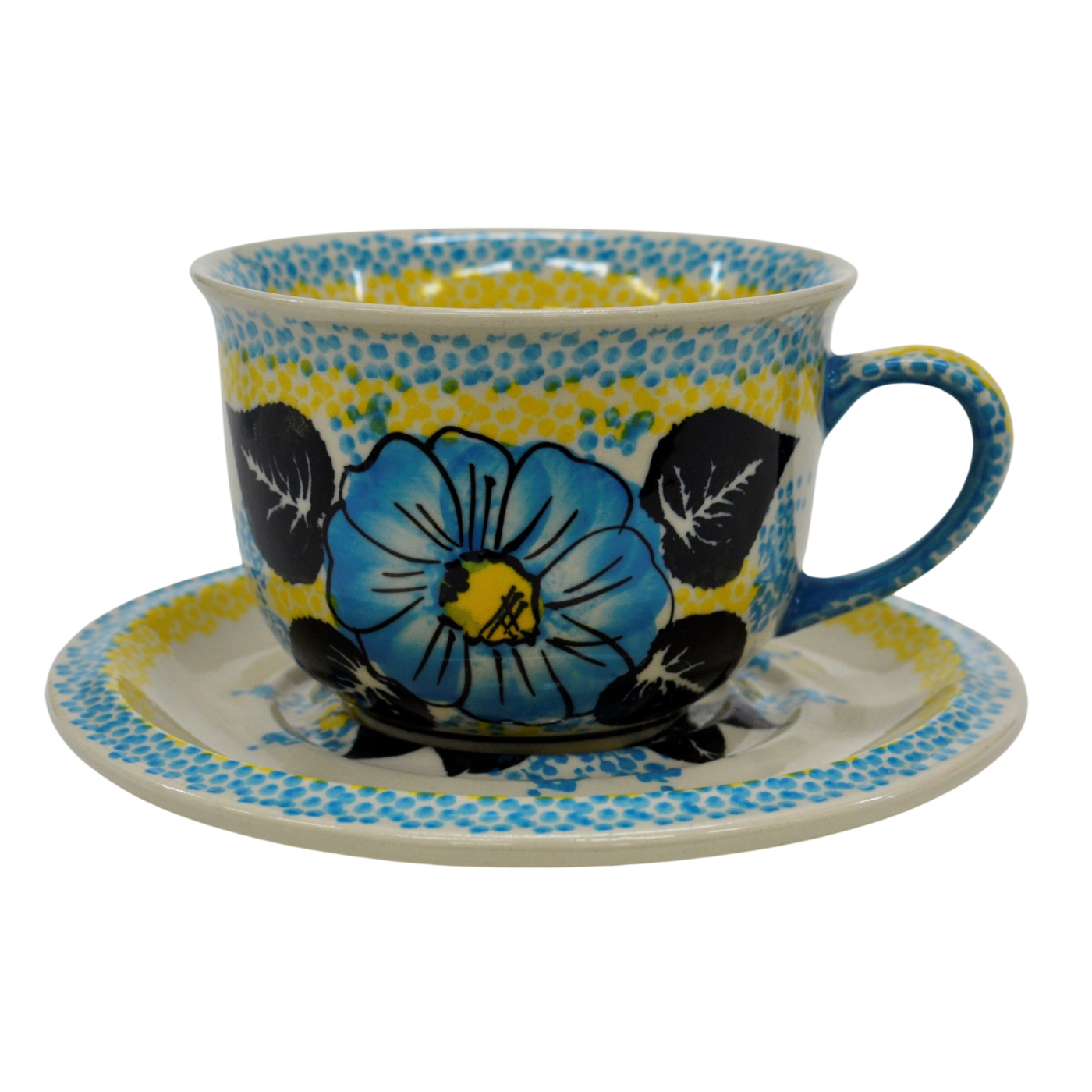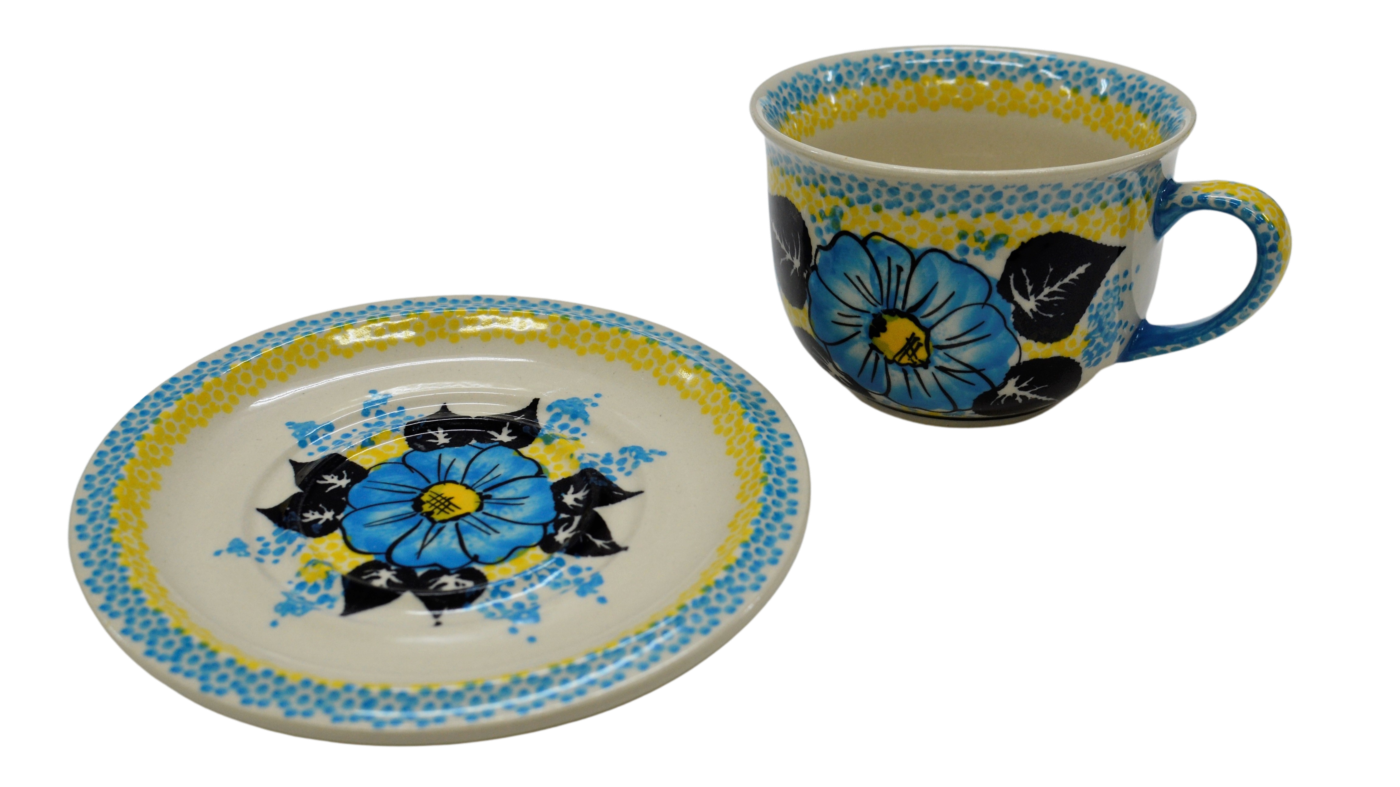 A beautiful ceramic cup with a capacity of 0.3 l sold in a set with a saucer, decorated ceramic cup with beautiful patterns of Bolesławiec stoneware.