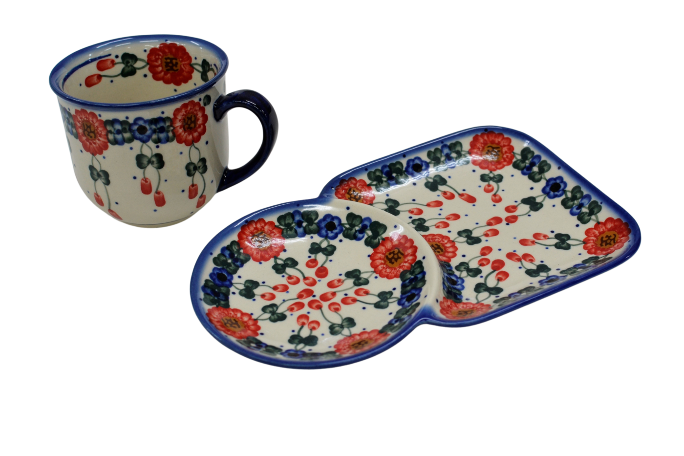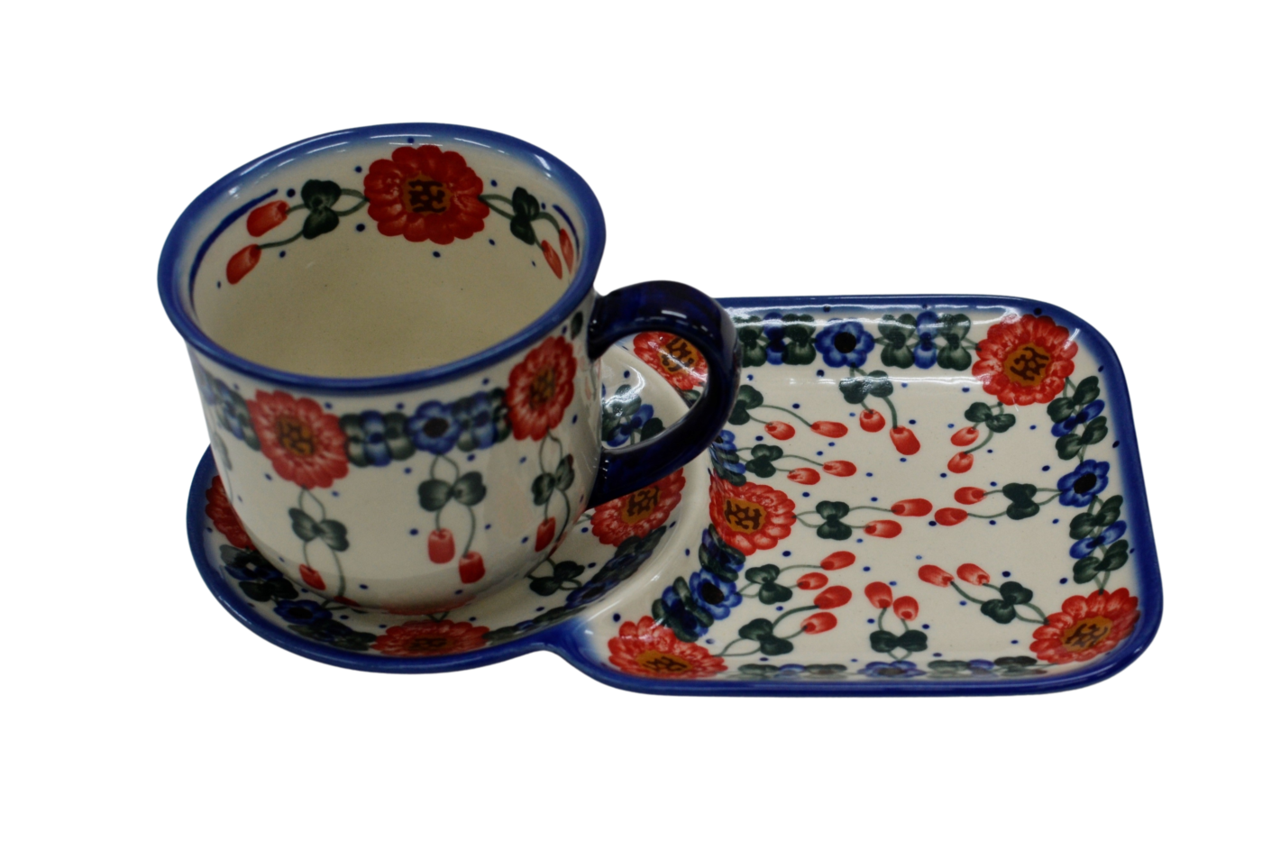 A cup with a tray form an original combination of dishes from the stoneware plant in Bolesławiec. The set is suitable for serving coffee and tea with a sandwich during breakfast or for serving your favorite drink with a sweet cookie simply from a pastry shop or home baking.