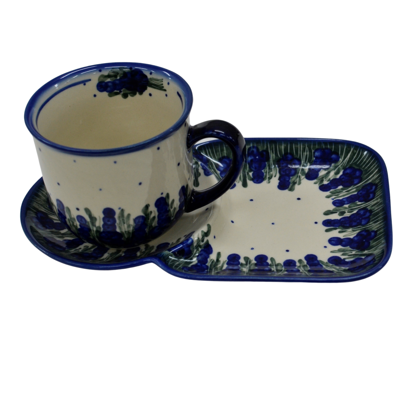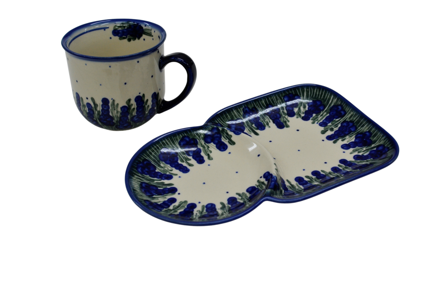 A cup with a tray form an original combination of dishes from the stoneware plant in Bolesławiec. The set is suitable for serving coffee and tea with a sandwich during breakfast or for serving your favorite drink with a sweet cookie simply from a pastry shop or home baking.