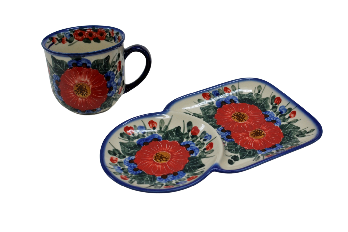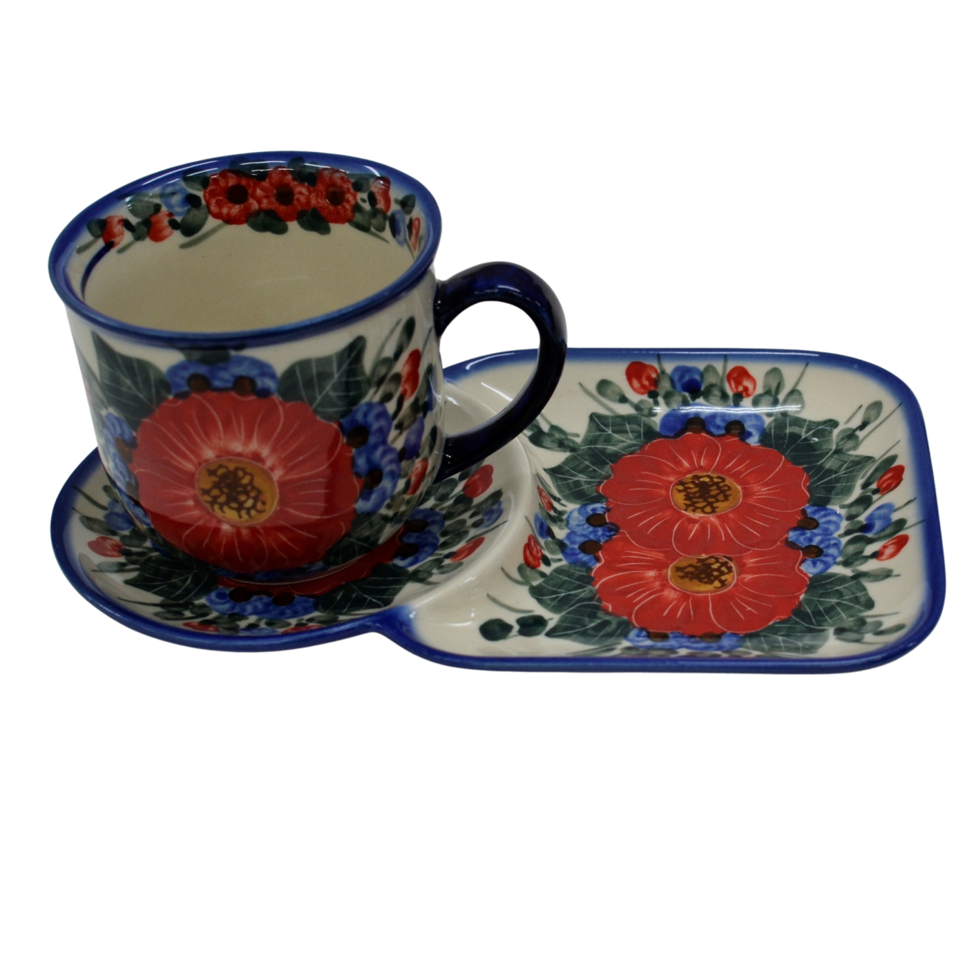A cup with a tray form an original combination of dishes from the stoneware plant in Bolesławiec. The set is suitable for serving coffee and tea with a sandwich during breakfast or for serving your favorite drink with a sweet cookie simply from a pastry shop or home baking.