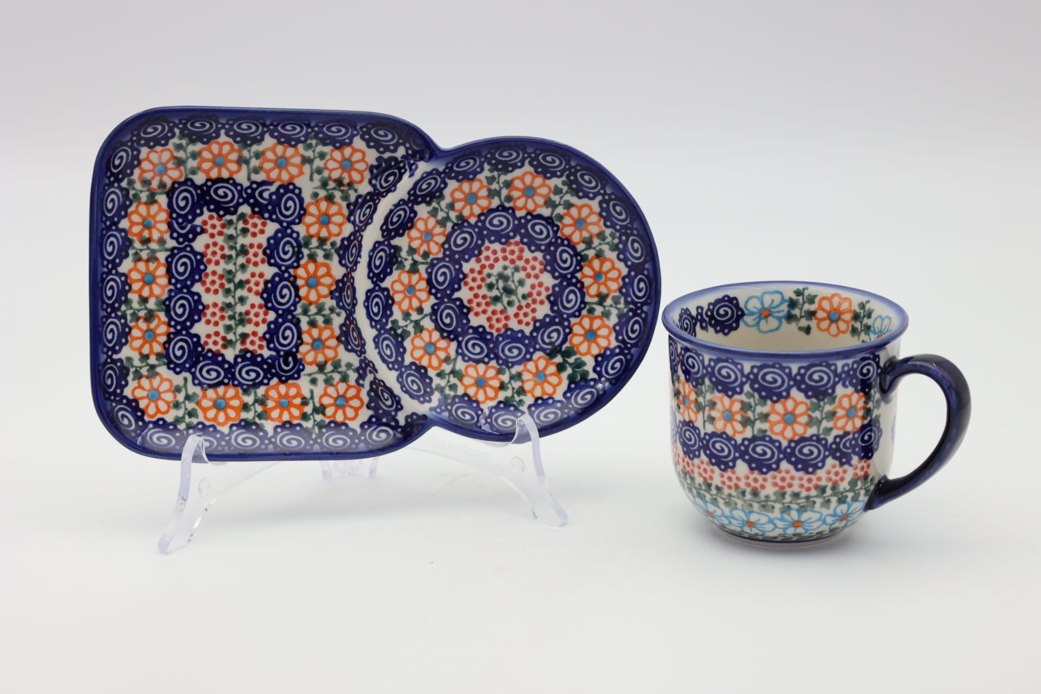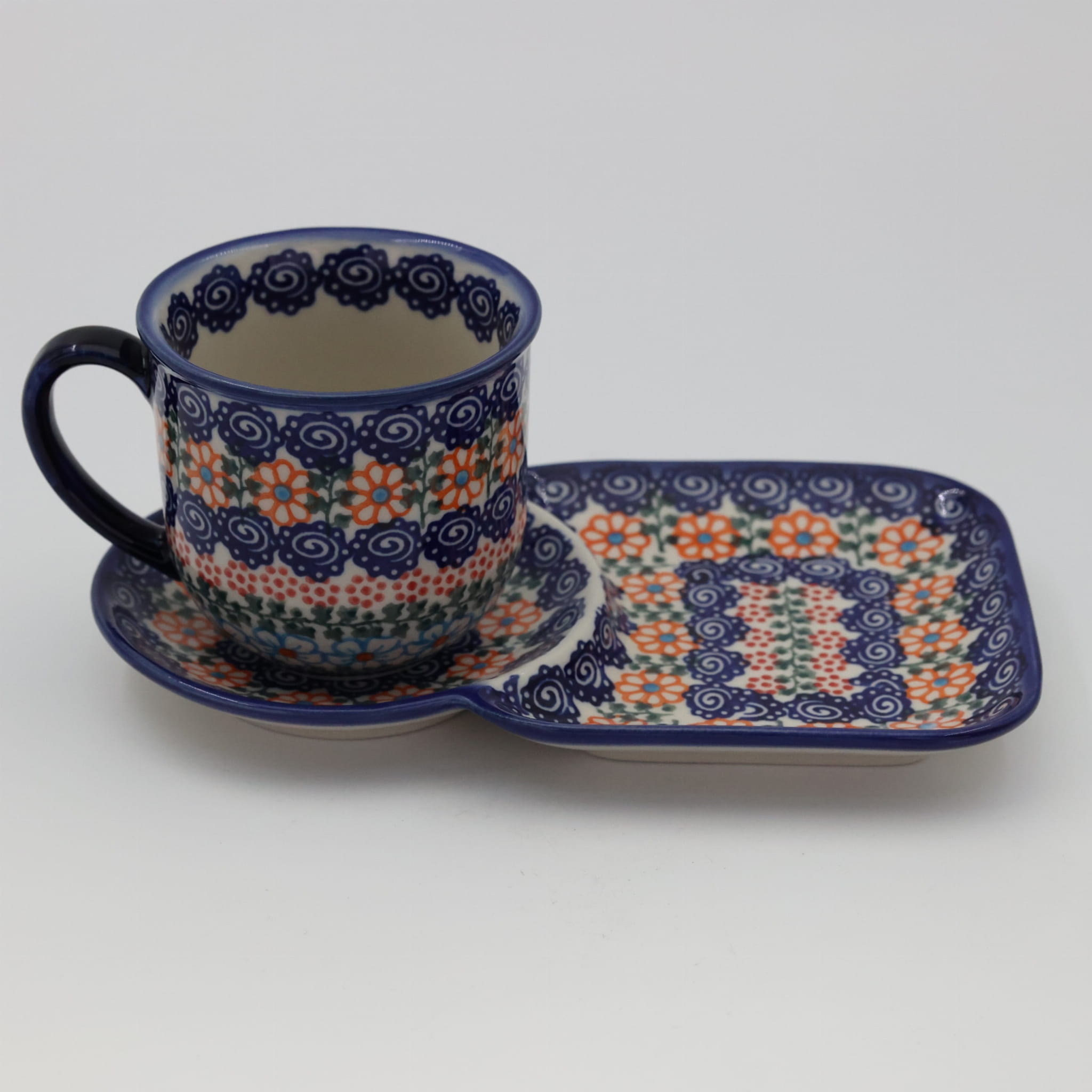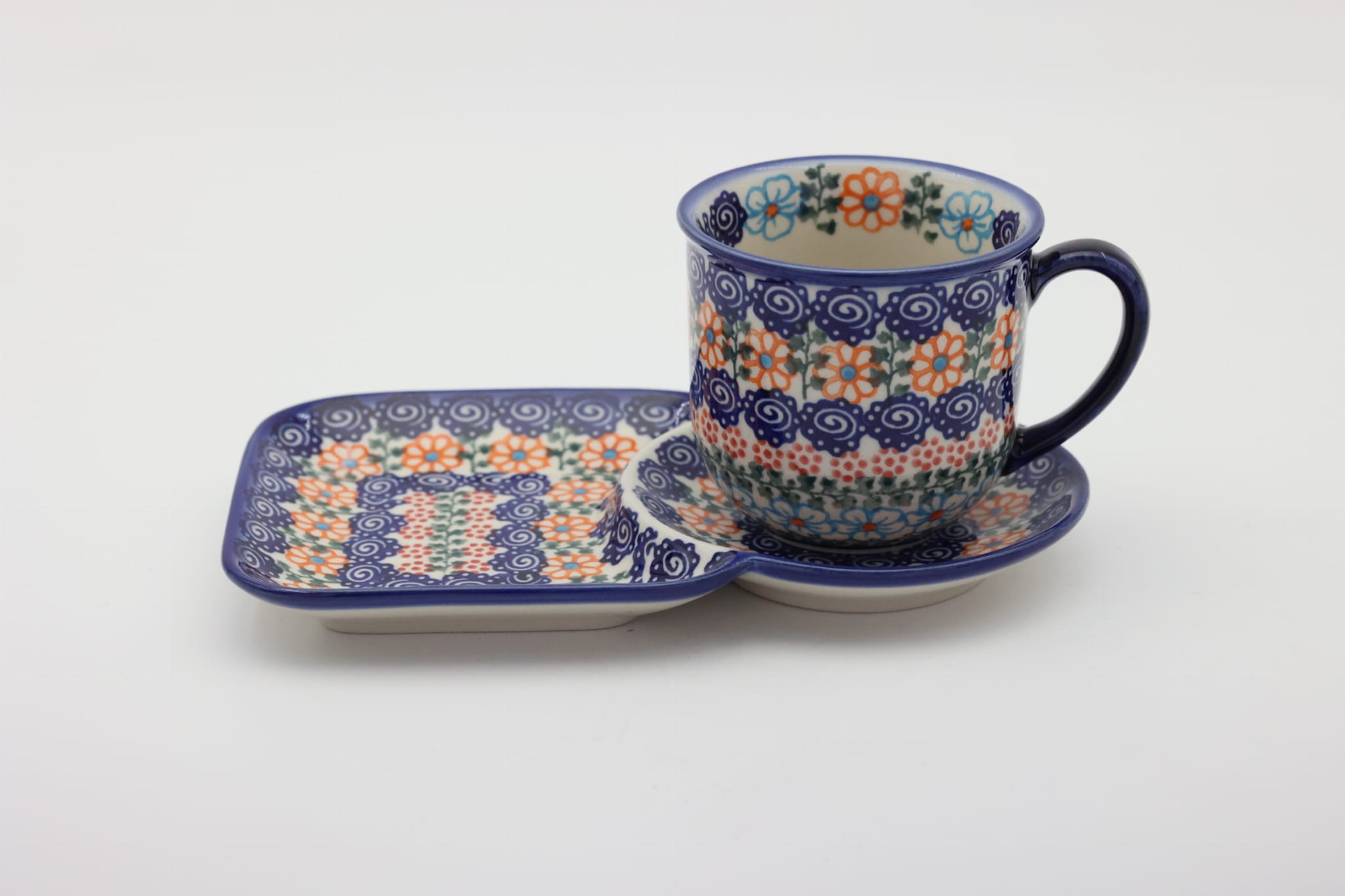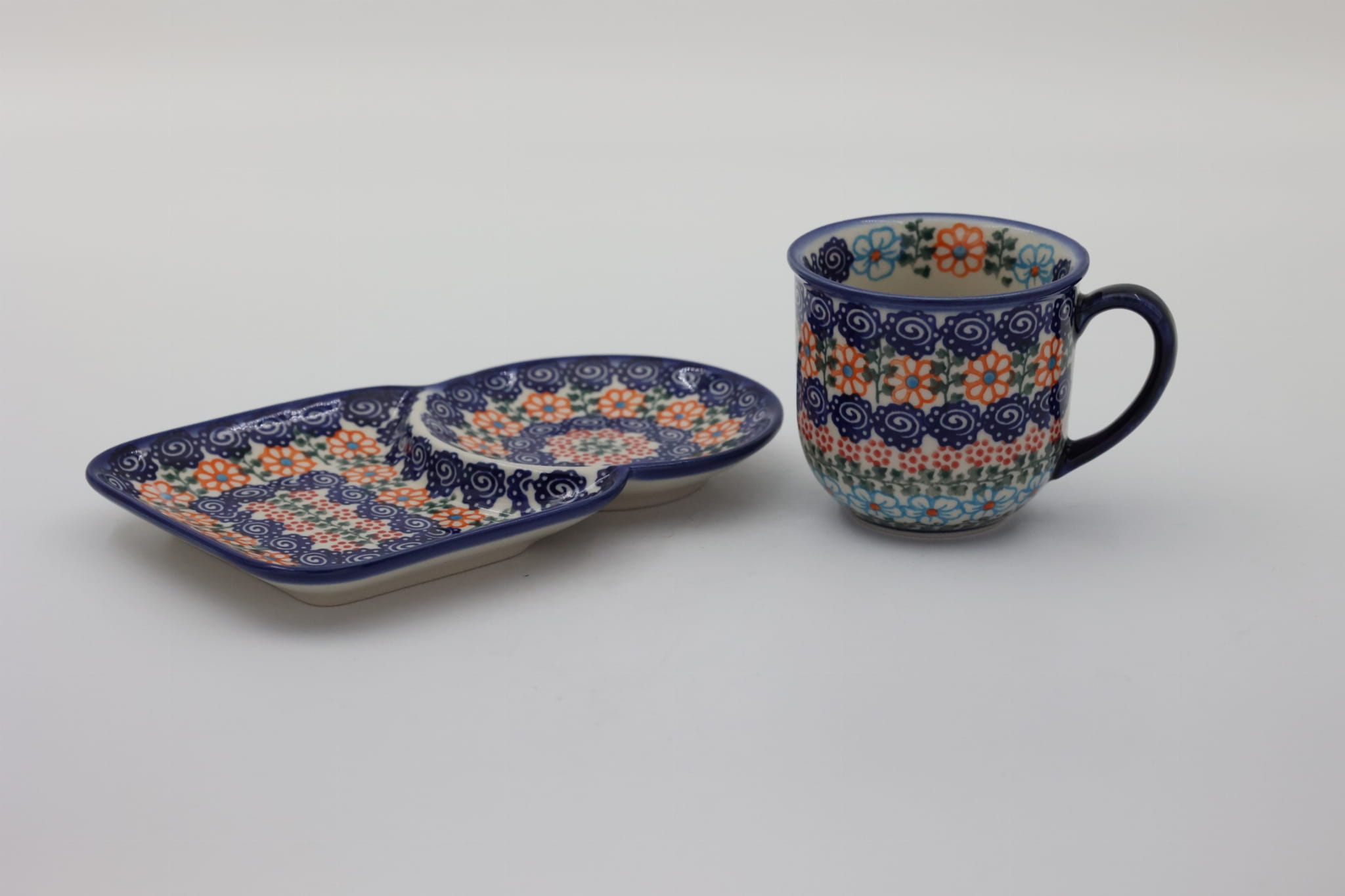 A cup with a tray form an original combination of dishes from the stoneware plant in Bolesławiec. The set is suitable for serving coffee and tea with a sandwich during breakfast or for serving your favorite drink with a sweet cookie simply from a pastry shop or home baking.