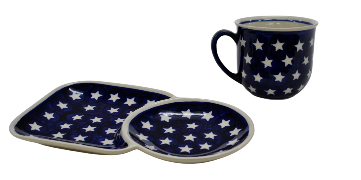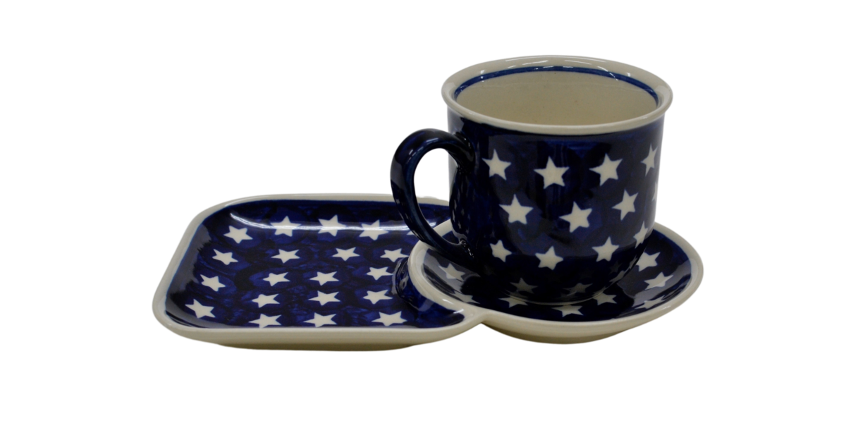 A cup with a tray form an original combination of dishes from the stoneware plant in Bolesławiec. The set is suitable for serving coffee and tea with a sandwich during breakfast or for serving your favorite drink with a sweet cookie simply from a pastry shop or home baking.