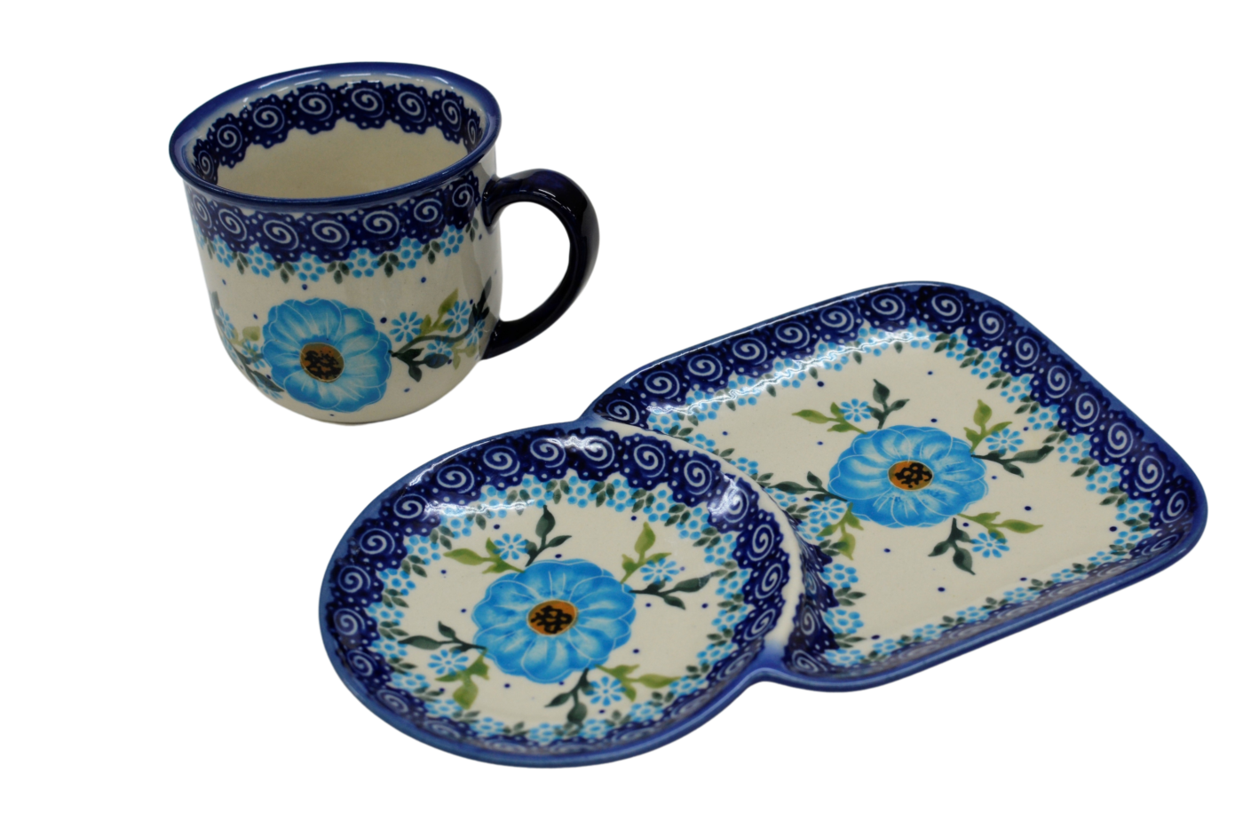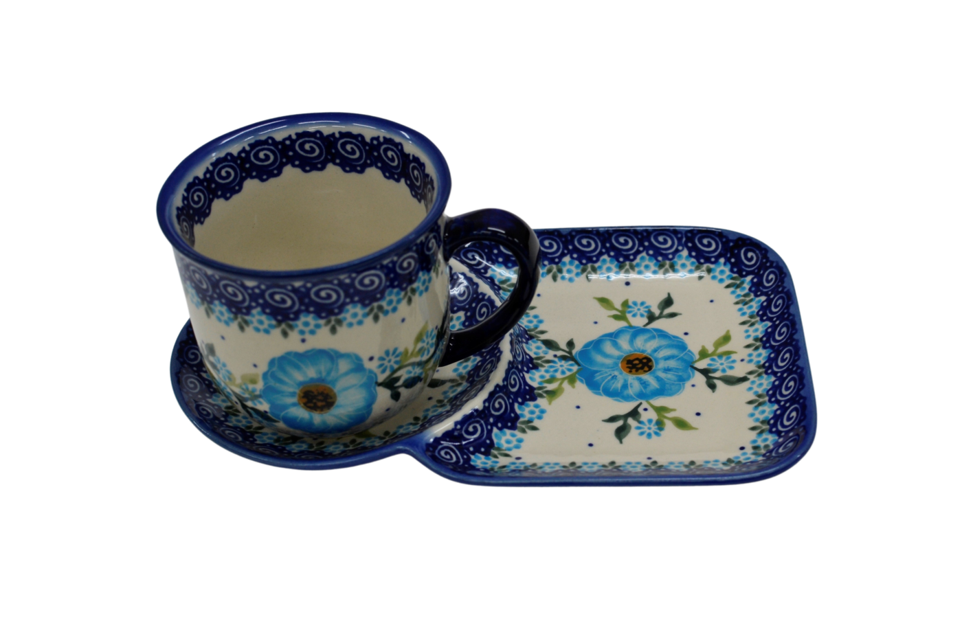 A cup with a tray form an original combination of dishes from the stoneware plant in Bolesławiec. The set is suitable for serving coffee and tea with a sandwich during breakfast or for serving your favorite drink with a sweet cookie simply from a pastry shop or home baking.