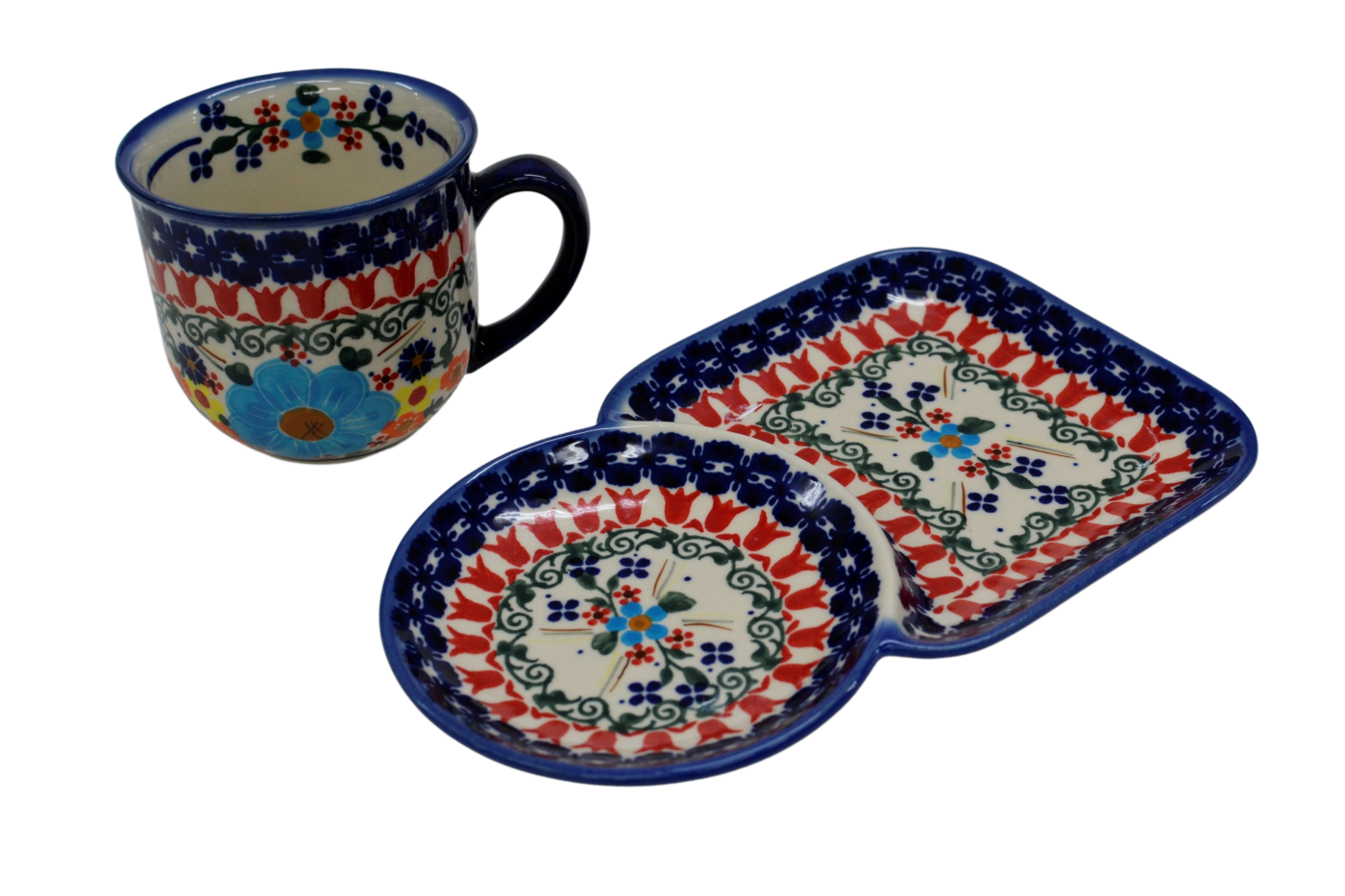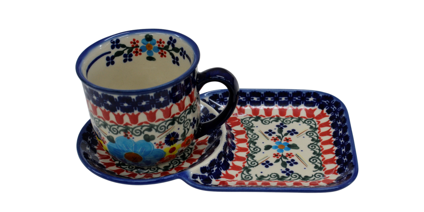 A cup with a tray form an original combination of dishes from the stoneware plant in Bolesławiec. The set is suitable for serving coffee and tea with a sandwich during breakfast or for serving your favorite drink with a sweet cookie simply from a pastry shop or home baking.