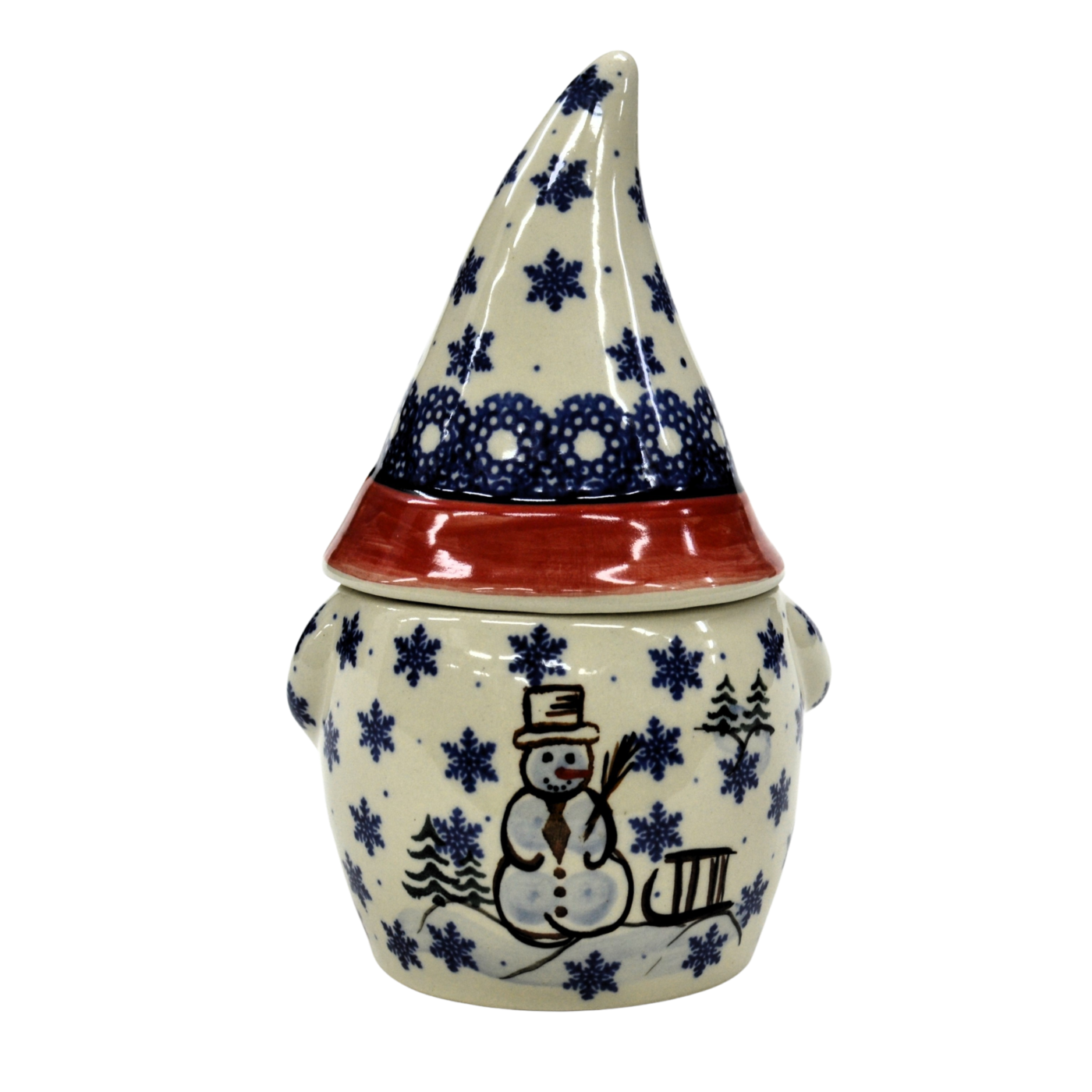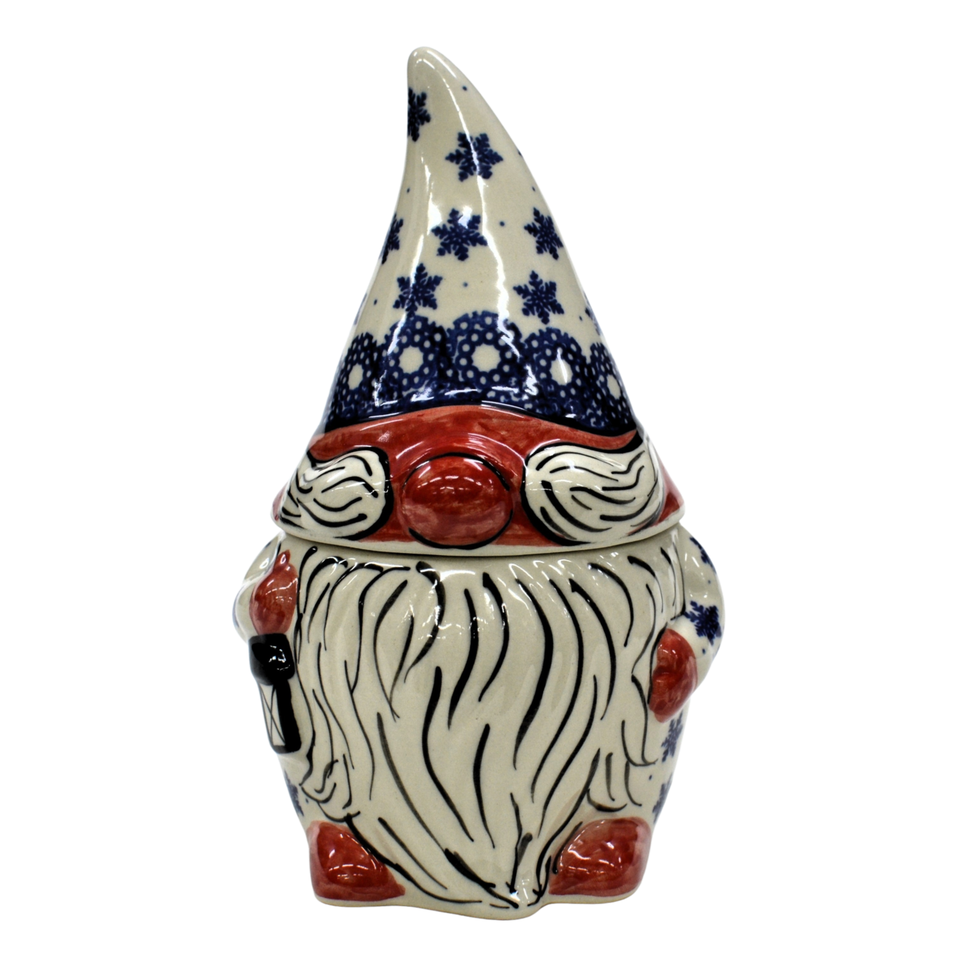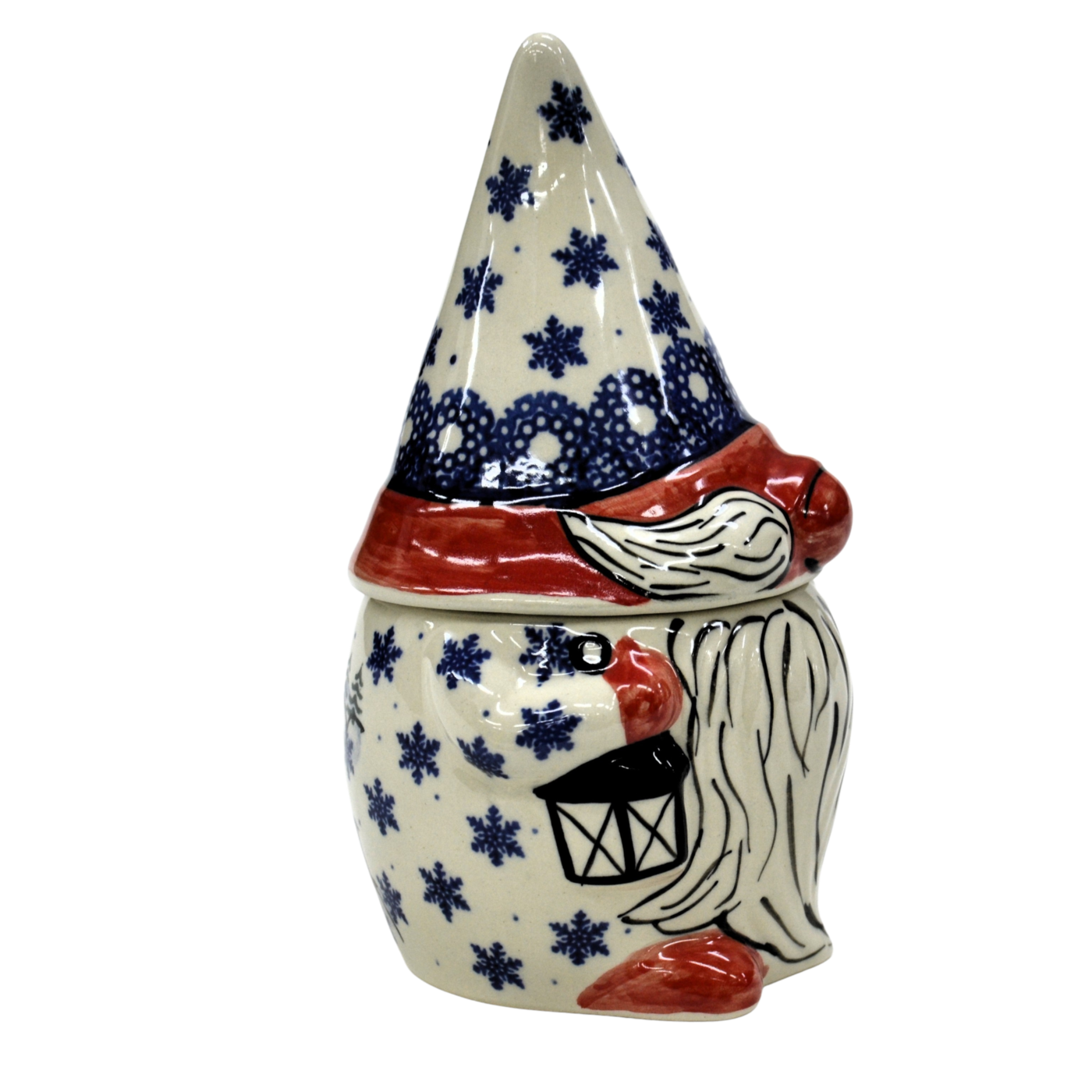 A ceramic container in the shape of a Dwarf, a gnome with a ceramic lid.