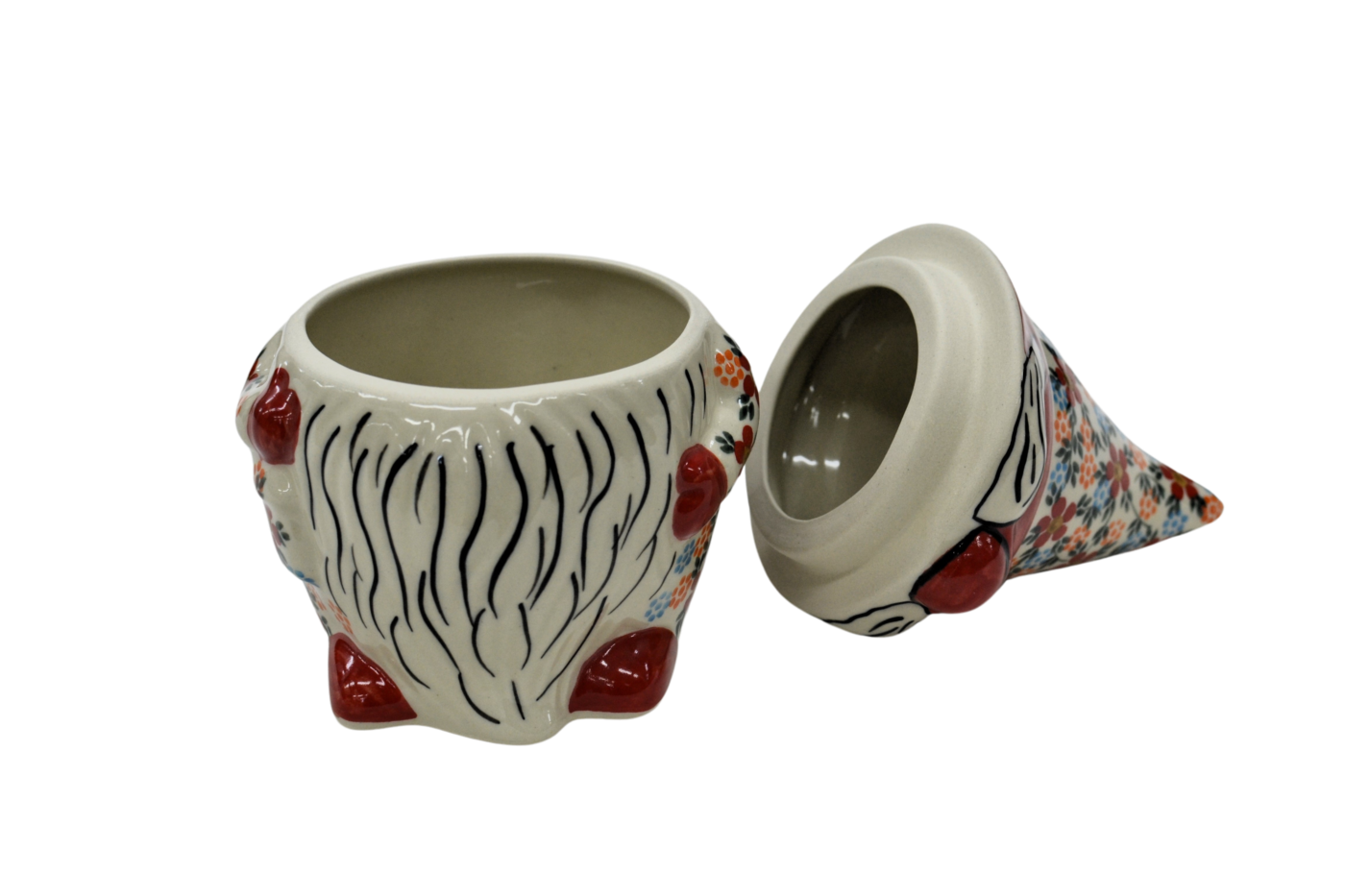 A ceramic container in the shape of a Dwarf, a gnome with a ceramic lid.