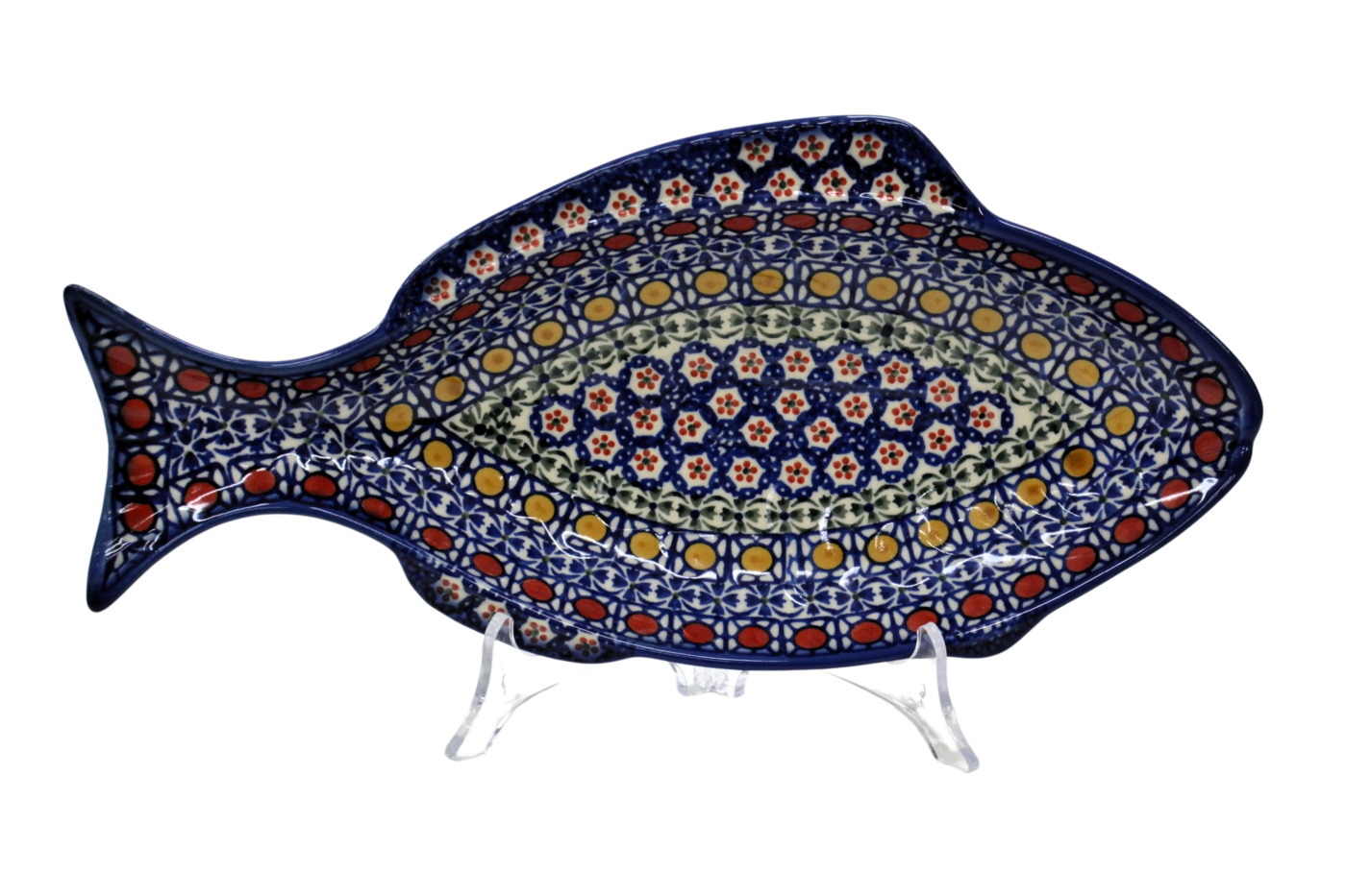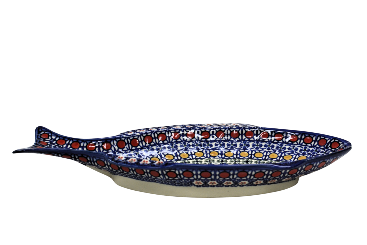 A ceramic platter from Bolesławiec for baking fish, hand-painted with unique patterns and stamp decorations. Fish-shaped dish for baking and serving fish.