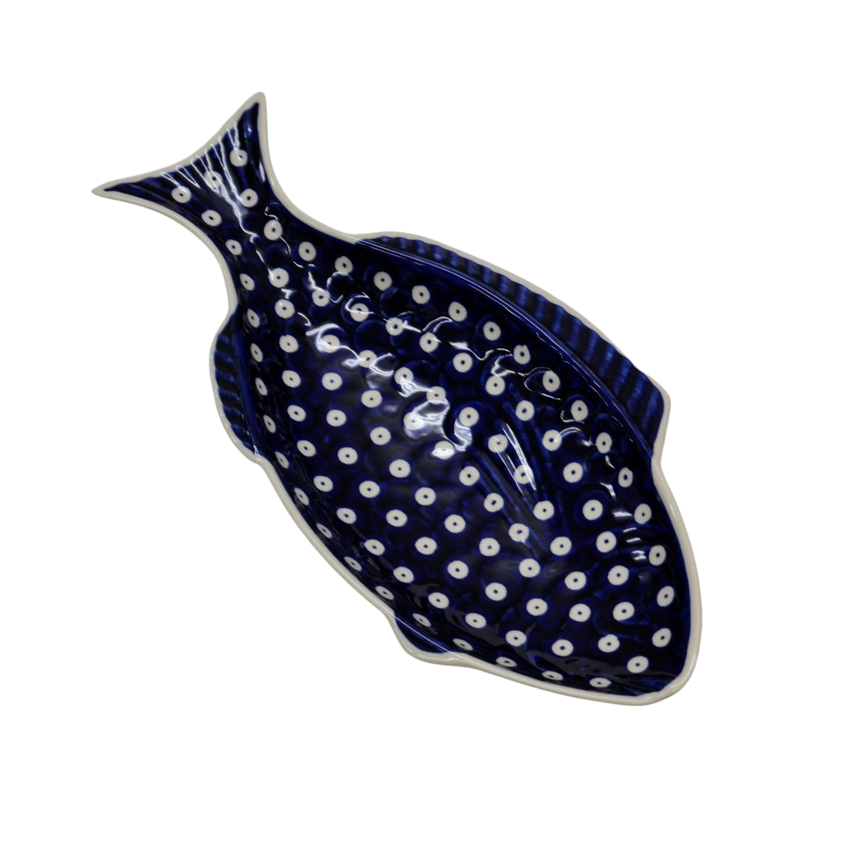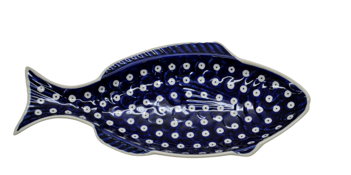 A ceramic platter from Bolesławiec for baking fish, hand-painted with unique patterns and stamp decorations. Fish-shaped dish for baking and serving fish.