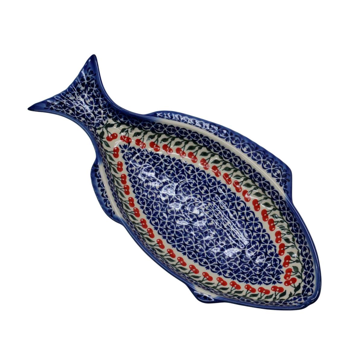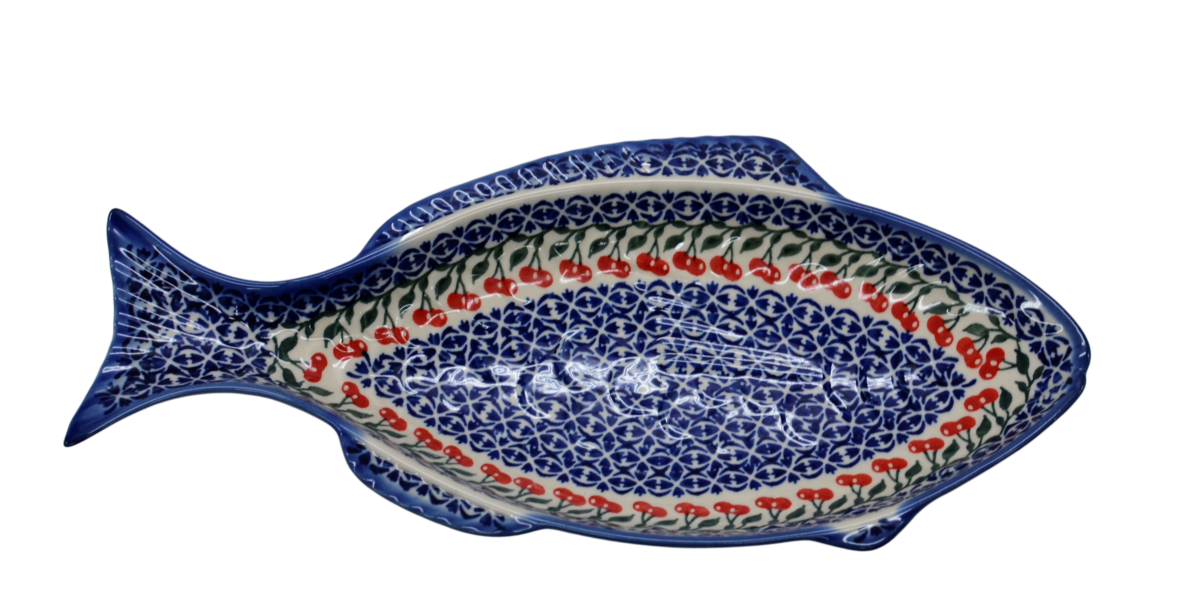 A ceramic platter from Bolesławiec for baking fish, hand-painted with unique patterns and stamp decorations. Fish-shaped dish for baking and serving fish.