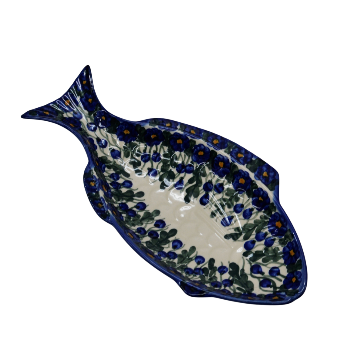 A ceramic platter from Bolesławiec for baking fish, hand-painted with unique patterns and stamp decorations. Fish-shaped dish for baking and serving fish.