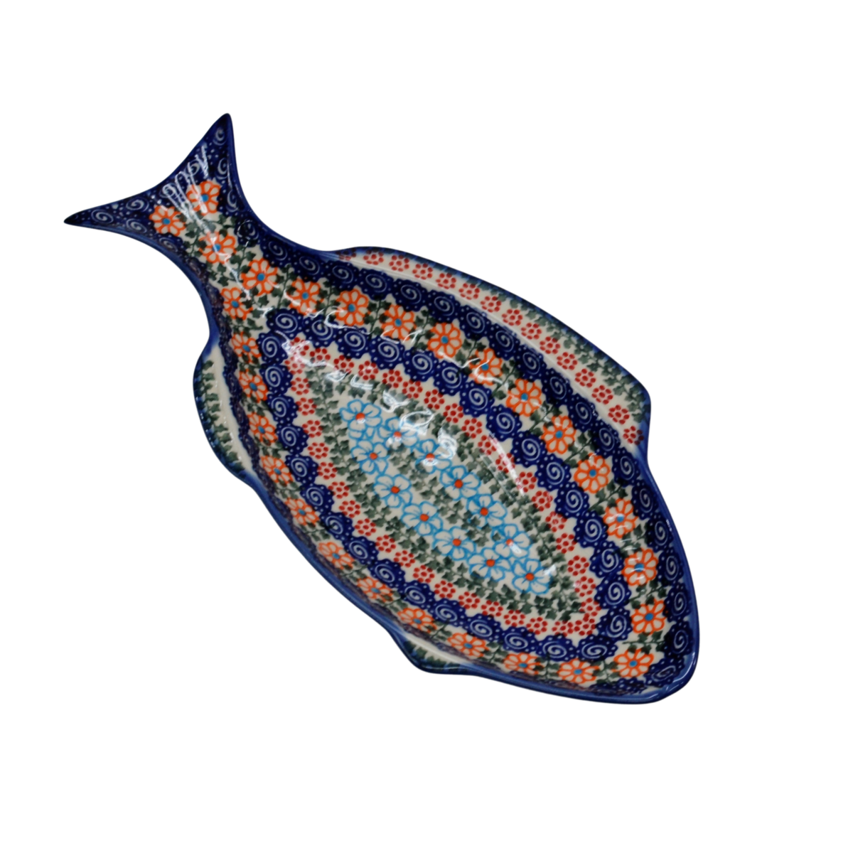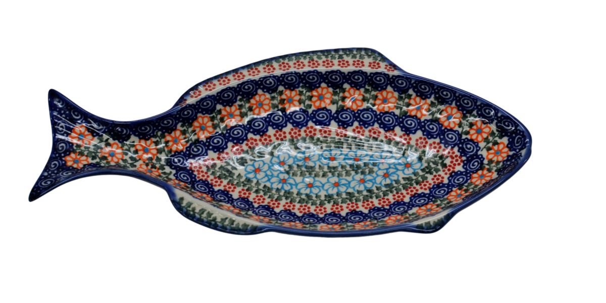 A ceramic platter from Bolesławiec for baking fish, hand-painted with unique patterns and stamp decorations. Fish-shaped dish for baking and serving fish.