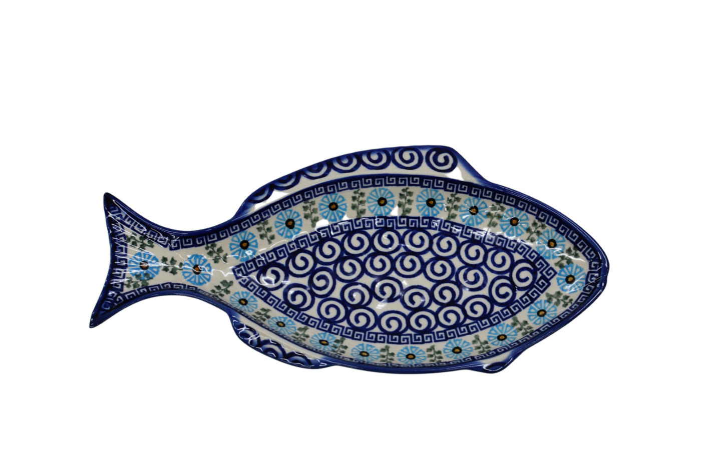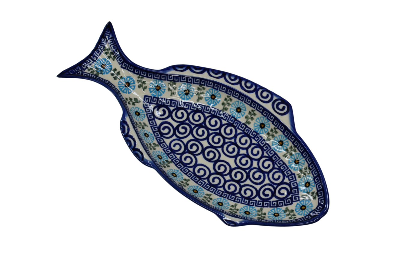 A ceramic platter from Bolesławiec for baking fish, hand-painted with unique patterns and stamp decorations. Fish-shaped dish for baking and serving fish.