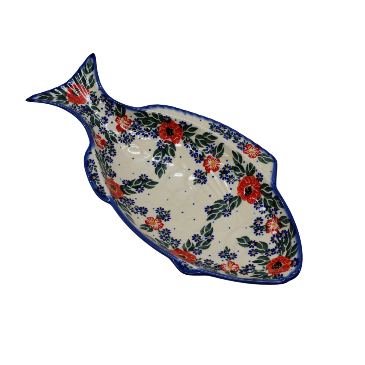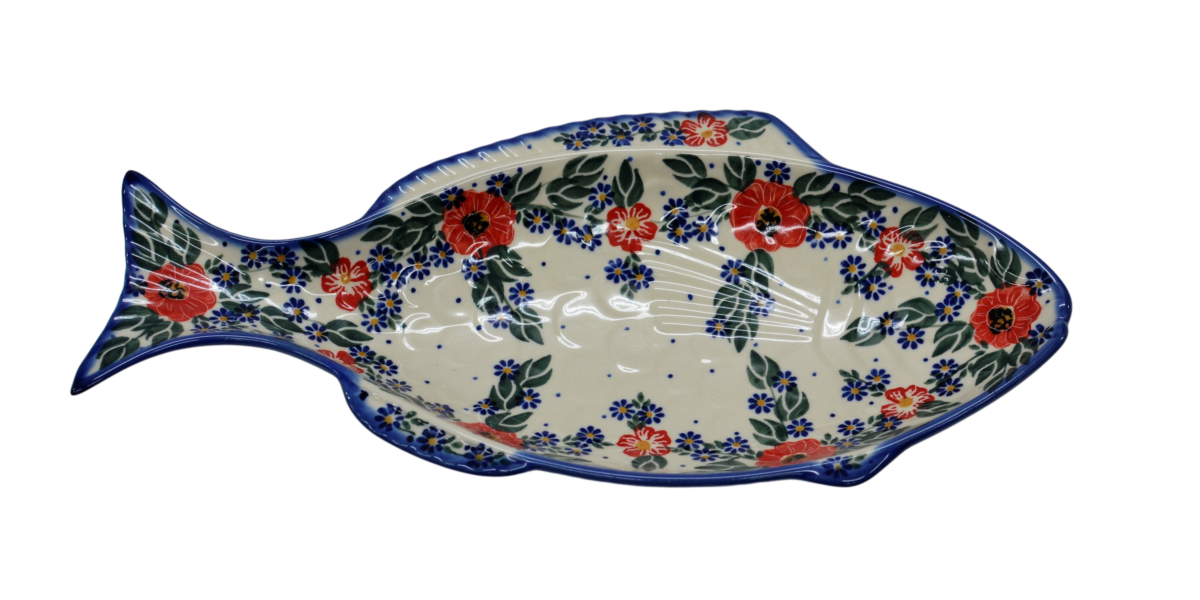 A ceramic platter from Bolesławiec for baking fish, hand-painted with unique patterns and stamp decorations. Fish-shaped dish for baking and serving fish.